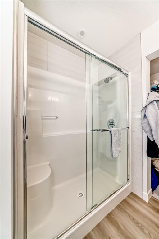 The primary bedroom features a walk in closet, and a spa inspired ensuite with dual vanities and a glass stand up shower. The second bedroom sits conveniently next to the full main bathroom, making it ideal for guests, a home office, or a flex space.
