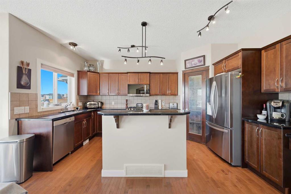 The builder-finished walkout basement adds exceptional flexibility with a large bedroom, full bathroom, expansive recreation and media area, and a bar with 220V electrical and plumbing rough-ins for a future kitchen, offering excellent potential for multi-generational living. The walkout level opens to an exposed aggregate concrete patio with BBQ gas line and hot tub electrical connection, overlooking the landscaped yard with pond and pathway views. Recent improvements include a new roof in 2022 as well as AC in 2025.