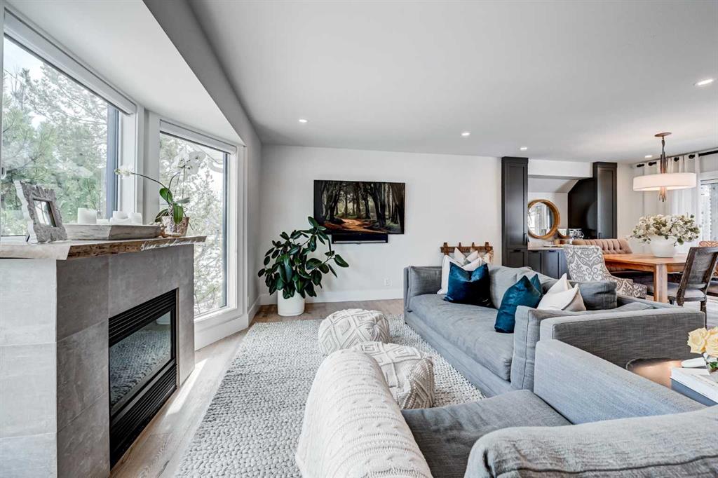 The main level is centered around a bright open-concept living, kitchen, and dining space, where large windows and a gas fireplace create a warm and inviting atmosphere filled with natural light.