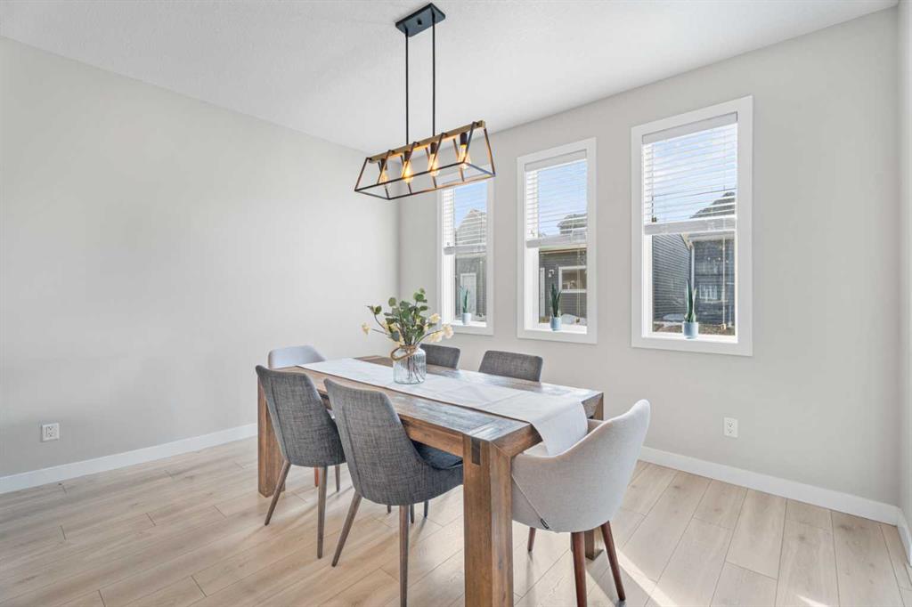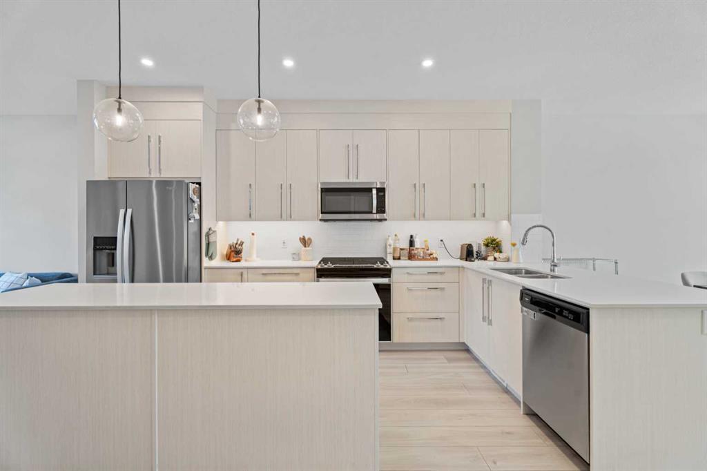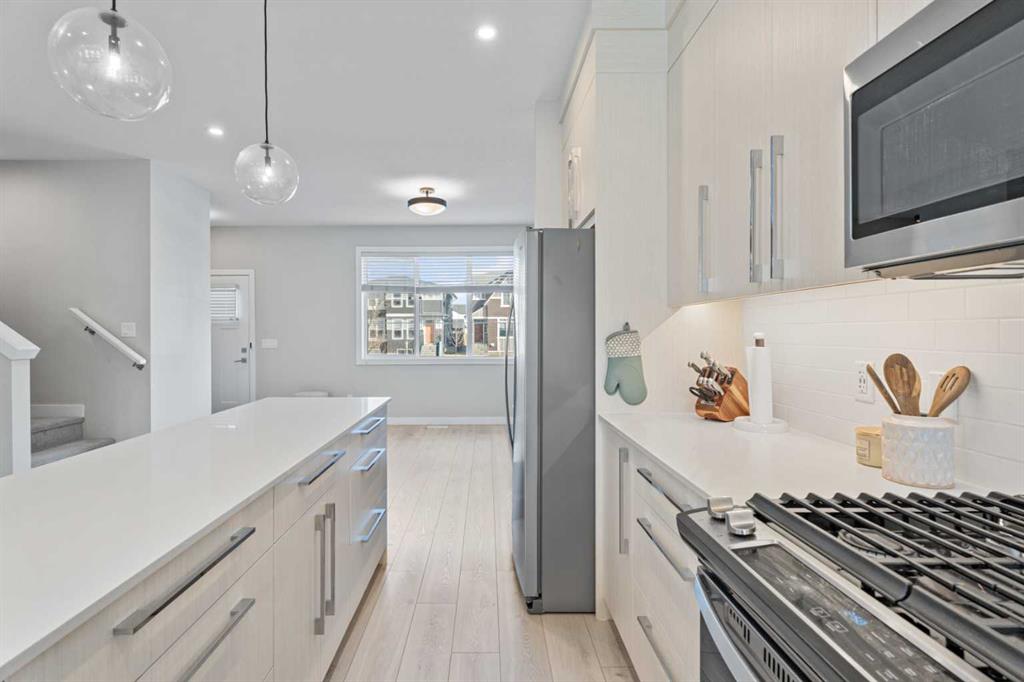The main floor offers an open and functional layout with 9’ ceilings. The kitchen features full-height cabinetry, soft-close doors and drawers, quartz countertops, and a stainless steel appliance package including a gas stove. Durable Luxury Vinyl Plank flooring runs throughout the main level.