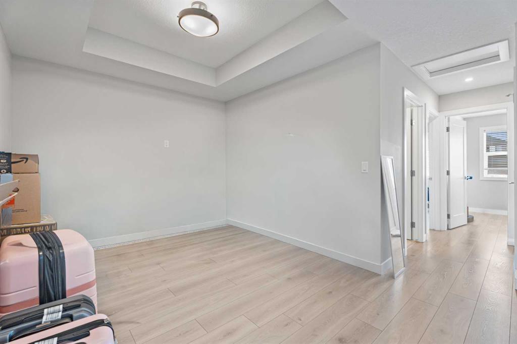 Upstairs, the primary bedroom features a tray ceiling, walk-in closet, and a spacious 5-piece ensuite. A central bonus room with tray ceiling separates the primary suite from the two additional bedrooms, creating privacy and flexible living space. The upper level also includes convenient laundry with washer and dryer and a 4-piece bathroom.