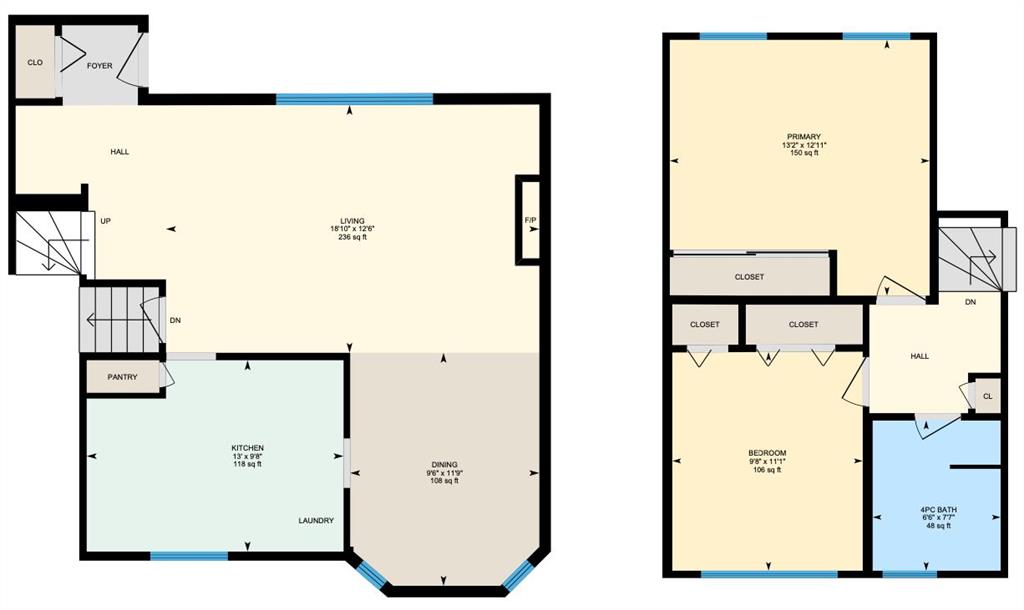 The upper level spans approximately 1,043 sq. ft. and features a bright, functional layout with two generously sized bedrooms, both with large above-grade windows that bring in excellent natural light. The main living and dining areas are open and inviting, creating a comfortable space for everyday living and entertaining.