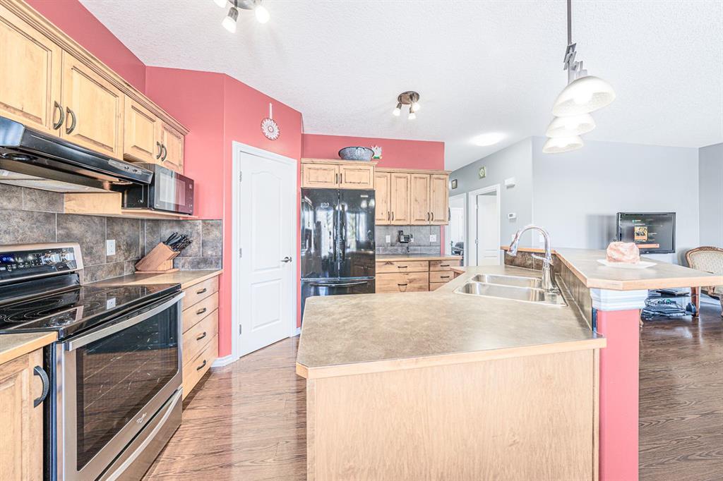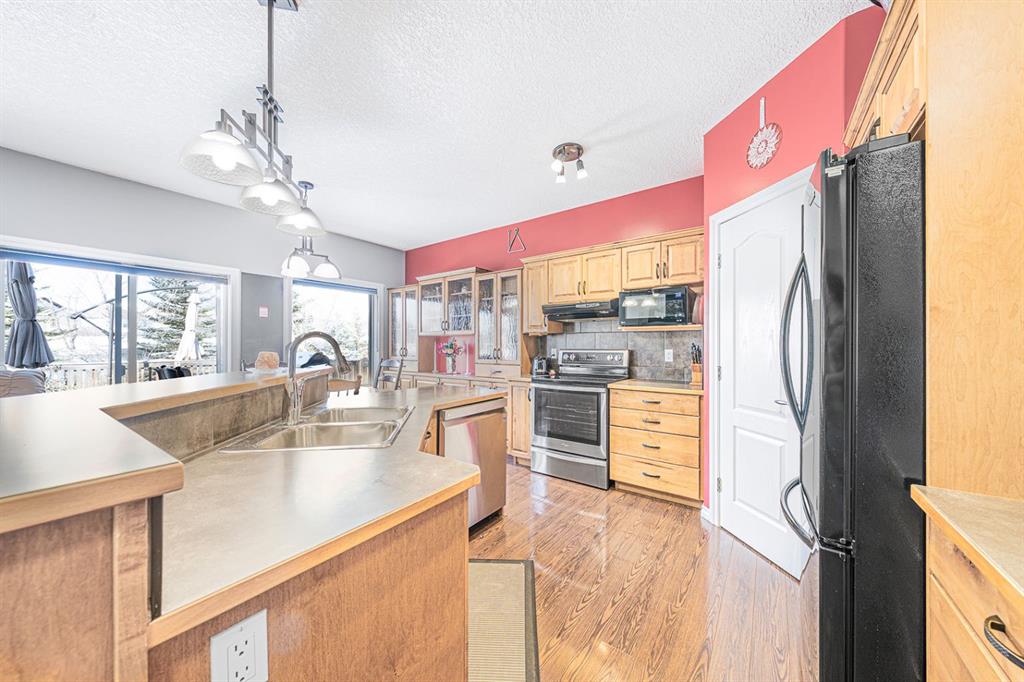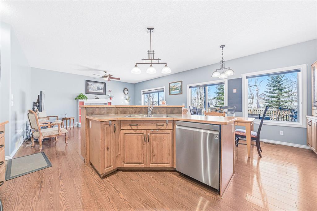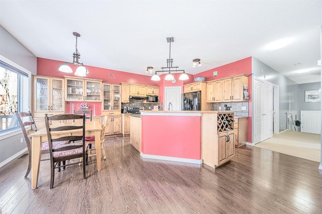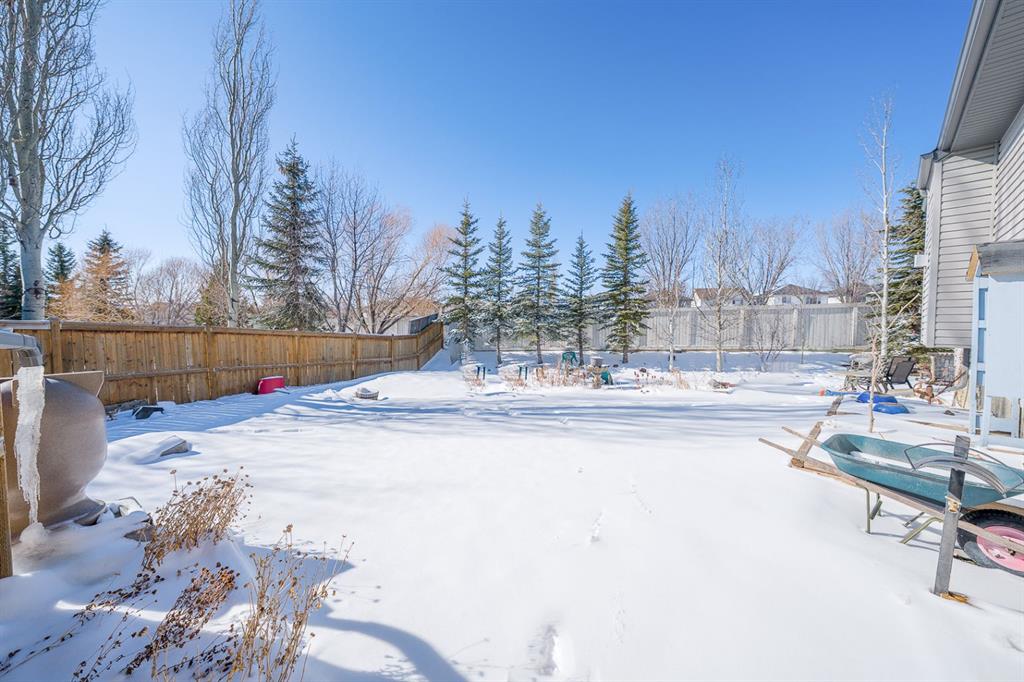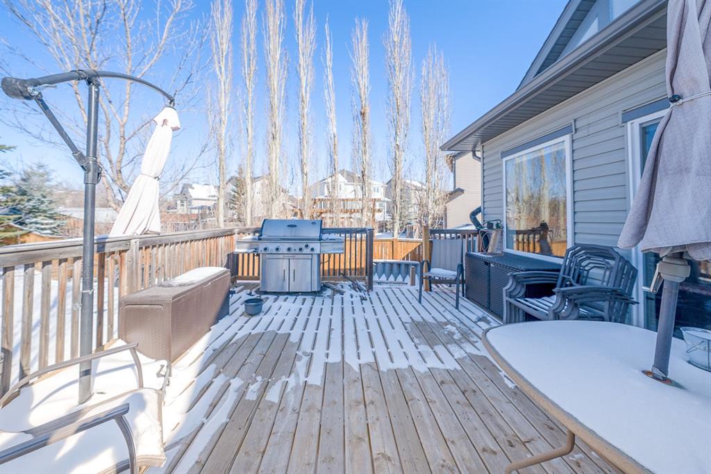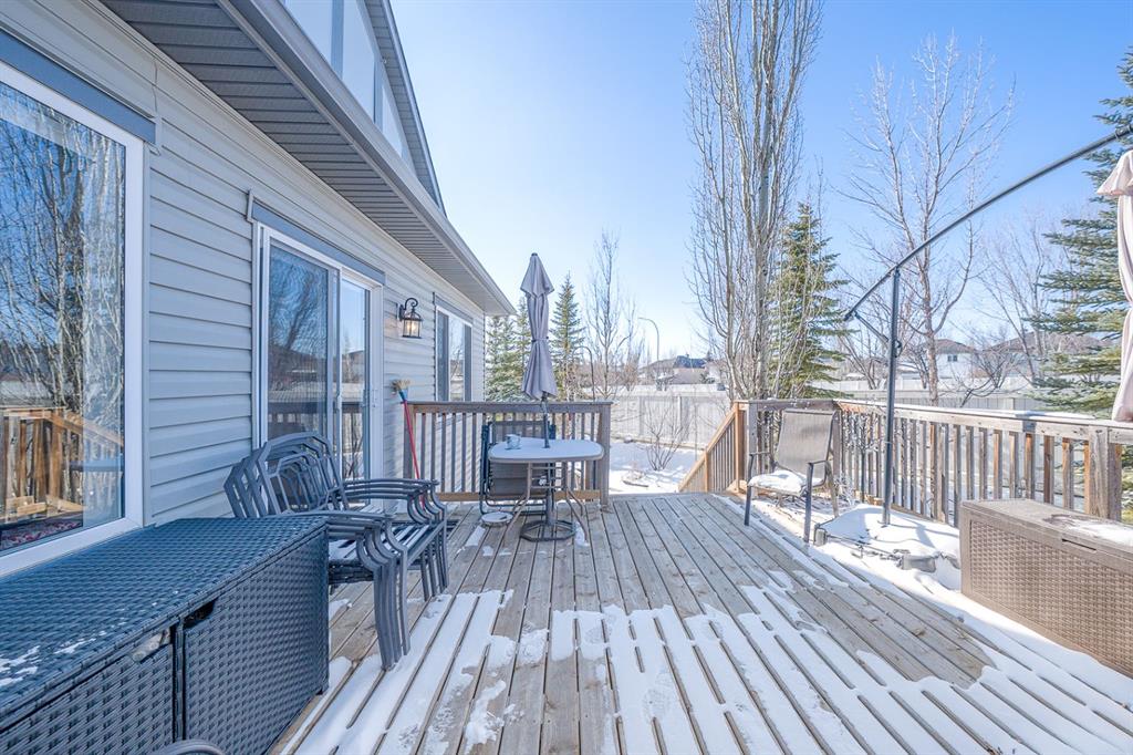 Situated on a pie lot in the lake community of Crystal Shores, this home offers a total of 3 bedrooms, 2 full bathrooms and nearly 2000 sq ft of developed living area. The main level features a great room with easy to care for laminate flooring and a warm, cozy fireplace. The eat-in kitchen boasts a corner pantry, full height tiled backsplash, black appliances and island with eating ledge, pendant lighting & built-in wine rack. Access to the deck is found through the sliding doors off the breakfast nook. Completing this level are 2 bedrooms including the master retreat with walk-in closet and convenient 4 pc ensuite bath. Basement development includes an incredibly spacious rec room, office niche, 3rd bedroom and storage area. The back yard offers a park like setting with tastefully landscaped flower beds, bushes and mature trees. Located near schools, within walking distance to the Crystal Ridge Golf Club and with lake access privileges, this home is ideal for a growing family.