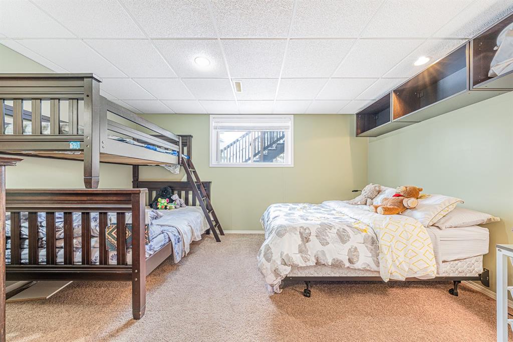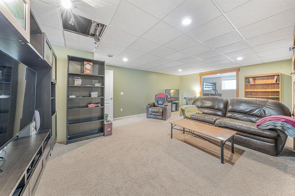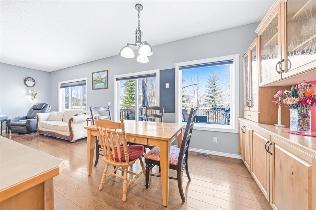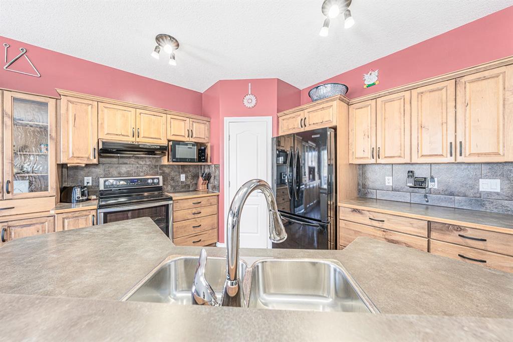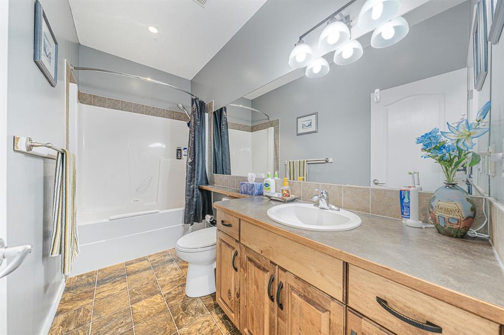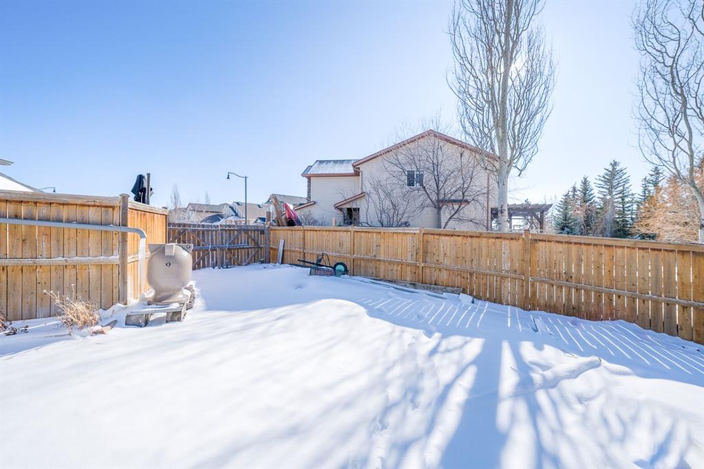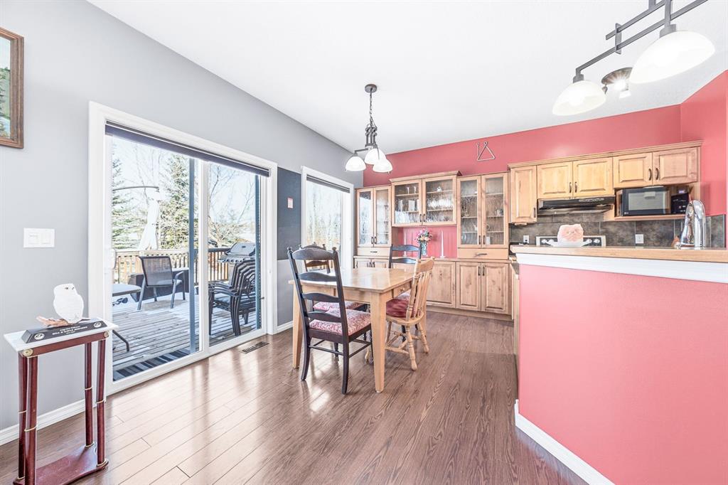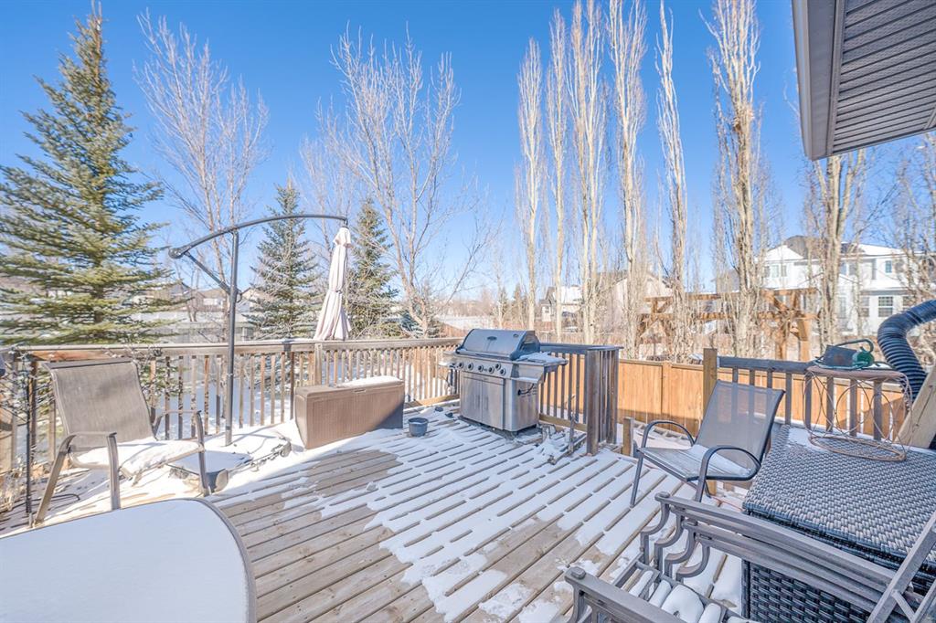 Situated on a pie lot in the lake community of Crystal Shores, this home offers a total of 3 bedrooms, 2 full bathrooms and nearly 2000 sq ft of developed living area. The main level features a great room with easy to care for laminate flooring and a warm, cozy fireplace. The eat-in kitchen boasts a corner pantry, full height tiled backsplash, black appliances and island with eating ledge, pendant lighting & built-in wine rack. Access to the deck is found through the sliding doors off the breakfast nook. Completing this level are 2 bedrooms including the master retreat with walk-in closet and convenient 4 pc ensuite bath. Basement development includes an incredibly spacious rec room, office niche, 3rd bedroom and storage area. The back yard offers a park like setting with tastefully landscaped flower beds, bushes and mature trees. Located near schools, within walking distance to the Crystal Ridge Golf Club and with lake access privileges, this home is ideal for a growing family.