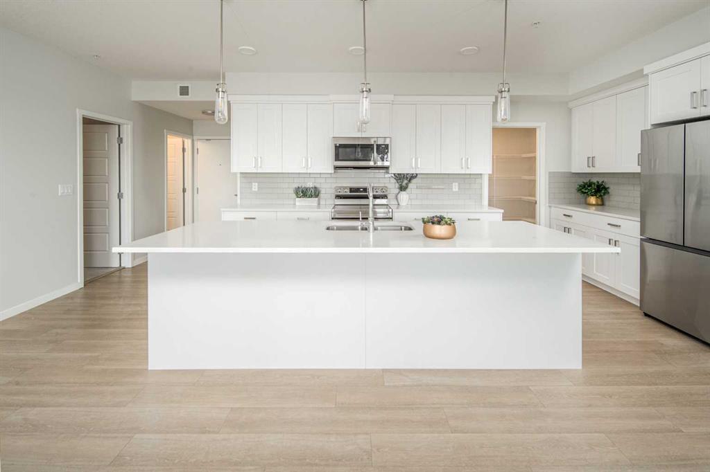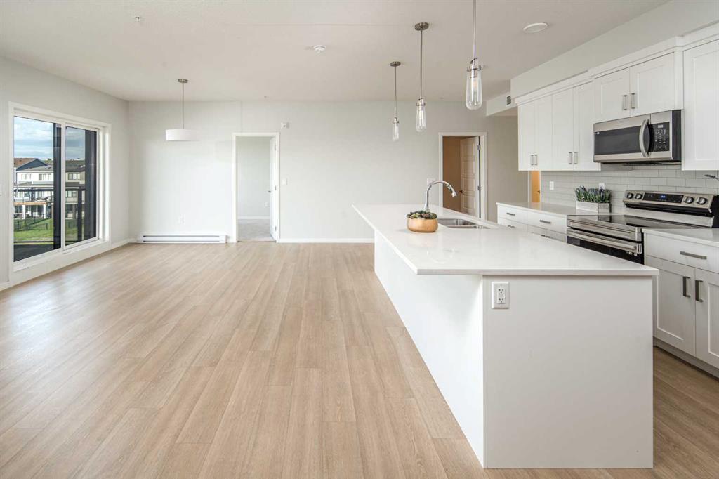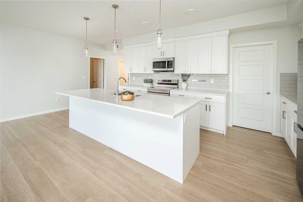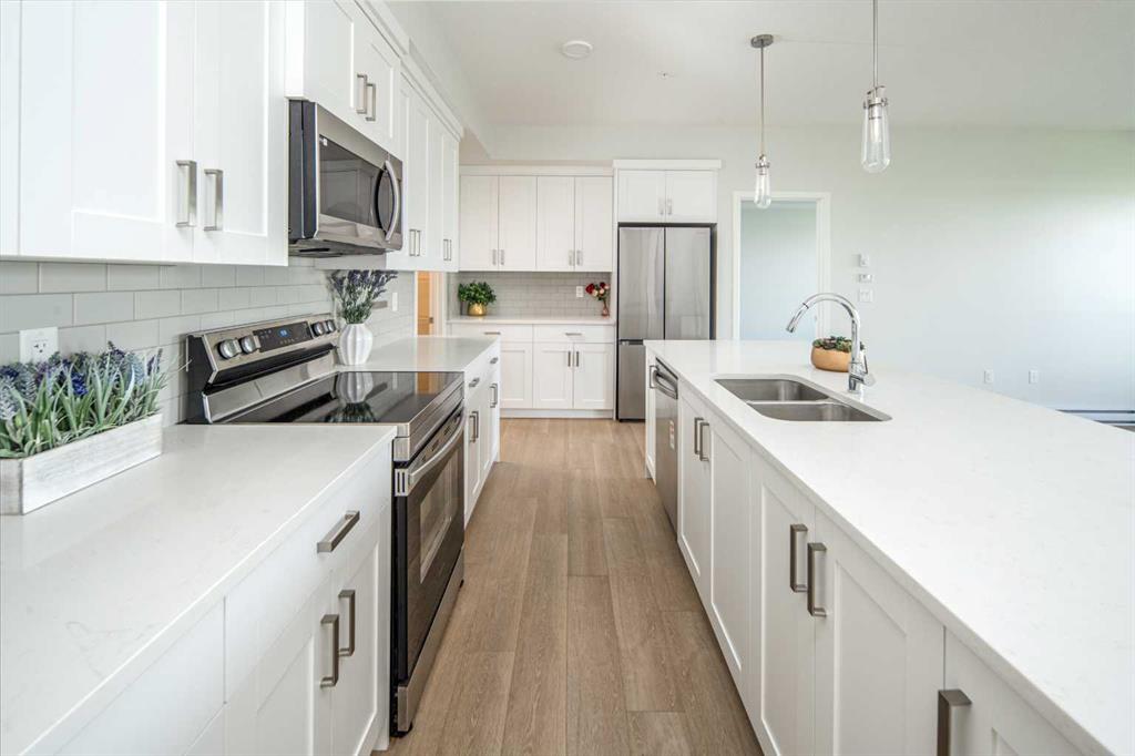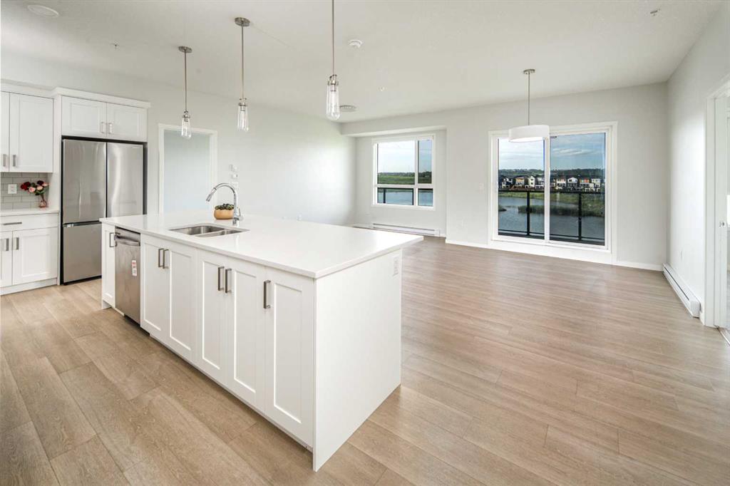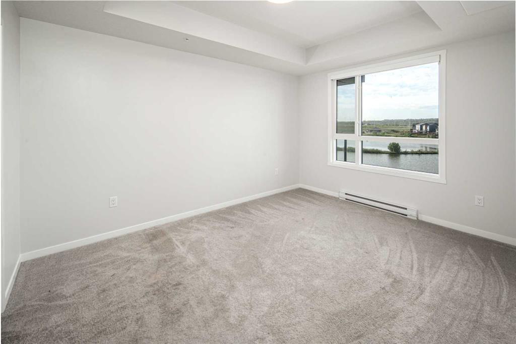 Welcome to Riverstone Manor! Located in the highly sought after southeast community of Riverstone in Cranston. BUILT BY “BUILDER OF CHOICE” WINNER CEDARGLEN LIVING! This unit offers luxury living right at your fingertips! This stunning southwest facing unit features 3 beds, 2 baths, and over 1,188 SqFt of living space. It also comes a titled underground parking stall and building bike storage! open plan, 9' ceilings, Low E triple glazed windows, electric baseboard heating, BBQ gas line on the balcony, Fresh Air System (ERV) and so much more. Super sunny SOUTH UNIT, with UNOBSTRUCTED Views of the Scenic Wet Pond on the balcony. The kitchen is spectacular with full height cabinets, quartz counters, pots/pan drawers, undermount sink, upgraded backsplash and S/S appliances. The island is extensive which transitions into the spacious living area and large dining room, perfect for entertaining. The spacious primary bedroom has a large window (triple pane windows), sizeable walk-in closet and dual vanities with a stand-up shower. The additional bedrooms are perfect for kids, guests, or an office. Nearby is the laundry/storage room (washer & dryer included) and a 4pc bath with quartz counters and undermount sink. Highlights include: Hardie board siding, electric baseboard heating, BBQ gas line on the balcony. Strategically located steps from the beautiful Bow River, adjacent to the scenic wet pond, access to Cranston’s Resident’s Association and many other bespoke amenities. PET FRIENDLY COMPLEX!