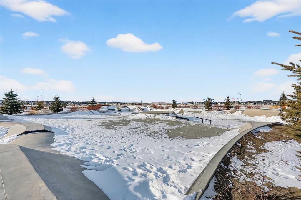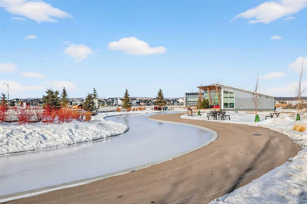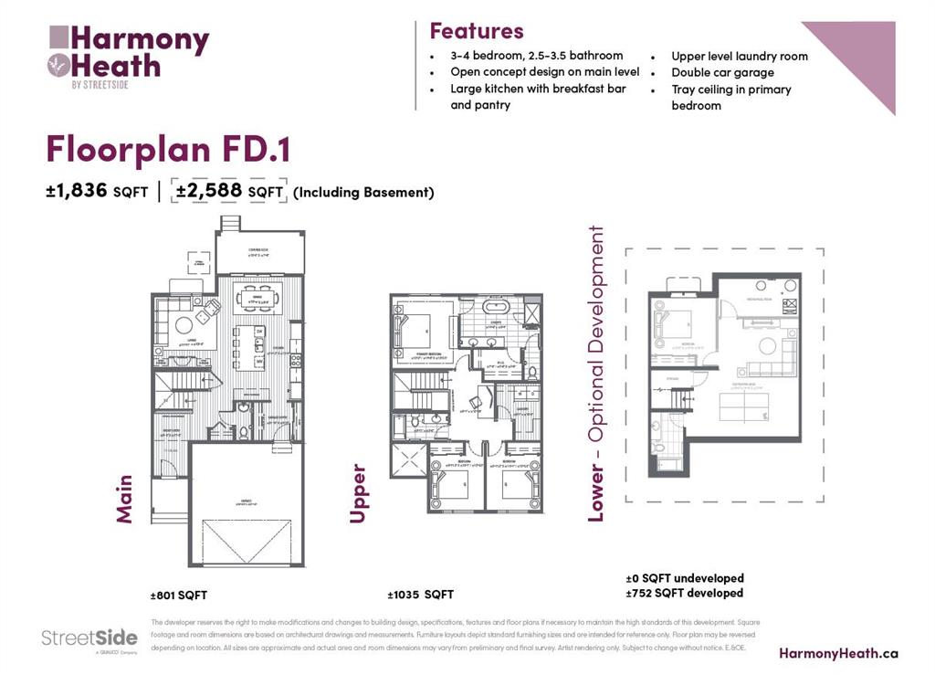 Experience the height of sophisticated living in this highly coveted luxury townhome, where a generous floor plan meets modern comfort and refined finishes. Proudly presented by StreetSide – this thoughtfully designed unit features 3 bedrooms, 2.5 bathrooms, and a front attached double car garage. The heart of the home is a spacious kitchen with a large central island, polished white quartz countertops, upgraded stainless steel appliances, and elegant sliding French patio doors that open to your covered deck area—ideal for both everyday living and entertaining. Light floods into the living room with ease through the large window, while luxury vinyl plank flooring flows throughout the main floor living areas, and carpeted stairs leading to the upper level and bedrooms provide extra warmth. The primary ensuite is a private sanctuary, complete with tile flooring, double sinks, a freestanding soaker tub, and an oversized tile-and-glass shower delivering spa-inspired comfort at home. The unfinished basement with roughed-in plumbing provides future potential for additional living space tailored to your needs. Professional landscaping and fencing complete your new home. Ideally located in the award-winning community of Harmony, residents enjoy Mickelson National Golf Course, private lake amenities, scenic walking and biking trails, and a wellness-focused lifestyle—just a shorty drive from Calgary city minutes and 45 minutes from the Rocky Mountains, where nature and convenience come together effortlessly