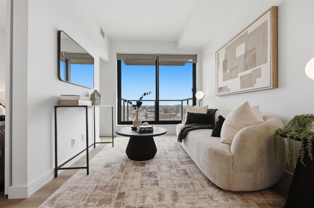 Bathed in soft northeast facing light, the thoughtfully designed open concept layout creates an effortless flow between the kitchen, dining, and living areas. Large windows invite the city skyline inside, while the private balcony provides the perfect place to enjoy your morning coffee, fresh air, and peaceful views above the energy of the city.
