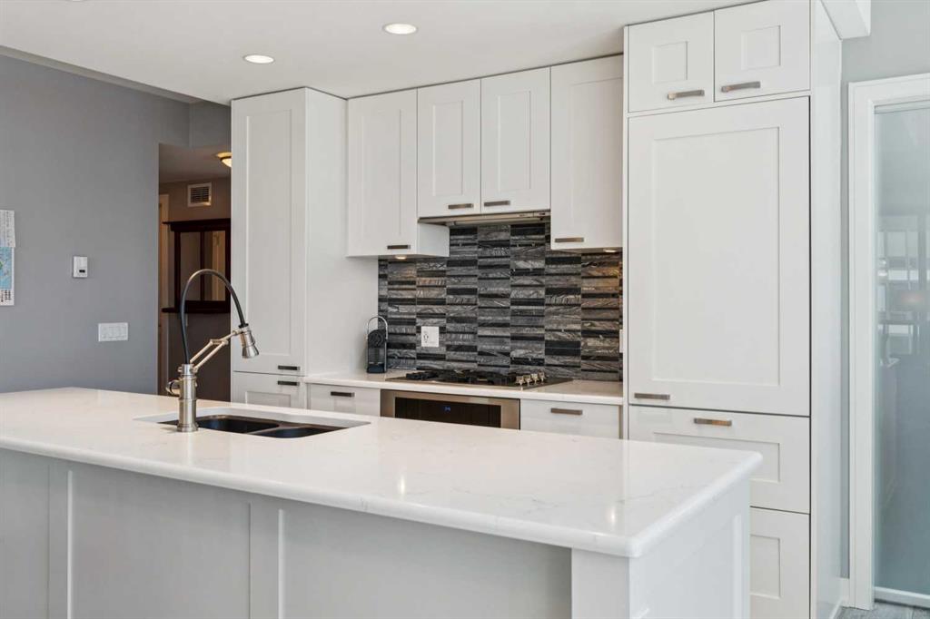 Sky-High Luxury Living in the Waterfront! Prime northwest corner location with spectacular views of Prince's Island Park, Bow River, mountains, COP and the downtown city lights! The many large expansive corner windows provide an abundance of bright natural light while enhancing those incredible views from every room! Exceptional open floor plan that's perfect for entertaining and great layout with opposite side bedrooms for complete privacy! Completely renovated kitchen, bathrooms, flooring and UV-Coated windows all in 2018. Immaculate 2 Bedroom + Den home with gorgeous hardwood flooring, quartz counter-tops throughout, soft-close kitchen drawers, custom Hunter Douglas blinds and tasteful recessed lighting! You'll be sure to enjoy the large covered balcony with incredible views, natural-gas fireplace, 5 pce ensuite bath with soaker tub and rain shower, custom closet organizers, separate office-den, open kitchen with large eat-in Island, gas range, 2 built-in freezer drawers, brand new dishwasher and microwave, separate laundry room with storage, high-end stack washer/dryer and spacious entrance to greet your guests. Comes with 2 very convenient SXS parking stalls across from elevator doors and storage locker in secure storage room. The luxurious Waterfront towers provide first-class amenities with concierge service, impressive lobby with comfortable seating area, fully equipped fitness center, hot tub area, steam room, yoga studio, social lounge with billiard table, awesome Theater room, private inner courtyard and car wash facilities! The location is extraordinary along the south bank of the Bow River next to Prince's Island Park, world-class pathway system, near by shops and boutiques, great restaurants and cafes, Chinese Cultural Center and quick access to transportation and the LRT. Time to enjoy the ultimate in downtown urban living!