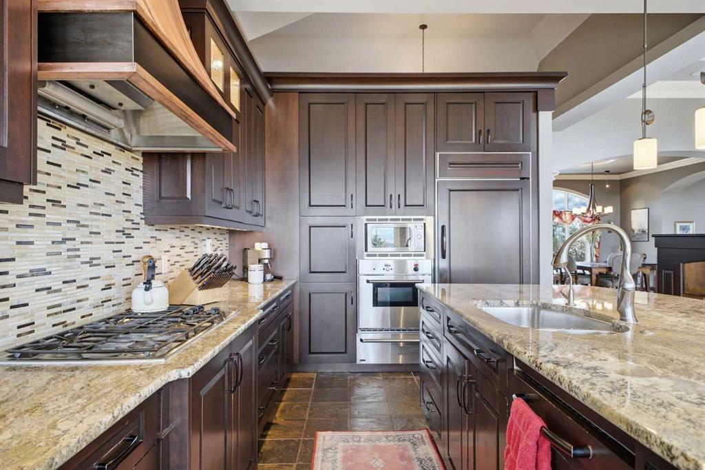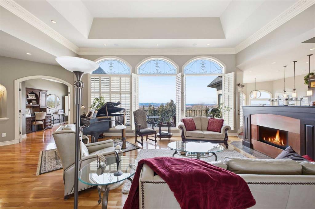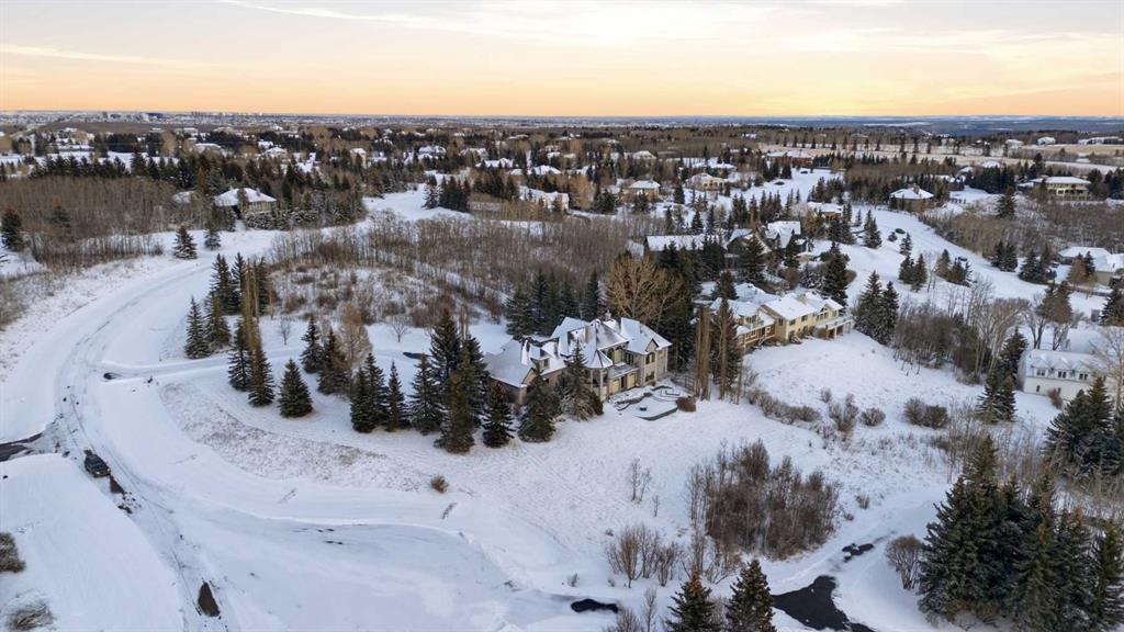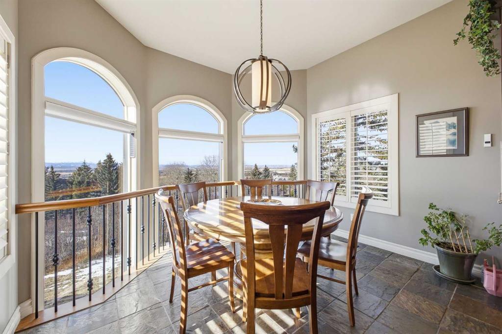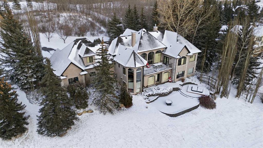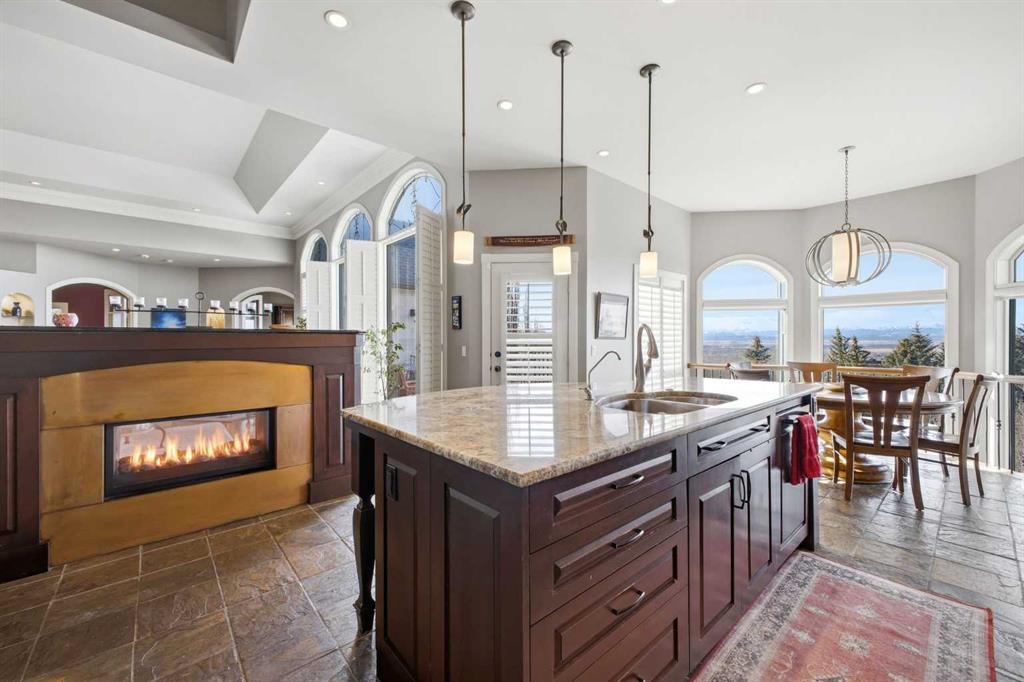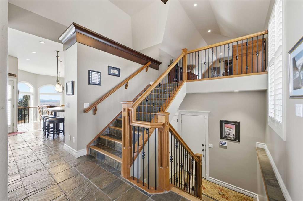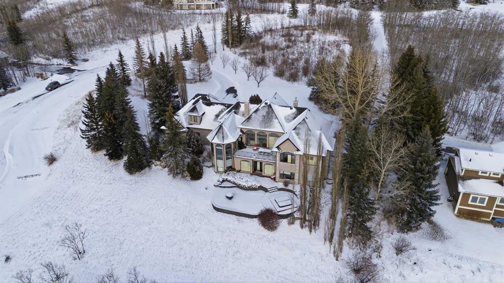 An expansive 2 acre estate in prestigious Pinnacle Ridge, perfectly positioned to capture sweeping, unobstructed views of the Rocky Mountains. This elegant 4 bedroom residence offers nearly 5,200 sq ft of refined living space, including a fully developed walk out basement. The main level showcases hardwood and slate flooring, 9’ ceilings, crown moulding, and an abundance of windows that drench the home in natural light. A formal dining room provides generous space for hosting, while the living room features a tray ceiling and a double sided fireplace for added warmth and ambiance. The tastefully updated chef’s kitchen is appointed with granite countertops, a large island with eating bar, extensive cabinetry, top tier appliances, and a bright breakfast nook framed by serene mountain views. Also on the main level, the private primary retreat includes a walk in closet and a luxurious 5 piece ensuite with dual sinks, a freestanding soaker tub, and a glass enclosed shower. A dedicated office/den is tucked just off the living room—ideal for a quiet workspace—and a 2 piece powder room completes the level. The upper floor offers a spacious bonus room, perfect for a media lounge, studio, or additional office. The fully developed walk out basement extends the living space with a large recreation room, wet bar, and an insulated wine cellar for the enthusiast. This level also includes a flex room with Murphy bed (currently used as a home gym), two additional bedrooms, den, two full bathrooms, and a well appointed laundry room with sink, storage, and hanging racks. Additional features include central air conditioning, a new boiler system, built in speakers throughout, and leaf filters on all eavestroughs with a lifetime warranty. Outdoor living is exceptional with a large upper deck and tiered patio overlooking impeccably landscaped grounds and breathtaking mountain vistas—an ideal setting for relaxation or entertaining. The heated triple attached garage is equipped with a Level 2 EV charger. Located just off Springbank Road, this property offers quick access to the city and an easy drive to the mountains.
