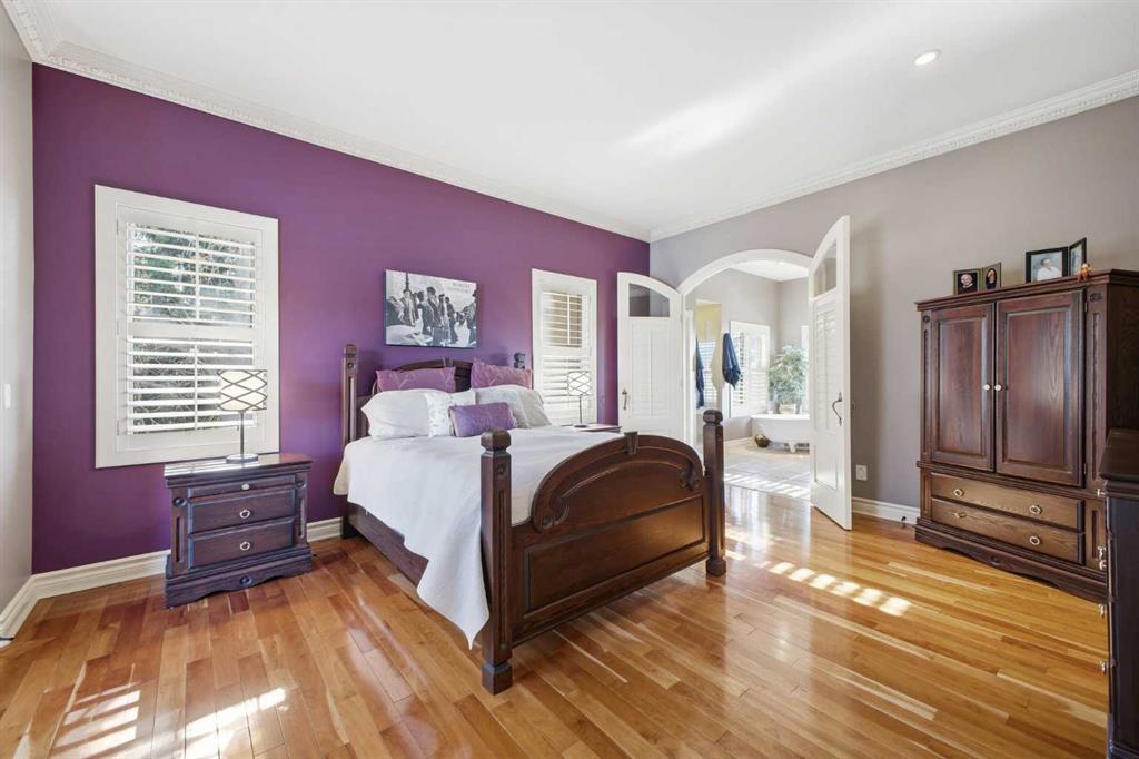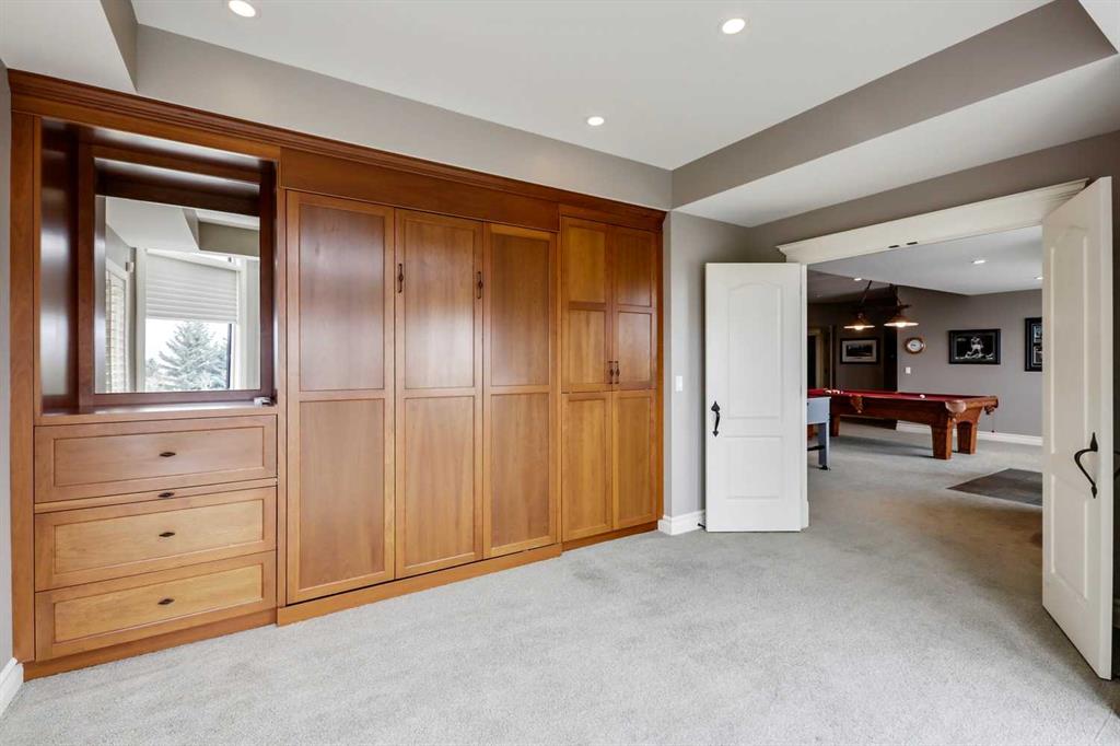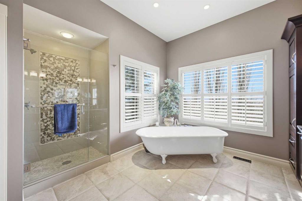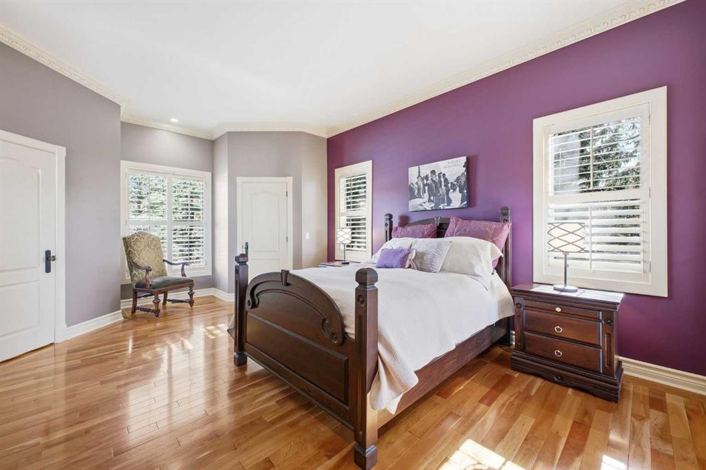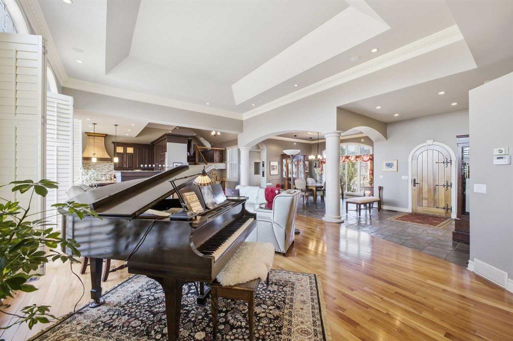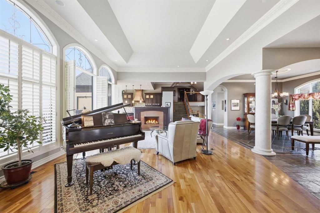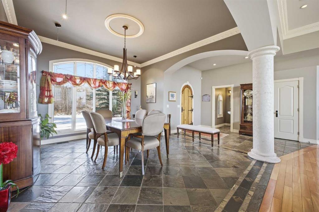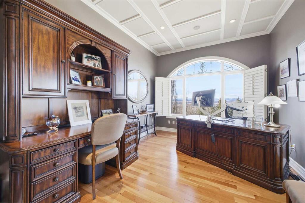 An expansive 2 acre estate in prestigious Pinnacle Ridge, perfectly positioned to capture sweeping, unobstructed views of the Rocky Mountains. This elegant 4 bedroom residence offers nearly 5,200 sq ft of refined living space, including a fully developed walk out basement. The main level showcases hardwood and slate flooring, 9’ ceilings, crown moulding, and an abundance of windows that drench the home in natural light. A formal dining room provides generous space for hosting, while the living room features a tray ceiling and a double sided fireplace for added warmth and ambiance. The tastefully updated chef’s kitchen is appointed with granite countertops, a large island with eating bar, extensive cabinetry, top tier appliances, and a bright breakfast nook framed by serene mountain views. Also on the main level, the private primary retreat includes a walk in closet and a luxurious 5 piece ensuite with dual sinks, a freestanding soaker tub, and a glass enclosed shower. A dedicated office/den is tucked just off the living room—ideal for a quiet workspace—and a 2 piece powder room completes the level. The upper floor offers a spacious bonus room, perfect for a media lounge, studio, or additional office. The fully developed walk out basement extends the living space with a large recreation room, wet bar, and an insulated wine cellar for the enthusiast. This level also includes a flex room with Murphy bed (currently used as a home gym), two additional bedrooms, den, two full bathrooms, and a well appointed laundry room with sink, storage, and hanging racks. Additional features include central air conditioning, a new boiler system, built in speakers throughout, and leaf filters on all eavestroughs with a lifetime warranty. Outdoor living is exceptional with a large upper deck and tiered patio overlooking impeccably landscaped grounds and breathtaking mountain vistas—an ideal setting for relaxation or entertaining. The heated triple attached garage is equipped with a Level 2 EV charger. Located just off Springbank Road, this property offers quick access to the city and an easy drive to the mountains.