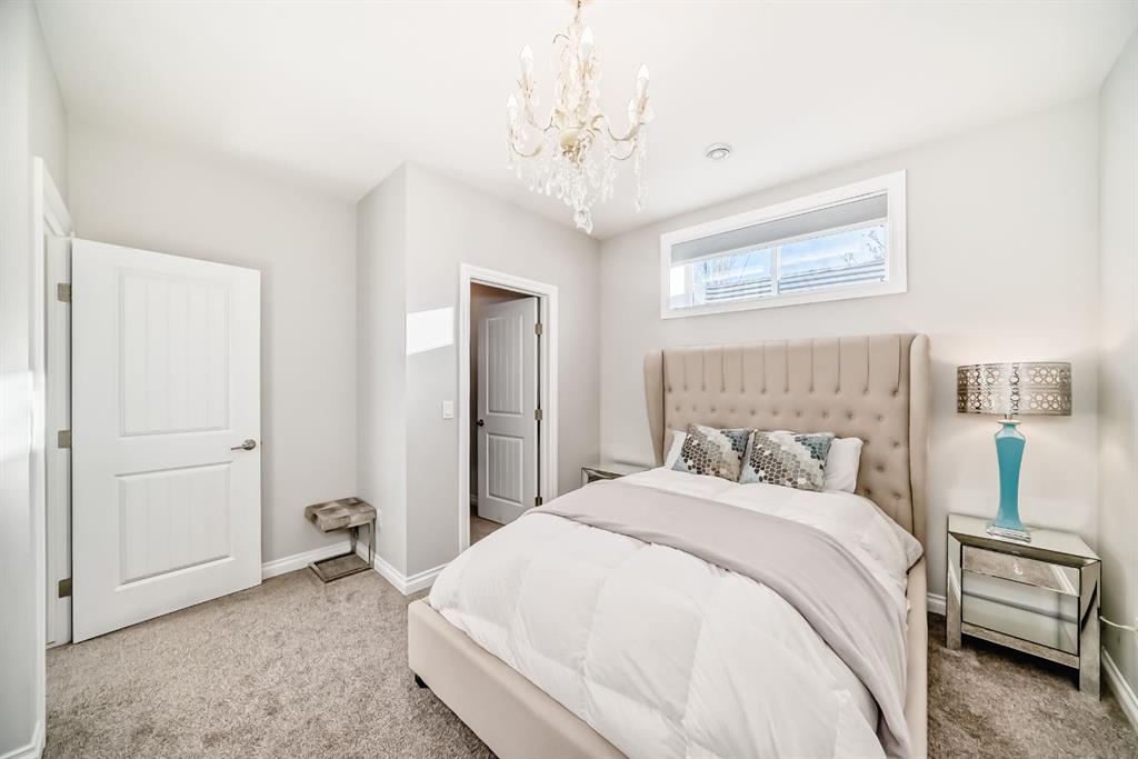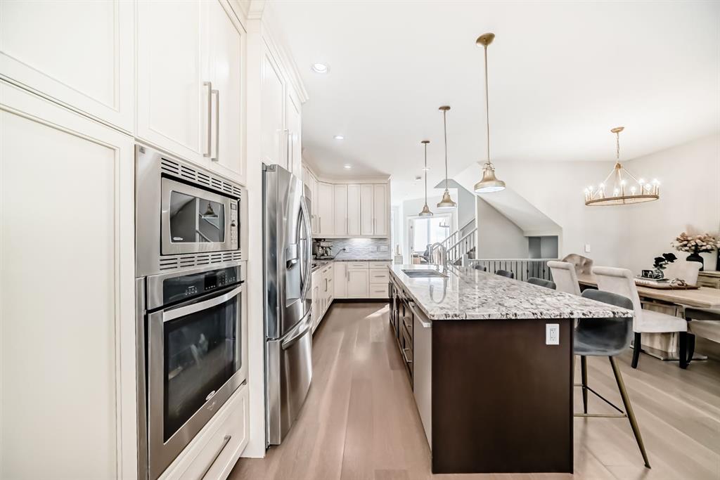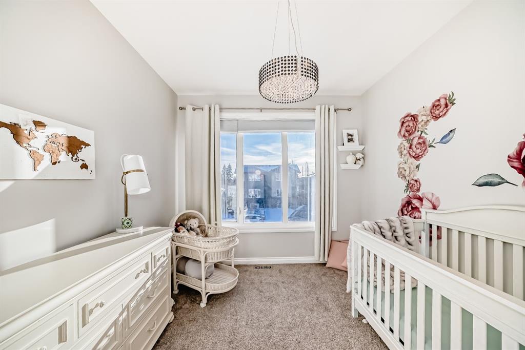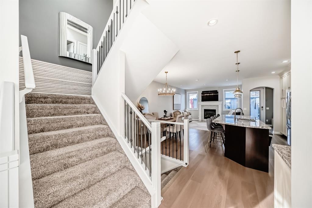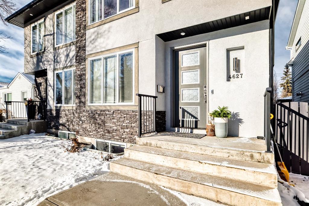 Stunning 2014 custom-built semi-detached home in the heart of trendy Bowness. A short stroll to Bowness Park, Bow River pathways, shops, restaurants, and cafés, with quick access to COP, downtown and the mountains, this home combines modern luxury with a vibrant community lifestyle. This home has a bright open floor plan with 4 bedrooms, 3.5 baths, office, fully developed basement and double garage. Boasting 2,828.9 sq ft of total developed living space, including 1,999.6 sq ft above grade, the main floor features 9’ ceilings, engineered hardwood, a chef’s kitchen with granite counters, large island with breakfast bar, pantry, and premium stainless steel appliances including a Café 5-burner gas cooktop and ThinQ refrigerator with glass beverage door, plus a spacious dining area and large living room with gas fireplace. A mudroom with built-in bench and cabinets opens to the fenced backyard with lawn area and a concrete patio with pergola, this home is enhanced by oversized custom front and back doors with windows for additional sunlight. Upstairs, the primary suite includes a walk-in closet and a luxurious, spa-inspired 5-piece ensuite with jet soak tub, toilet room, double vanity, and separate shower, upper level also has two additional bedrooms, a computer nook, a 4-piece bathroom, and upper-floor laundry room. The basement offers 9’ ceilings, a large bedroom with walk-in closet, full bathroom, huge family room with gas fireplace and a wet bar for entertaining as well as plenty of storage. Additional features include: Central A/C, vacuum system and attachments, custom blinds, enlarged laundry room with sink, upgraded lighting fixtures throughout, Hue smart lighting in kitchen, bedrooms, and hallways, along with a double detached garage with shelving. A rare opportunity in a vibrant, walkable community.