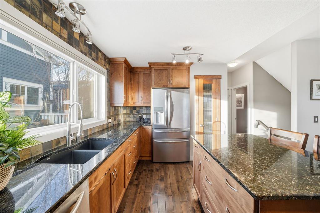 Step inside and you’ll immediately notice the warmth created by distressed hardwood floors, 9’ knockdown ceilings, & rich alder millwork throughout the main level. The heart of the home is the impressive island kitchen featuring granite countertops, full-height cabinets, and a striking slate backsplash above the sink. Quality stainless steel appliances include a DUAL-FUEL GAS STOVE with electric oven, KitchenAid dishwasher, & newer premium fridge — perfect for family meals or entertaining.