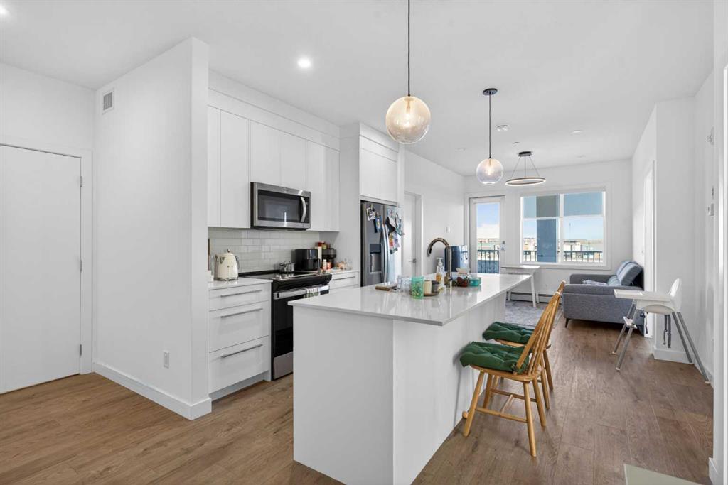 Interior:kitchen island, open floorplan, quartz counters