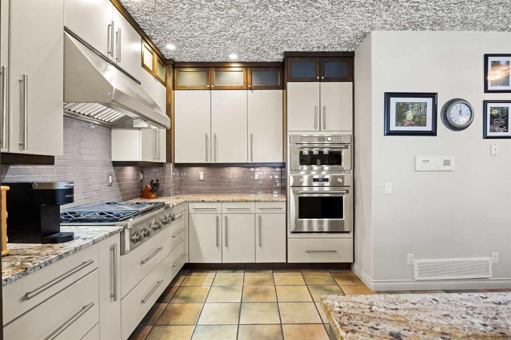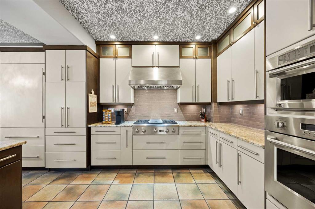 At the heart of the home is a custom-designed kitchen built with exceptional attention to detail. Full ceiling-height cabinetry provides abundant storage and incorporates soft-close doors and drawers, built-in recycling and garbage, spice storage, and under-cabinet lighting. Premium appliances include a Sub-Zero refrigerator and Monogram gas range with grill, along with a built-in oven and microwave/speed oven. Granite countertops, a subway tile backsplash, custom hood fan, and a generous island complete a space that is both highly functional and beautifully finished.