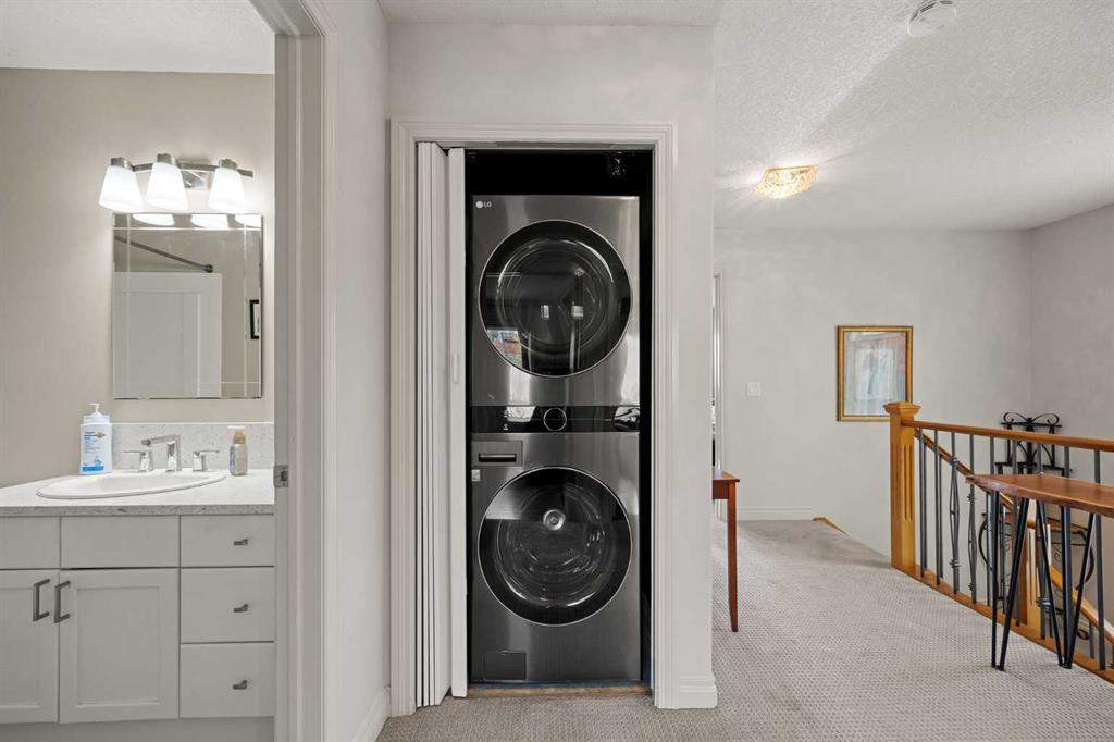 The upper level also includes a second bedroom and a flexible bonus room that can easily serve as a home office, media room, or third bedroom. A full bathroom and convenient upper-floor laundry with LG ThinQ high-capacity tower washer and dryer complete the level.
