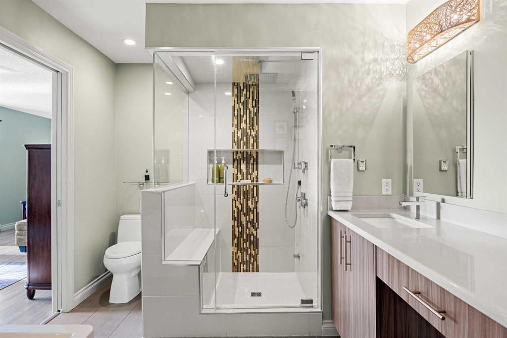 Upstairs, the spacious primary retreat provides a peaceful escape, featuring a large walk-in closet and access to a private south-facing balcony with downtown skyline views for much of the year. The renovated spa-inspired ensuite includes a freestanding soaker tub, dual vanity, heated towel rack, and a luxurious steam shower with rain head, body jets, and glass enclosure.