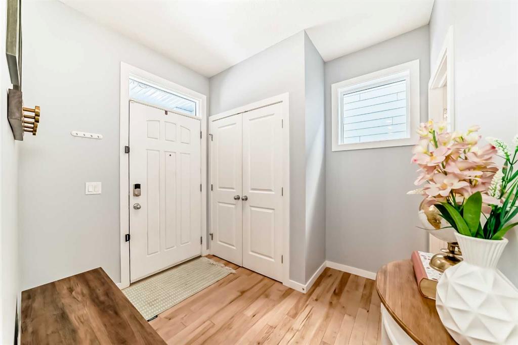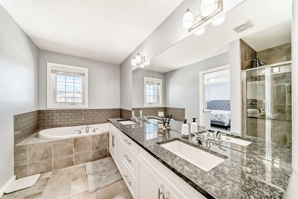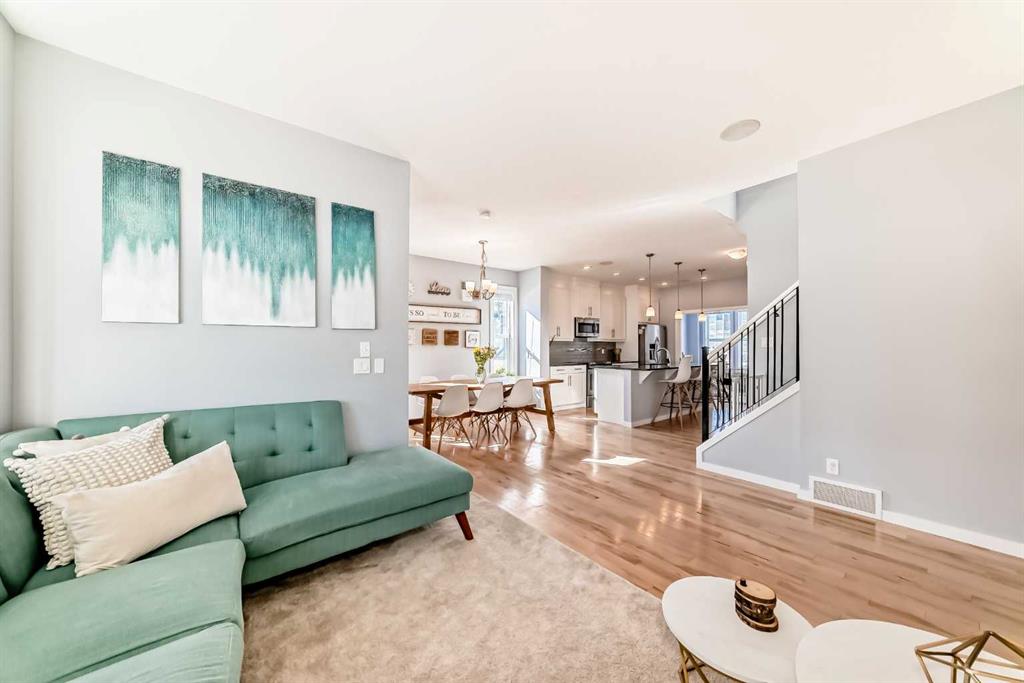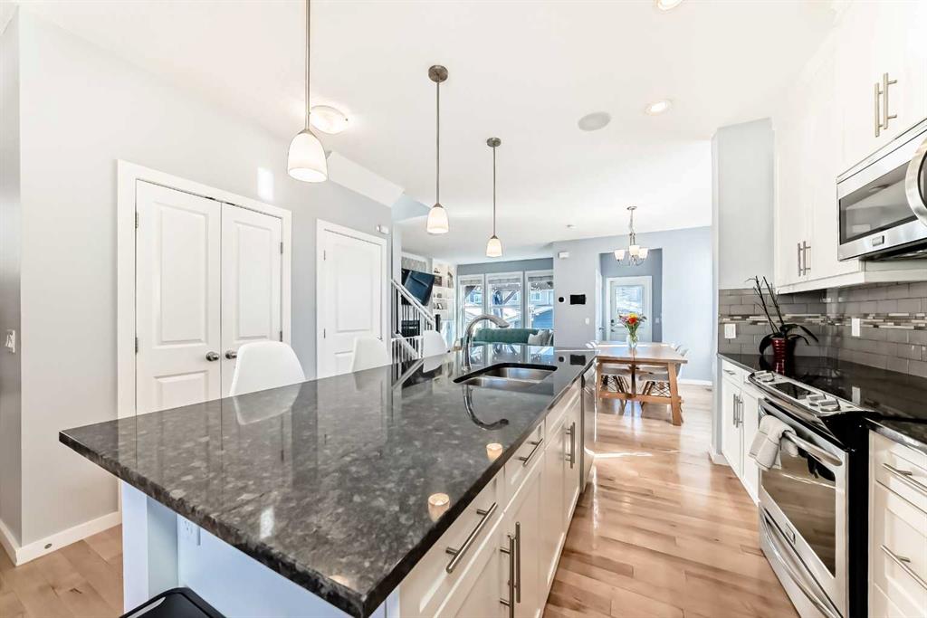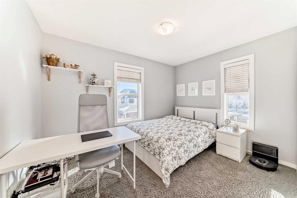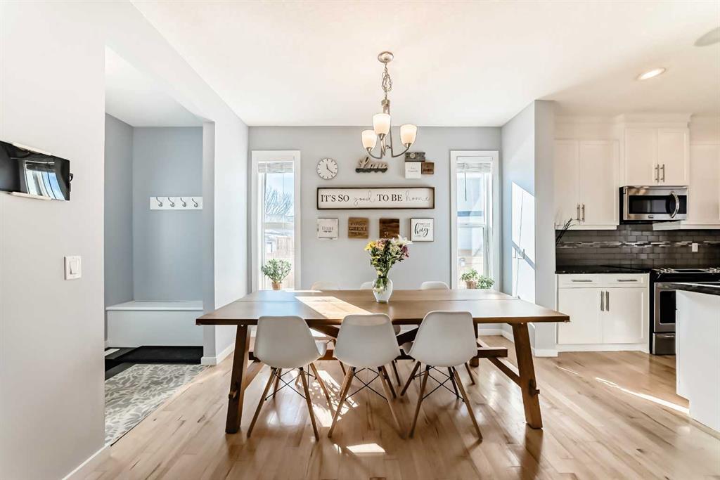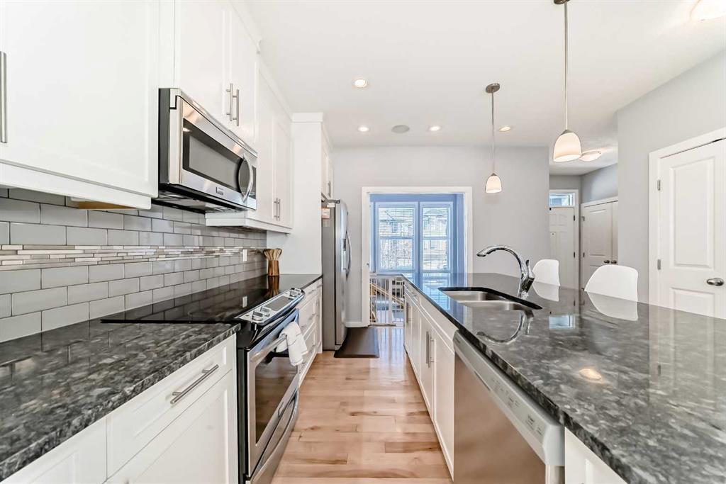 Experience lake community living in this immaculate, fully finished two-storey home located in Mahogany, Calgary’s premier award-winning community. This beautifully maintained detached home offers four bedrooms, 3.5 bathrooms, and a fully finished basement. The open-concept main floor features elegant hardwood flooring, a cozy gas fireplace with built-in shelving, surround sound, a bright office/den, and a modern kitchen. The kitchen showcases floor-to-ceiling white cabinetry, granite countertops, and a large island perfect for entertaining. Upstairs, the primary suite serves as a relaxing retreat with a spa-inspired five-piece ensuite and a large soaker tub. Two additional bedrooms, a full bathroom, and the convenience of upper-level laundry complete this floor.