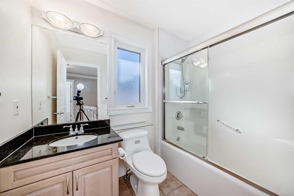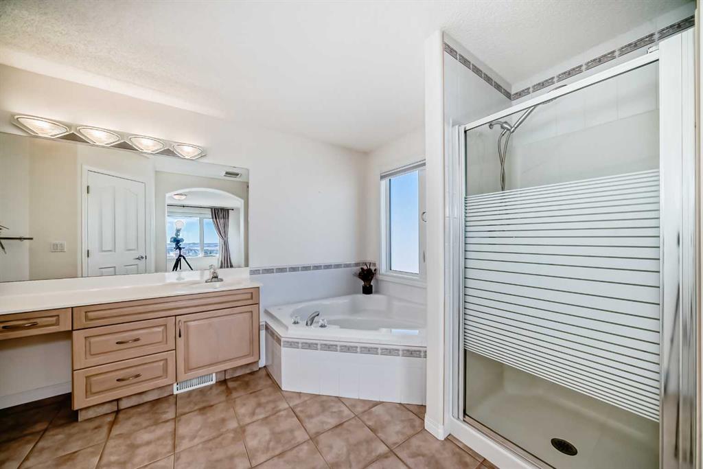 Upstairs offers a primary bedroom with walk-in closet and 4-piece ensuite with jetted corner tub, plus two additional bedrooms and a full bathroom.