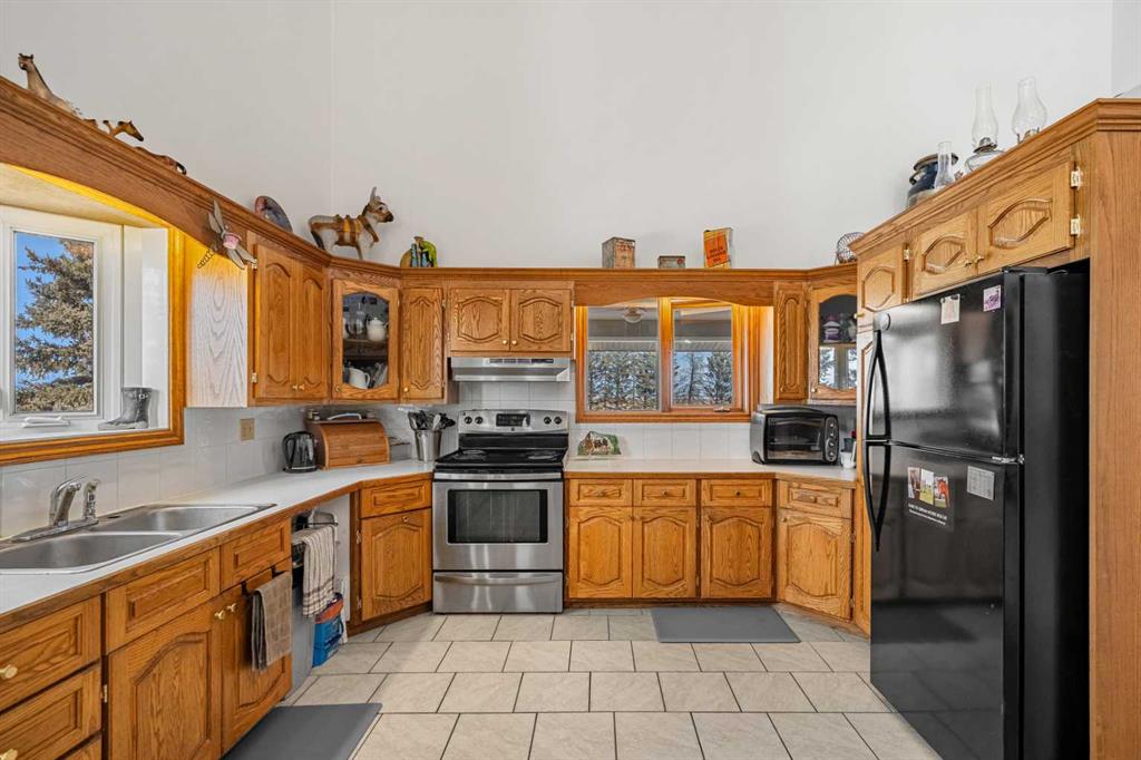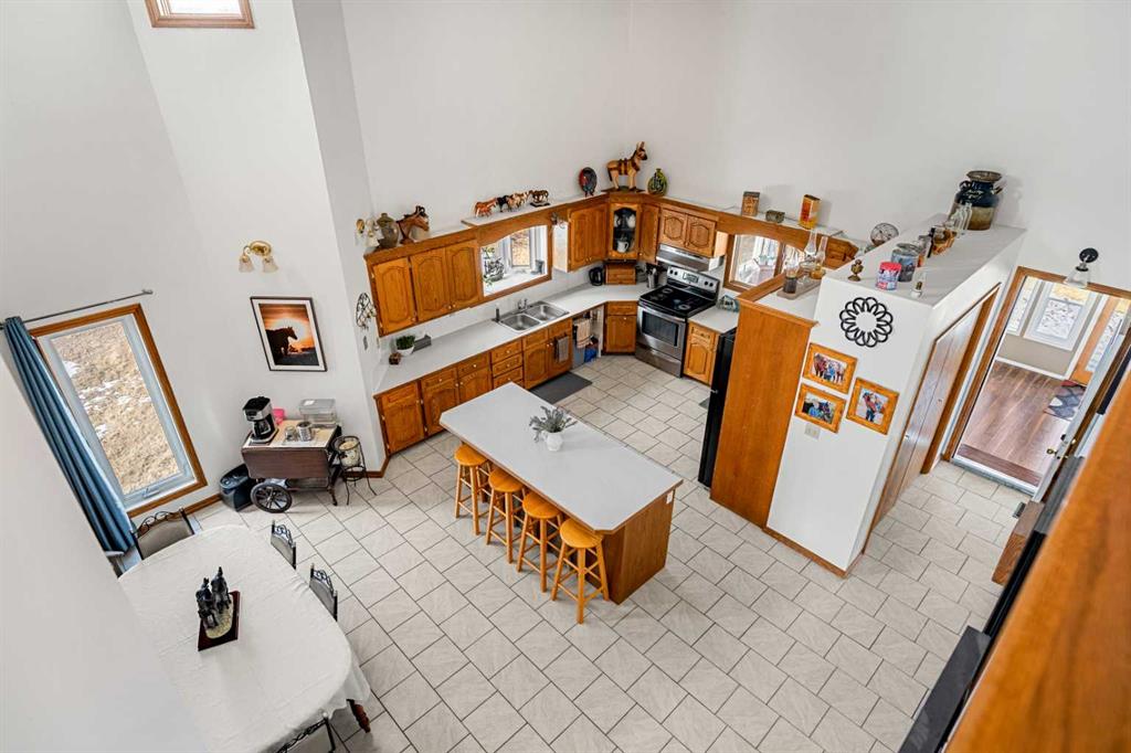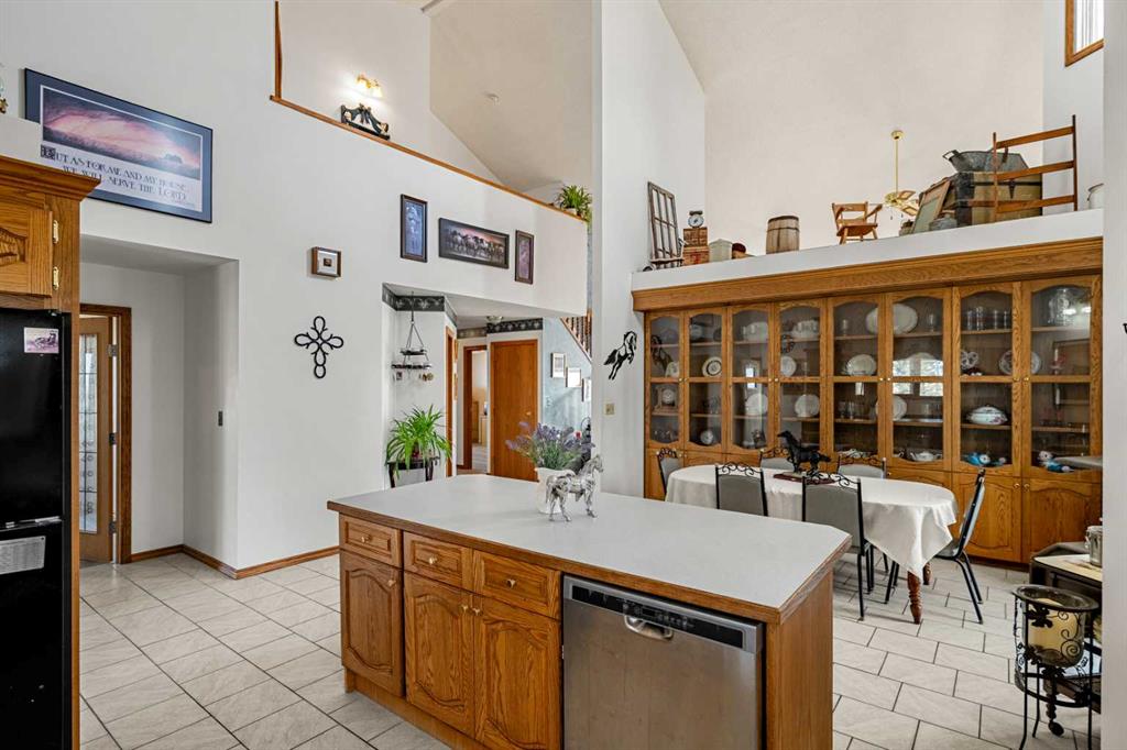 The 3338 sq. ft. 2-storey split home offers a spacious country layout with vaulted ceilings and a large open kitchen and dining area designed for gathering and everyday living. The kitchen features custom solid oak cabinetry, built-in pantry storage, and a built-in china display. The bright living room sits at the front of the home, while a large sunroom with in-floor heating at the back captures beautiful natural light and views of the surrounding land.