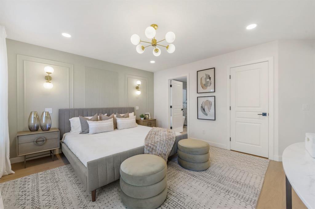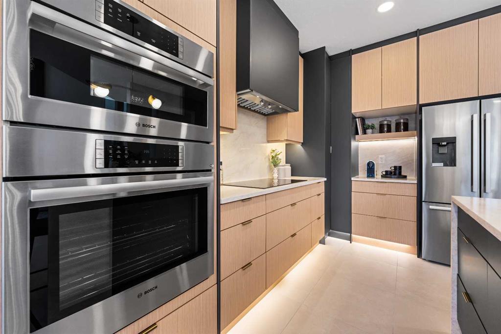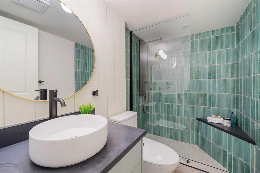 The fully developed basement is thoughtfully designed as a luxury Air-Bnb style space, offering boutique finishes, a private and comfortable layout, and exceptional versatility. It features a flexible media room with a multi-sided fireplace, terrazzo tile flooring, a fully equipped wet bar, dishwasher, and bar fridge. A full bathroom with glass-tiled walk-in shower with a bench, enhances ease of access without compromising luxury. Ideal for short-term rental potential, hosting guests or multi-generational living, this space delivers both lifestyle appeal and income opportunity.