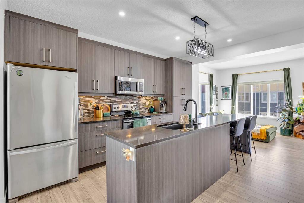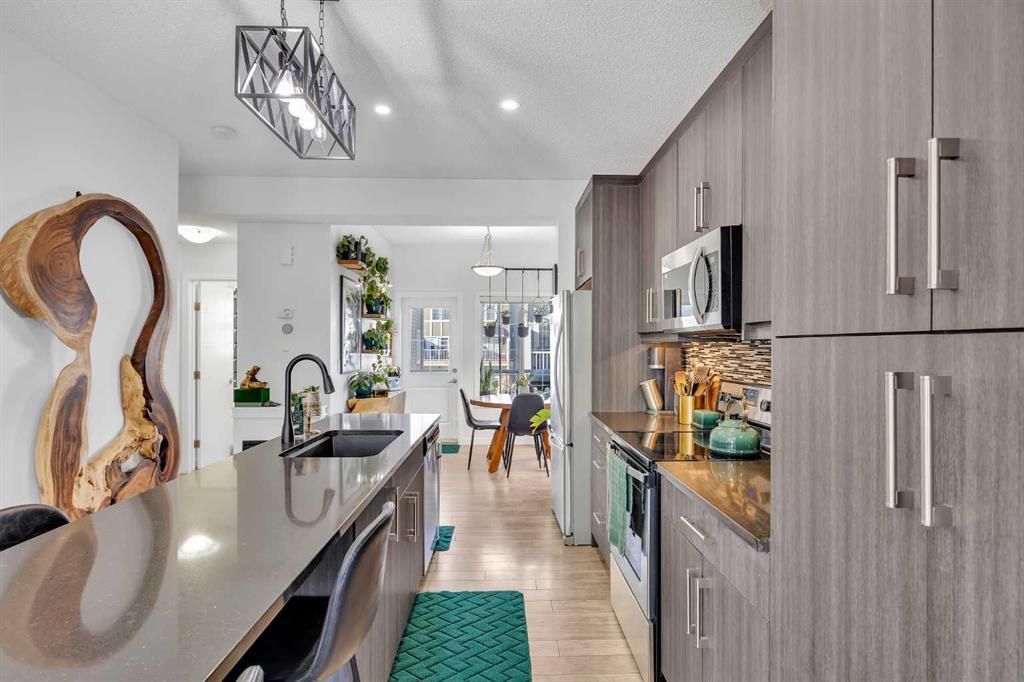 The main floor features an open concept design with a spacious living room, dedicated dining area, and a modern kitchen complete with quartz countertops, stainless steel appliances, mosaic tile backsplash, and a large island with seating. The dining area provides direct access to the balcony, making it easy to enjoy summer BBQs or relax outdoors. A convenient 2 piece bathroom is also located on this level.