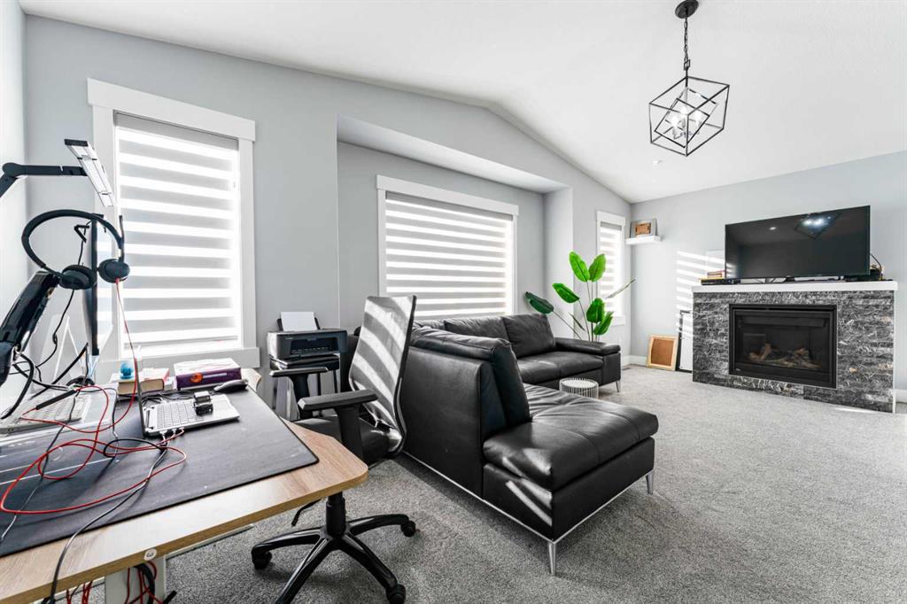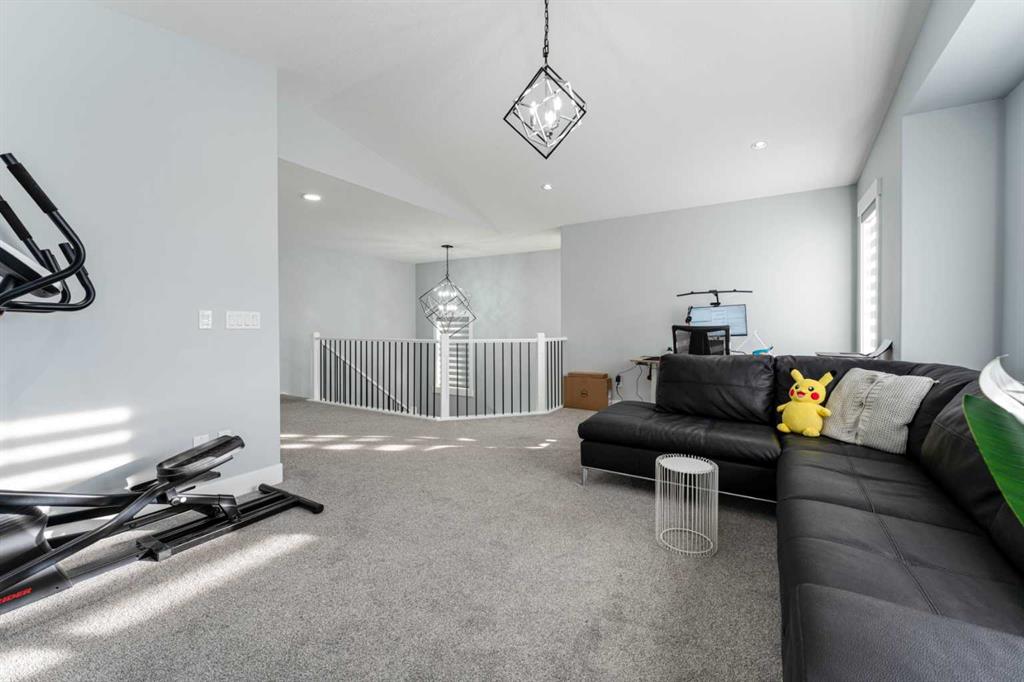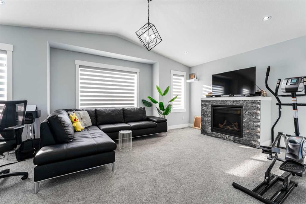 Upstairs, the layout continues to impress with three spacious bedrooms and a large vaulted bonus room with a gas fireplace, providing the perfect secondary living space for relaxing or movie nights. The primary bedroom retreat features a luxurious 5-piece ensuite with tiled shower, while a full 4-piece main bathroom and upper-floor laundry room add everyday convenience for busy households.