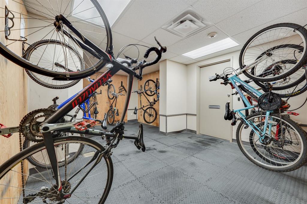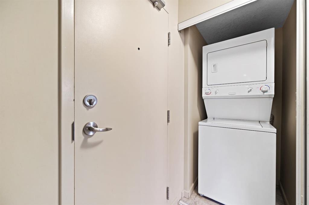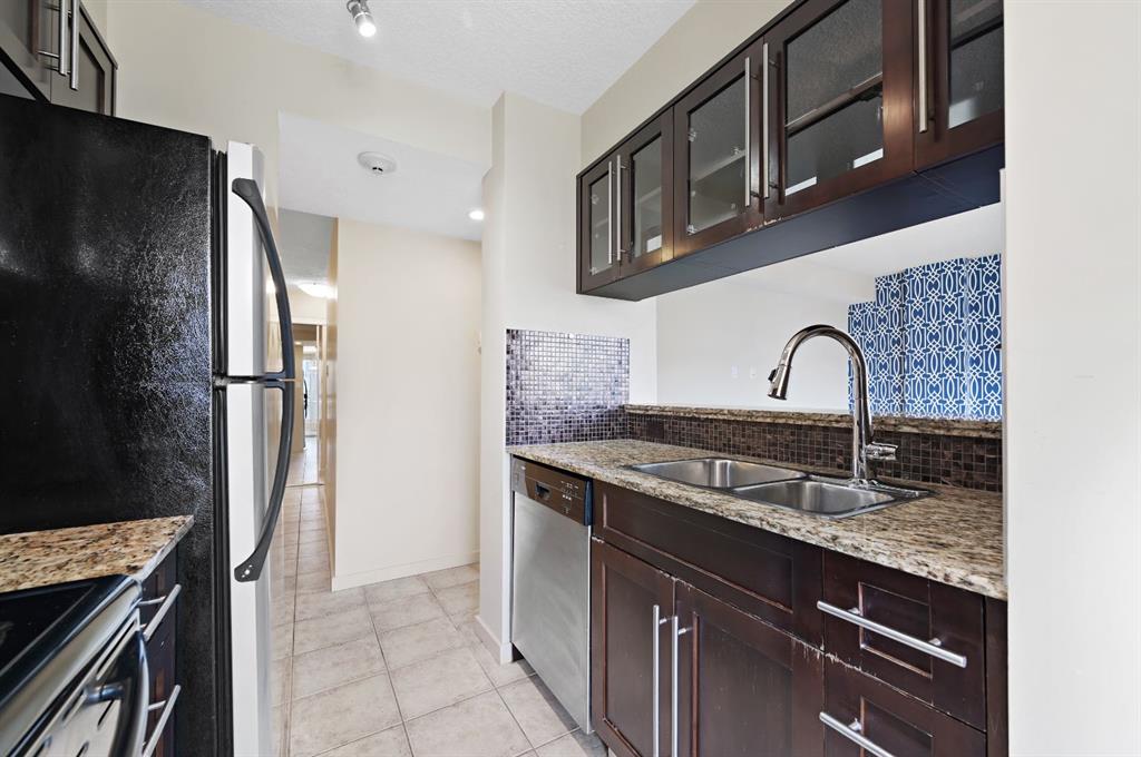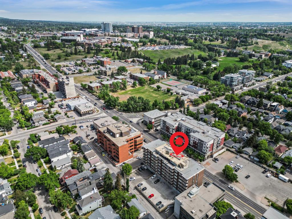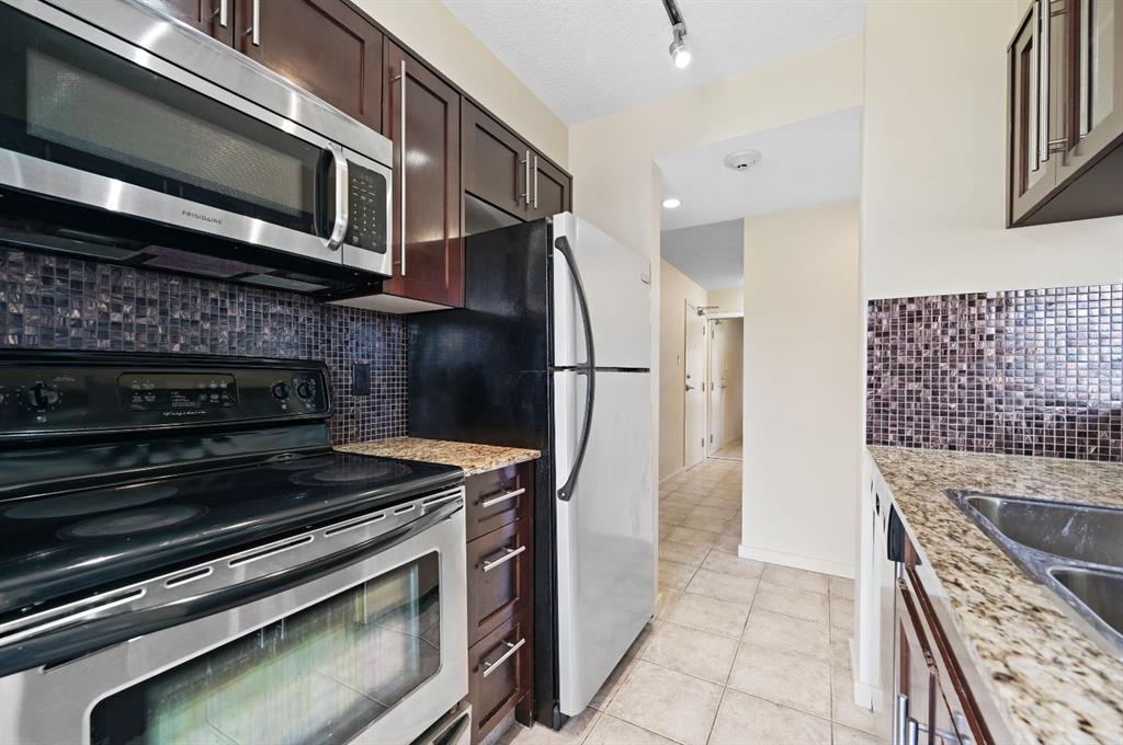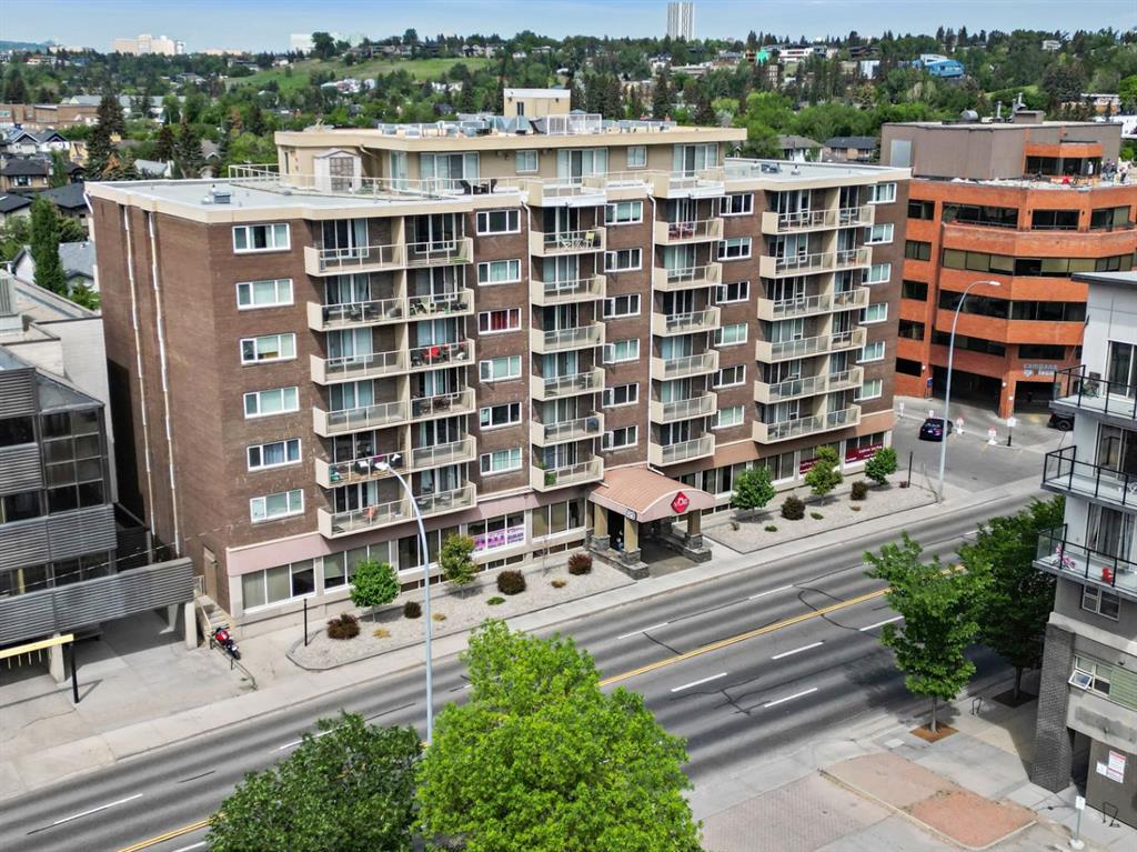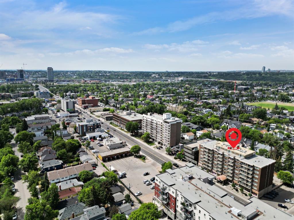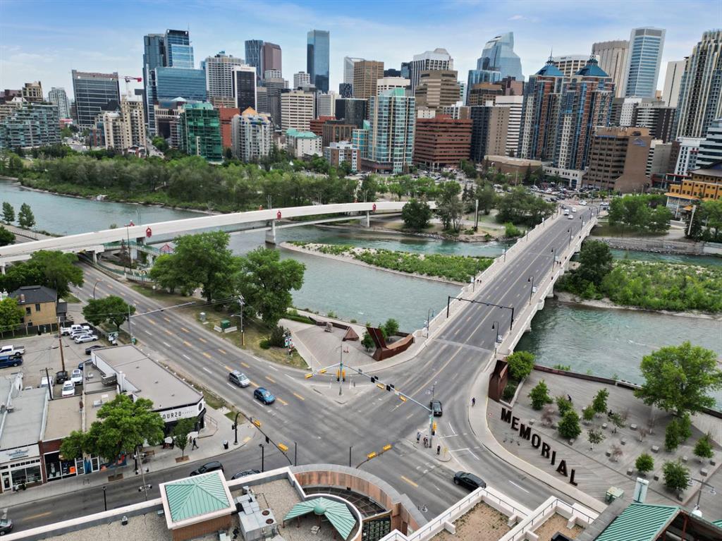This corner END unit showcases fantastic CITY SKYLINE VIEWS and must be seen. Very close to the downtown core in the heart of Hillhurst, and walking distance to the pubs, restaurants, and shops of Kensington. Stroll to the walking paths along the Bow River, beautiful Riley Park, and the Sunnyside LRT station and even up the hill to SAIT! In a concrete building, this 1-bedroom condo features a kitchen perfect for entertaining with eating bar, stainless steel appliances, granite countertops, mosaic tile backsplash, and darker stained cabinetry, a 5-piece bath with jetted tub and granite counters, cozy living room, IN-SUITE laundry, parking stall (#31) and separate private storage area (#31). The bedroom is separated from the living room and eating area for privacy and quiet. The Vue building offers a fully equipped exercise room with newer equipment and bike storage! The very low condo fee ($440/month) includes heat and water and sewer. Experience the great location, style and convenience of this condo and the Kensington area. Priced to sell.