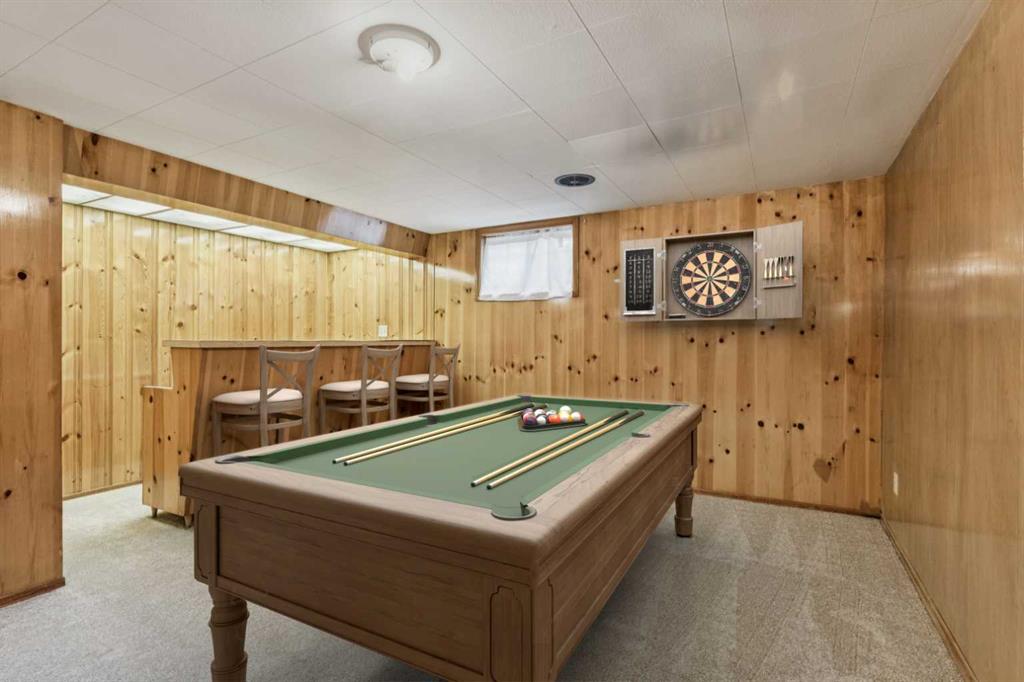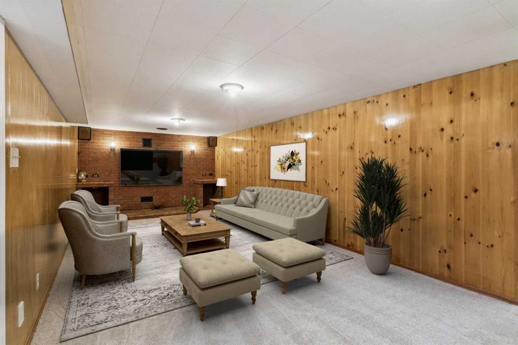 The main floor features two bedrooms, a four-piece bath, bright kitchen with bow window, and a living room with fireplace and formal dining area. The lower level includes a large rec room, den, laundry room, additional bath and more.