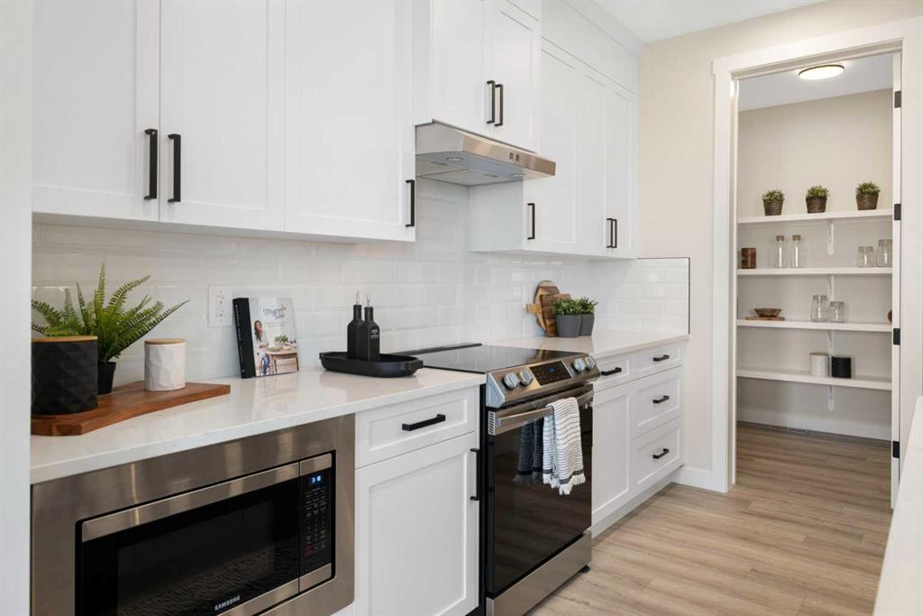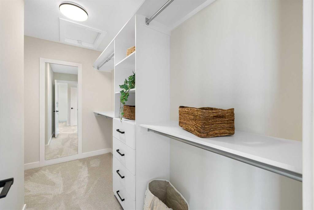 Upstairs, a grand staircase with white railings and matte black iron spindles leads to the luxurious primary bedroom, complete with a spa-like 5-piece ensuite featuring a freestanding tub, fully tiled walk-in shower, dual vanities, and an enclosed toilet. A custom walk-in closet with built-in shelving and organizers adds the finishing touch. Two additional spacious bedrooms and a full bathroom provide room for the whole family, while the tiled laundry room — complete with a quartz countertop — delivers everyday convenience.
