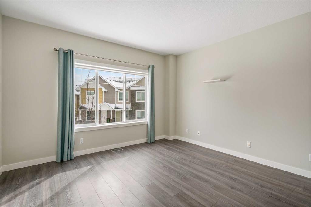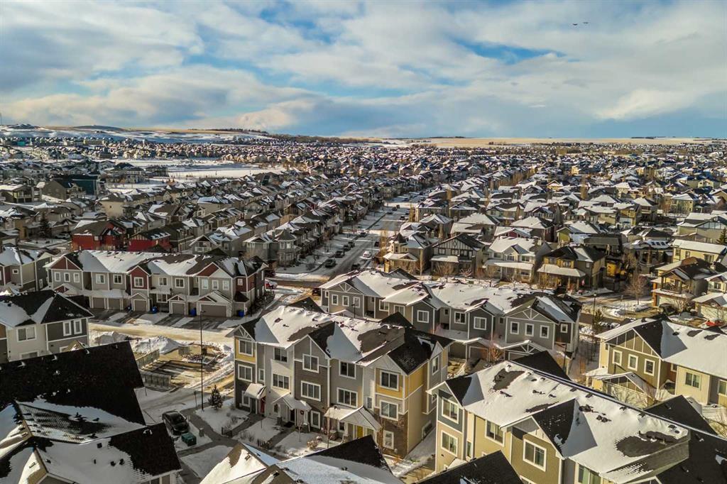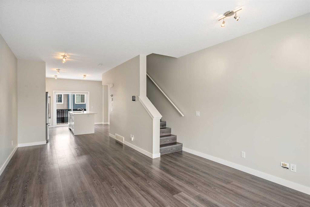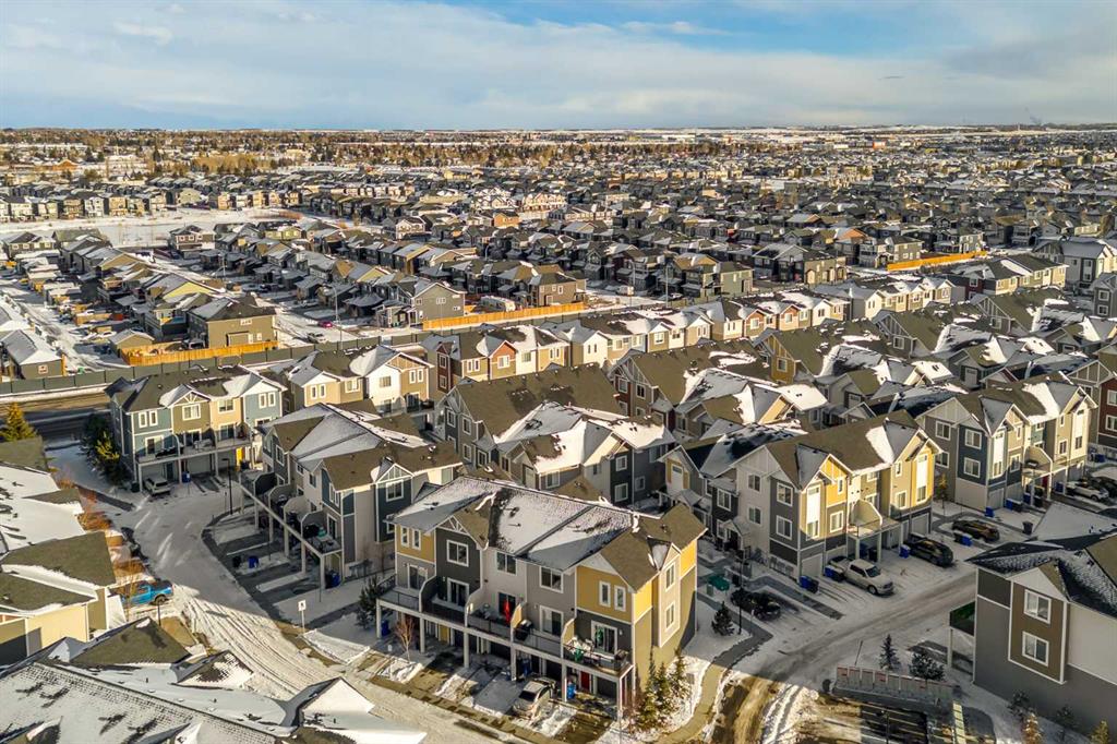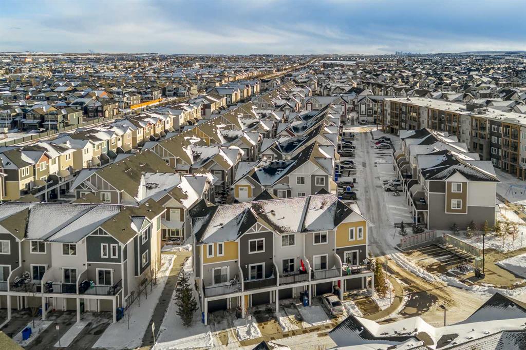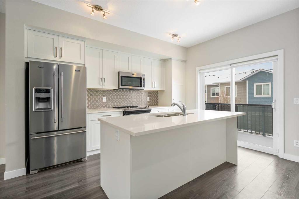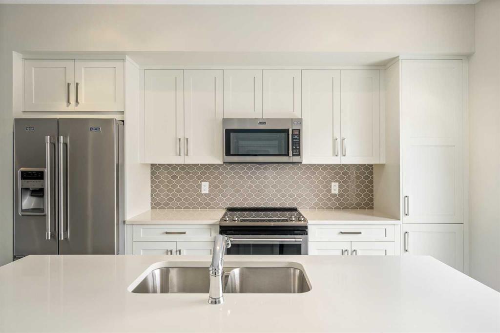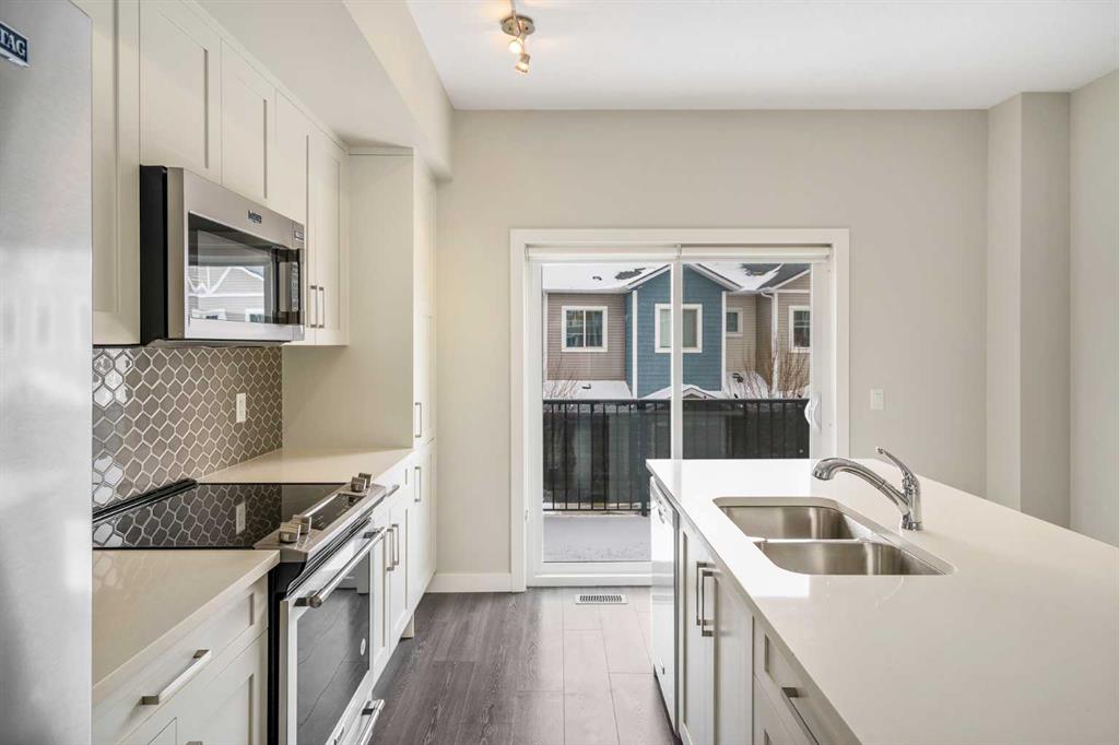 Welcome to this beautifully maintained 2-bedroom, 2.5-bathroom townhouse in the family-friendly community of Canals in Airdrie. This home offers AIR CONDITIONING, stylish upgrades, a bright and spacious white kitchen, and an oversized single attached garage. Alarm-monitored security system with features such as motion detectors, cameras, and smart doorbells will enhance your safety. Located in one of Airdrie’s most desirable communities, the Canals is known for its scenic walking and biking paths while still providing easy access to nearby shops, restaurants, schools, and everyday amenities. Upon entry, you’re welcomed by a spacious foyer, a convenient powder room, and a versatile flex space that can be used as a home office, gym, or additional living area. The main floor features a bright open-concept layout with 9-foot ceilings, creating an inviting atmosphere. The modern kitchen showcases an upgraded Maytag appliance package, quartz countertops, an under-mount sink, soft-close cabinetry, and a large centre island perfect for cooking and entertaining. Just off the kitchen is a spacious balcony with a gas line for BBQing. The generous dining and living areas provide plenty of room to relax or host guests. Upstairs, the primary bedroom features a 4-piece ensuite and generous closet space. A second spacious bedroom, another full 4-piece bathroom, and upper-level laundry