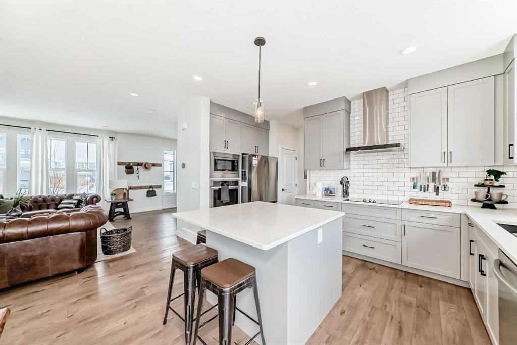 The beautifully appointed kitchen is a true centerpiece, complete with all stainless steel appliances, including a wall oven/microwave, electric cooktop, dishwasher, and fridge. Full-height cabinetry provides abundant storage, while the oversized island is perfect for entertaining and everyday living.