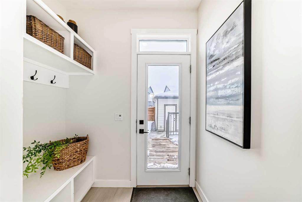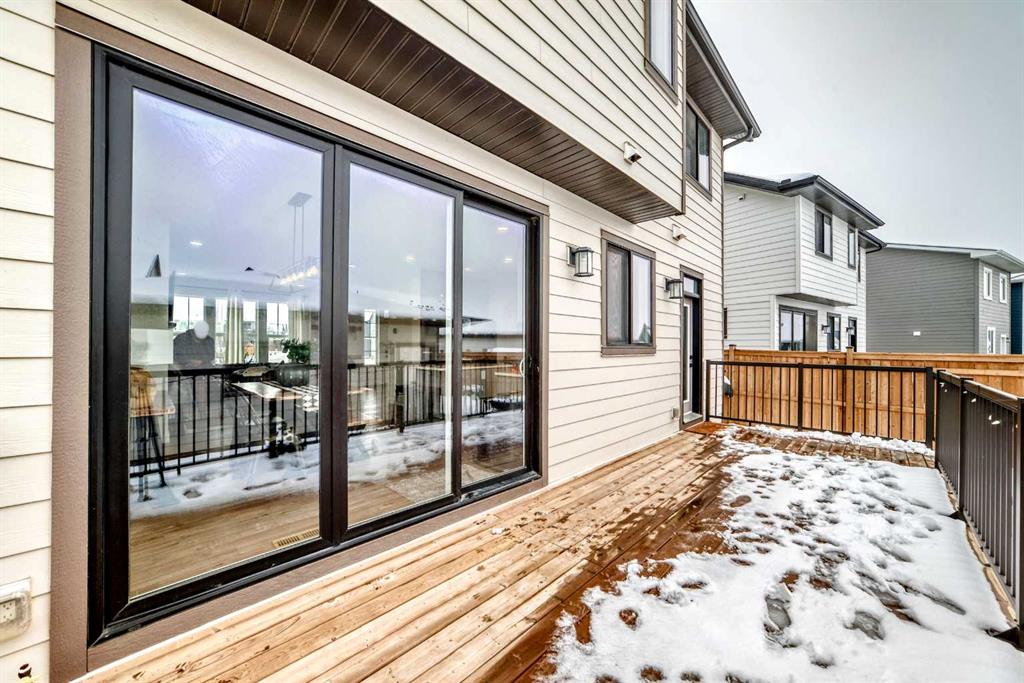 Step outside to your fully landscaped backyard oasis featuring a full-width deck, ornamental grasses, Rundle rock accents, and an automatic hose system—designed for both beauty and ease of maintenance.