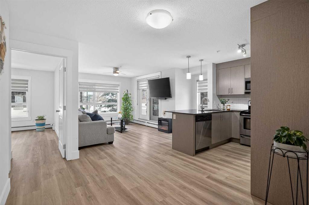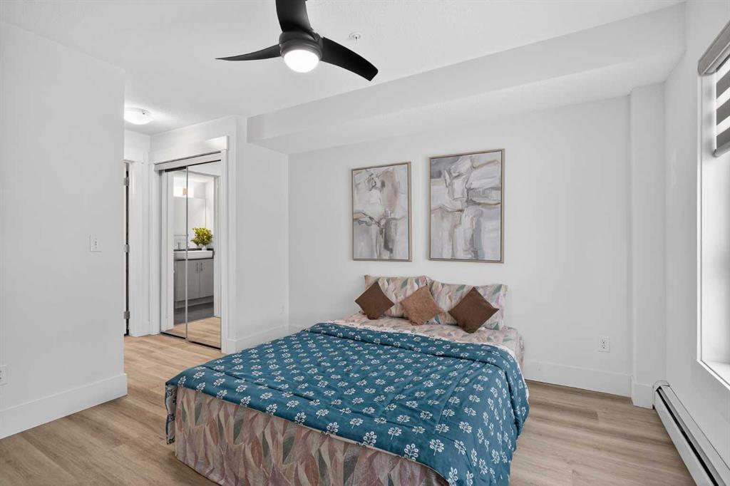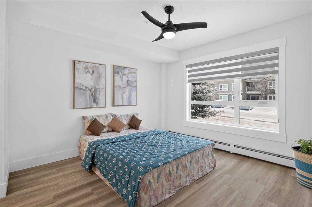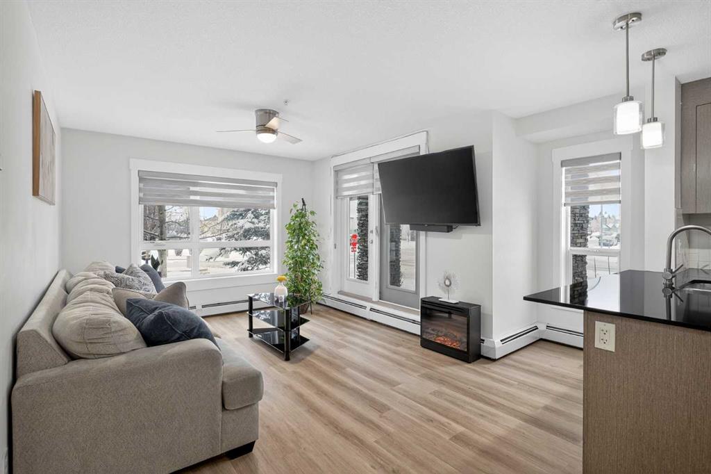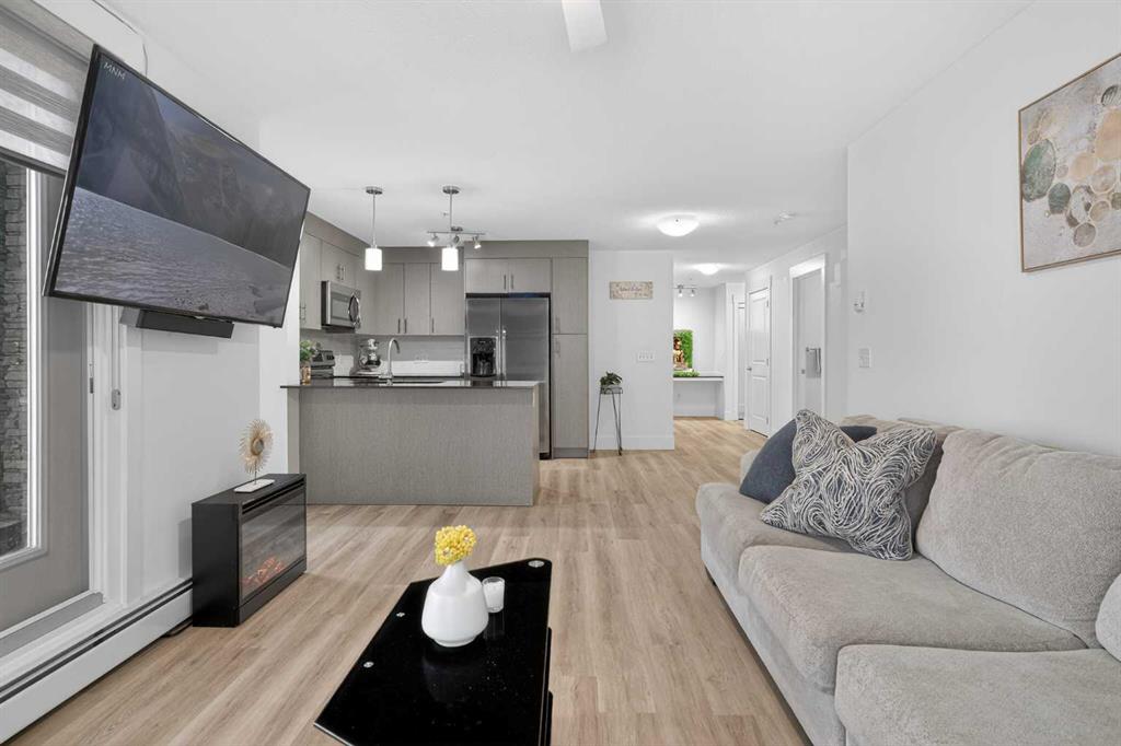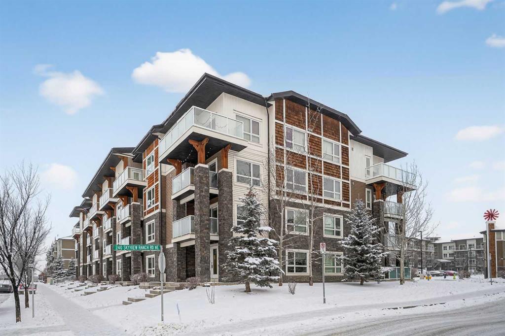 Discover exceptional ground-floor living in this brilliantly lit corner unit at #4106, 240 Skyview Ranch Road NE. Spanning roughly 940 square feet, this two-bedroom, two-bathroom residence welcomes you with a wonderfully spacious and dedicated entryway, instantly providing a house-like feel that keeps the main living areas distinct and clutter-free. Moving inside, the open-concept living room is bathed in gorgeous natural light courtesy of the coveted South and East-facing windows, creating a warm and inviting atmosphere throughout the day. The interior boasts a refined, modern aesthetic with crisp paint and durable luxury vinyl plank flooring, both newly updated in 2025. Cooking and entertaining are effortless in the stylish kitchen, beautifully finished with sleek quartz countertops, a casual breakfast bar, and a stainless steel appliance package. The primary bedroom serves as a private retreat complete with his and hers closets and a full ensuite bathroom, while the generous second bedroom and additional bathroom offer fantastic versatility for family or a home office. What truly sets this property apart is the unparalleled convenience of its layout. Ground-level patio doors open directly to the outside, allowing you to bypass elevators and communal hallways entirely. This creates a seamless daily routine, especially for families, as students can step out the door and stroll straight across the street to Prairie Sky School. Outdoor enthusiasts will love having soccer and baseball fields just steps away, and commuting is a breeze with a nearby bus stop and quick access to local restaurants and shopping. Complete with a heated underground parking stall conveniently located right next to the elevator, plus abundant street parking directly outside your patio for guests or a second vehicle, this home flawlessly combines smart design with an unbeatable, walkable lifestyle.