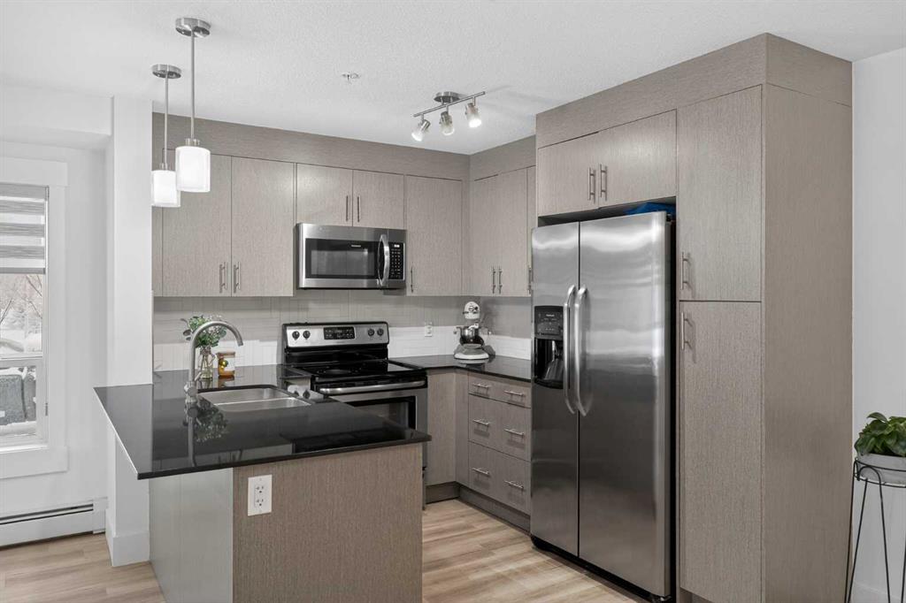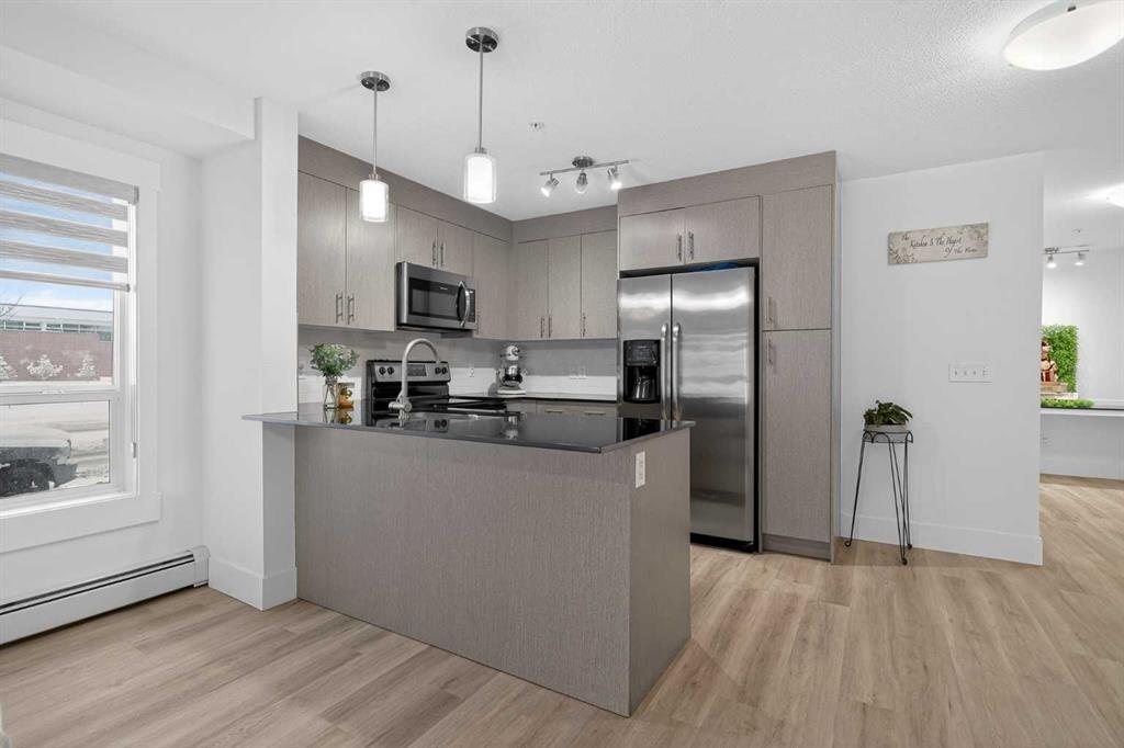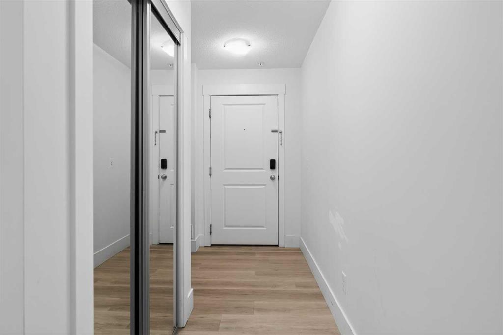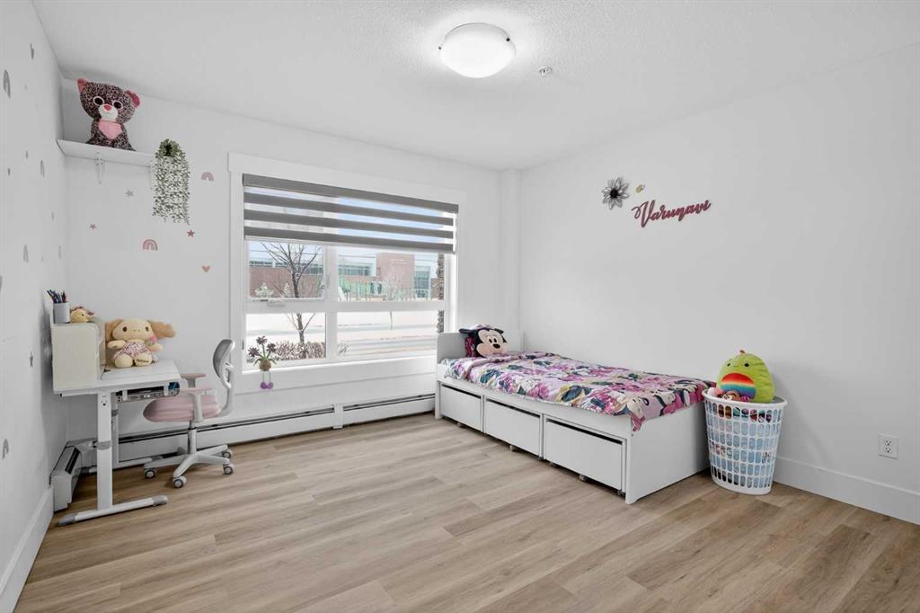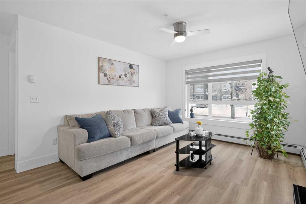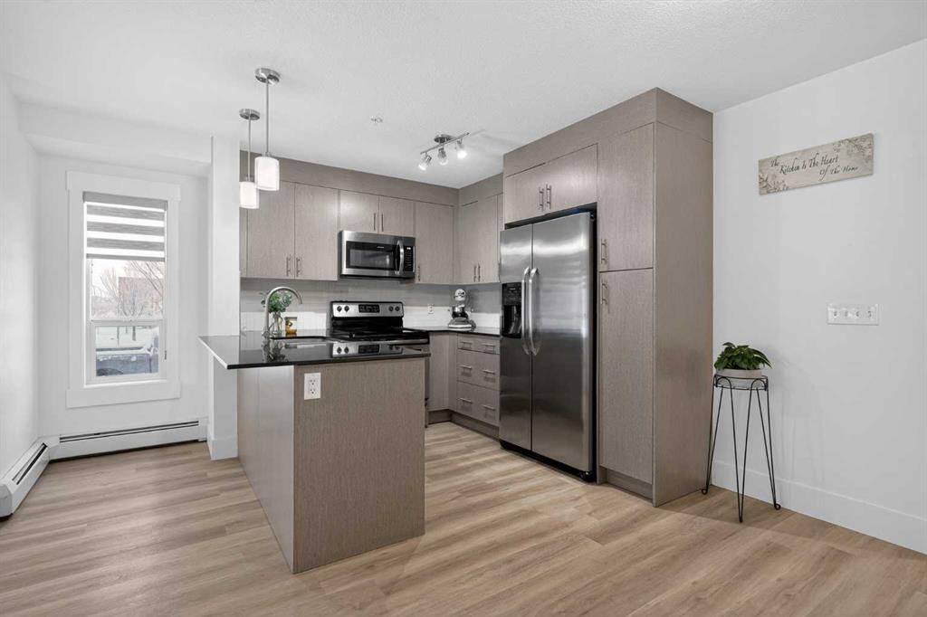 Discover exceptional ground-floor living in this brilliantly lit corner unit at #4106, 240 Skyview Ranch Road NE. Spanning roughly 940 square feet, this two-bedroom, two-bathroom residence welcomes you with a wonderfully spacious and dedicated entryway, instantly providing a house-like feel that keeps the main living areas distinct and clutter-free. Moving inside, the open-concept living room is bathed in gorgeous natural light courtesy of the coveted South and East-facing windows, creating a warm and inviting atmosphere throughout the day. The interior boasts a refined, modern aesthetic with crisp paint and durable luxury vinyl plank flooring, both newly updated in 2025. Cooking and entertaining are effortless in the stylish kitchen, beautifully finished with sleek quartz countertops, a casual breakfast bar, and a stainless steel appliance package. The primary bedroom serves as a private retreat complete with his and hers closets and a full ensuite bathroom, while the generous second bedroom and additional bathroom offer fantastic versatility for family or a home office. What truly sets this property apart is the unparalleled convenience of its layout. Ground-level patio doors open directly to the outside, allowing you to bypass elevators and communal hallways entirely. This creates a seamless daily routine, especially for families, as students can step out the door and stroll straight across the street to Prairie Sky School. Outdoor enthusiasts will love having soccer and baseball fields just steps away, and commuting is a breeze with a nearby bus stop and quick access to local restaurants and shopping. Complete with a heated underground parking stall conveniently located right next to the elevator, plus abundant street parking directly outside your patio for guests or a second vehicle, this home flawlessly combines smart design with an unbeatable, walkable lifestyle.