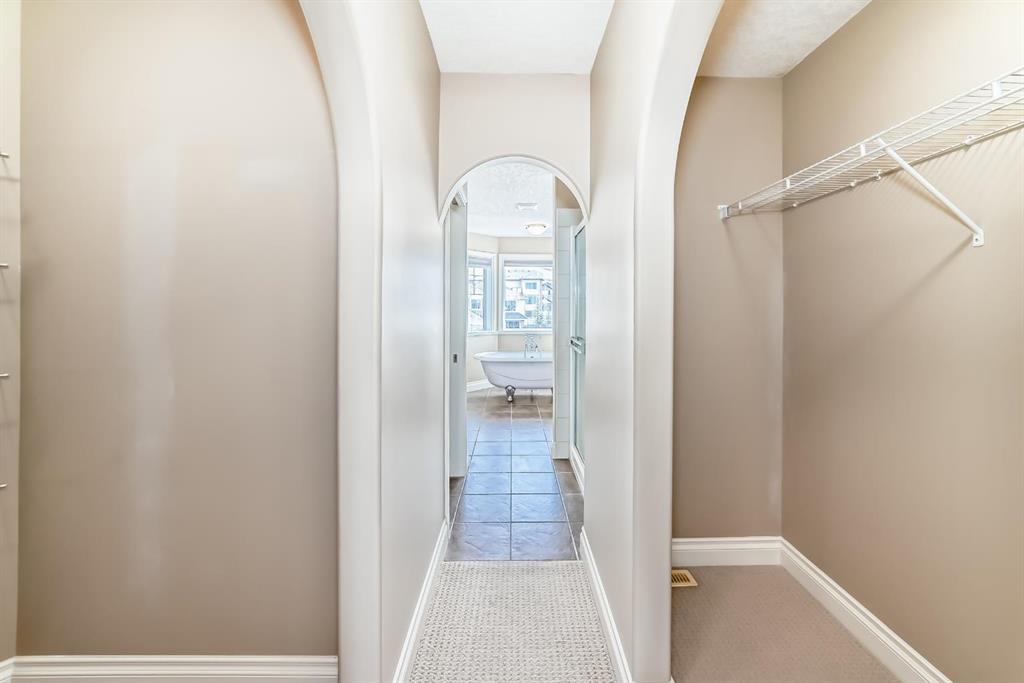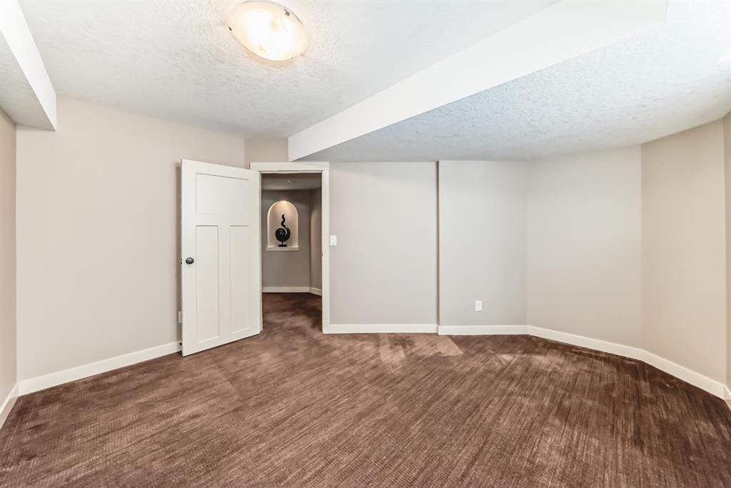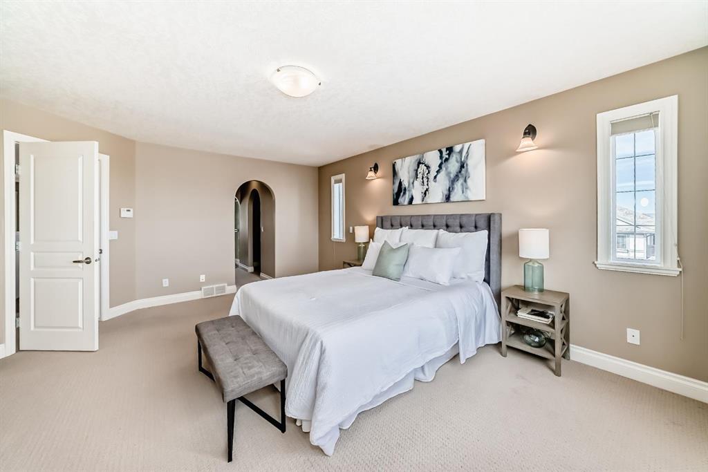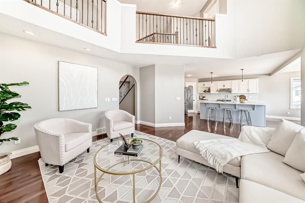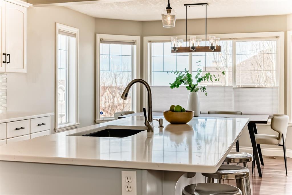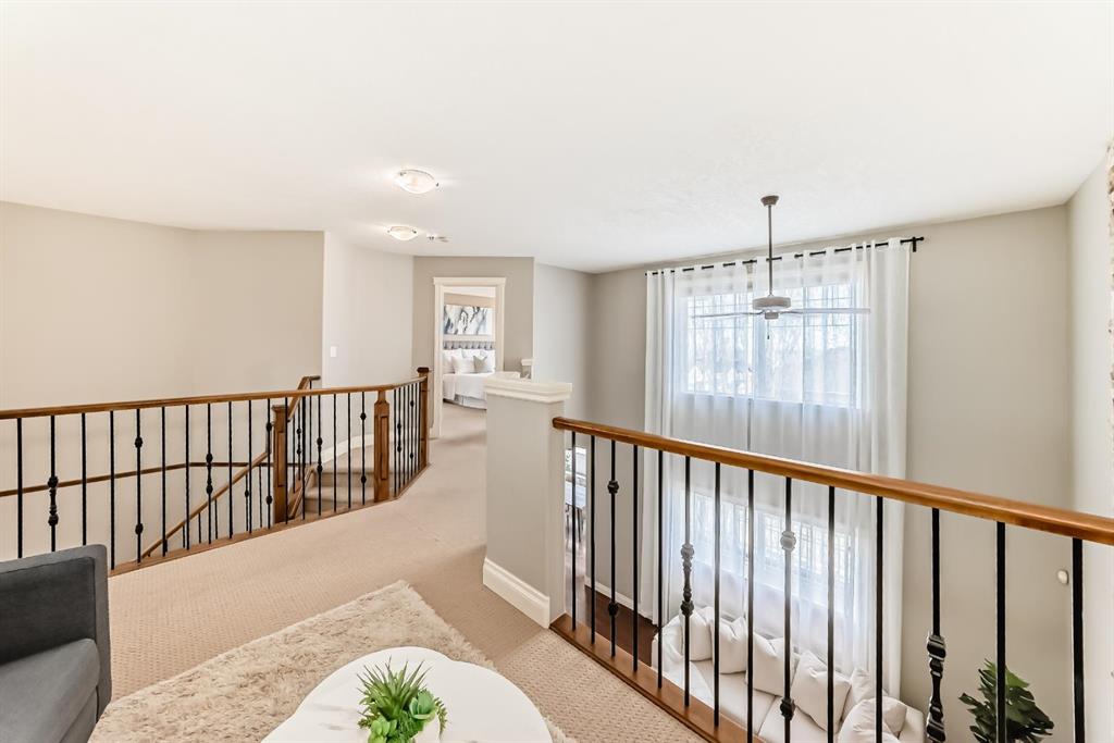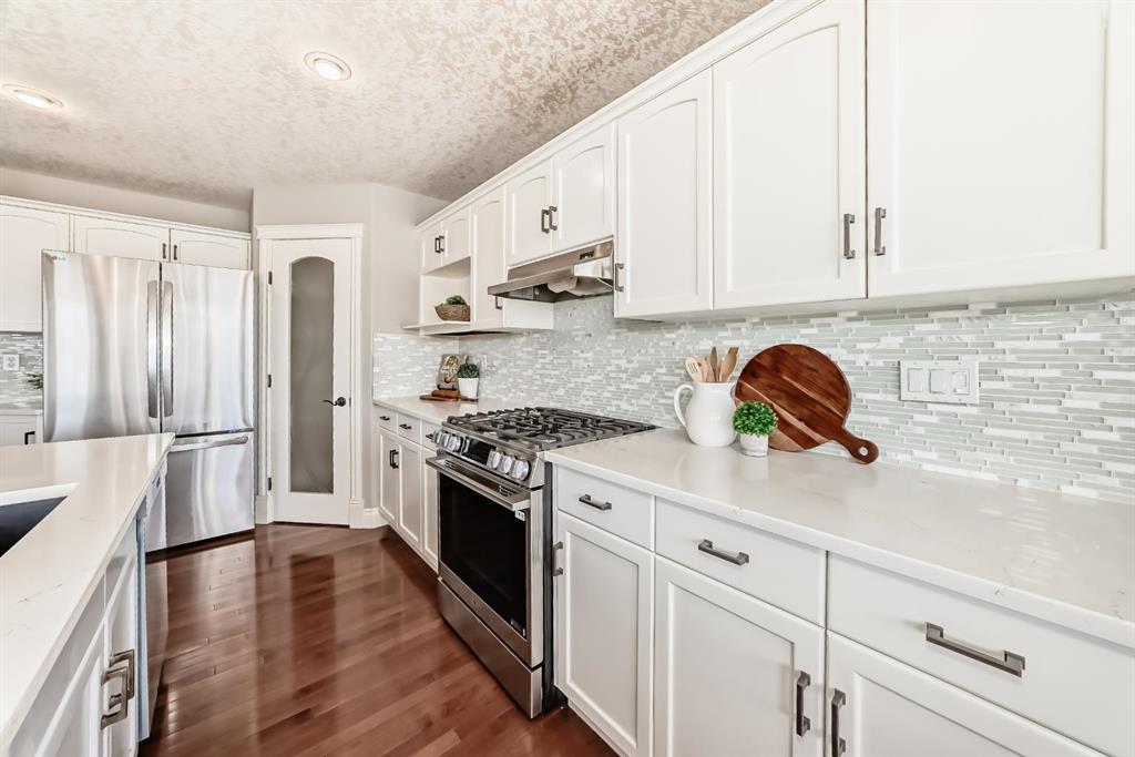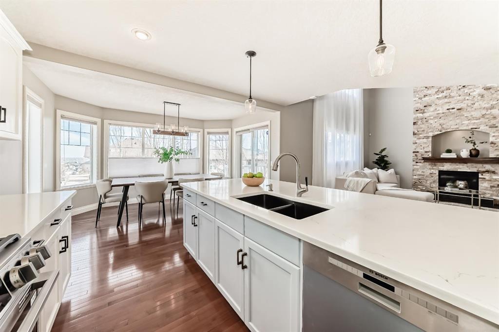 The spacious kitchen is equipped with upgraded granite countertops, a centre island with raised eating bar, and all brand new premium appliances, making it ideal for family gatherings and entertaining. Upstairs you will find three generously sized bedrooms, a flexible bonus space, and a full bathroom. The large primary suite features a walk-in closet and a bright 5-piece ensuite with bay windows, a separate shower, and a classic clawfoot tub. The fully finished walkout basement includes a fourth bedroom, full bathroom, and a large entertainment/media room with a custom wet bar and granite counters, perfect for hosting family and friends. Upgrades include updated kitchen and bathroom counters, hardwood and tile flooring, air conditioning, all new appliances, and a new roof (2025). The fully landscaped and fenced backyard features a maintenance-free deck, creating a perfect outdoor space to relax or entertain. Ideally located close to top schools, scenic pathways and ravines, shopping, restaurants, golf courses, Costco, Canadian Tire, public transit, and with easy access to Stoney Trail and Calgary International Airport. A rare opportunity to own a beautiful walkout home in one of NW Calgary’s most desirable family communities.