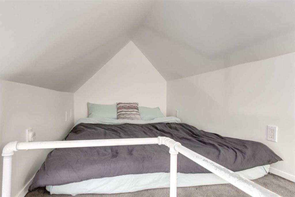 Large windows fill the home with natural light, creating bright and welcoming living spaces. The fully renovated bathroom features a stylish dual-sink vanity, while the front bedroom impresses with soaring vaulted ceilings and a whimsical ladder-access loft, perfect as a play space, reading nook, or creative bunk-bed setup.