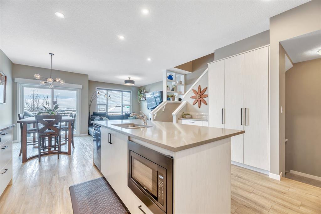 Welcome to 840 Seton Circle SE, a beautifully maintained and thoughtfully upgraded home offering stylish living in one of Calgary’s most vibrant and amenity-rich communities. From the moment you arrive, the charming front pergola and beautiful landscaping creates a warm first impression and leads you into a spacious foyer with a front closet and extra window for natural lighting. Step inside and you’ll immediately notice the bright, open-concept layout enhanced by natural light streaming in from the SW facing backyard. The main living area flows to create an inviting space. At the heart of the home is the stunning kitchen, designed with both function and style in mind. A large central island provides ample prep space and seating, while ceiling-height cabinetry, quartz countertops, a classic subway tile backsplash add timeless style. The stainless appliances complement the space beautifully, and two custom built-in pantries and built in tech desk provides exceptional storage and organization. Just off the kitchen, the dining area comfortably accommodates a large table and offers easy access through sliding patio doors to the rear deck, making indoor-outdoor entertaining seamless during the summer months. The sun-filled living room features large windows, a custom crafted electric fireplace and provides a comfortable place to unwind. Completing the main level is a convenient powder room with a gorgeous walnut vanity and access through a spacious mudroom with even more built in custom cabinetry to the single attached garage.