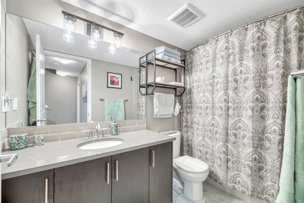 The primary suite is situated at the back of the home, offers unobstructed mountain views to enjoy year-round. The spacious ensuite includes a tiled shower, double vanity with quartz counters, and a large walk-in closet featuring custom built-in organizers. Central air conditioning and ceiling fan ensures year-round comfort. Two additional generously sized bedrooms, a stylish four-piece bathroom, and the convenience of upper-level laundry complete this floor.