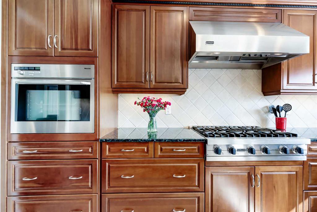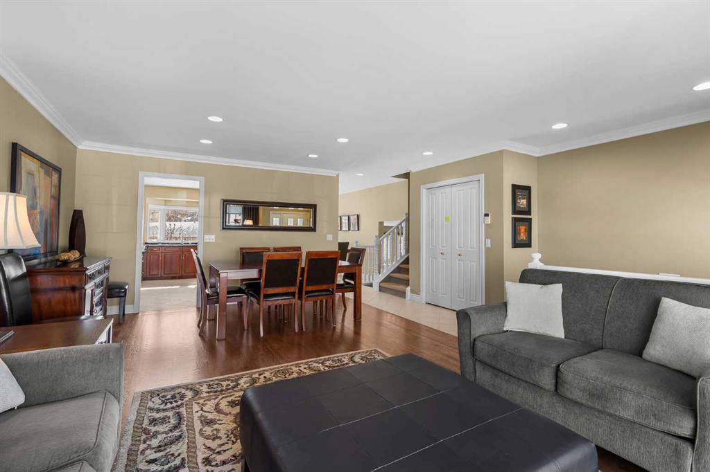 Lovingly cared for and thoughtfully upgraded over the years, this welcoming split-style home offers comfort, quality craftsmanship, and an exceptional location. The bright and inviting front living room is filled with natural light and flows seamlessly into the dining area, creating a warm and functional space for everyday living as well as entertaining guests. The beautifully renovated kitchen has been expanded to include a large island, providing a more open and efficient layout. It showcases rich cherry wood cabinetry, elegant granite countertops, and an impressive collection of high-end appliances including Viking, Miele, and Dacor. Cooking enthusiasts will appreciate the powerful 650 CFM hood fan system, professionally interlocked to the furnace and make-up air fans for optimal ventilation. The upper level features a generous primary bedroom retreat complete with a renovated ensuite highlighted by an oversized shower enclosure. Two additional well-sized bedrooms provide comfortable space for family or guests, while the renovated main family bathroom offers modern finishes and functionality. The third level adds even more versatile living space, boasting a spacious family room with large, bright windows that fill the area with natural light. This level also includes a fourth bedroom/den/laundry room and an upgraded two-piece powder room, making it ideal for guests, teenagers, or a private work-from-home setup. The developed basement provides additional flexible space perfect for a home office, hobby area, or recreation room. Numerous key upgrades have been completed throughout the home, including replacement of all windows with triple-pane units where possible and double-pane elsewhere, along with updated front and garden doors. Hardwood flooring adds warmth and character to the living and dining rooms, while heated tile floors provide comfort in select areas of the home. Attic insulation was upgraded with blown-in insulation in 2016, and the roof shingles were replaced with durable 30-year shingles in 2019. The oversized front-attached garage is insulated and drywalled, offering excellent storage and workspace potential. Outside, the fully fenced and beautifully landscaped backyard provides a peaceful and private retreat, highlighted by a stunning mature weeping birch tree, irrigation system and backs onto a large green space for added privacy and open views. Ideally located with excellent access to schools, shopping, city transit, and the expansive pathways and natural beauty of Nose Hill Park, this property represents a wonderful opportunity to own a meticulously maintained and extensively upgraded home in a highly desirable setting.