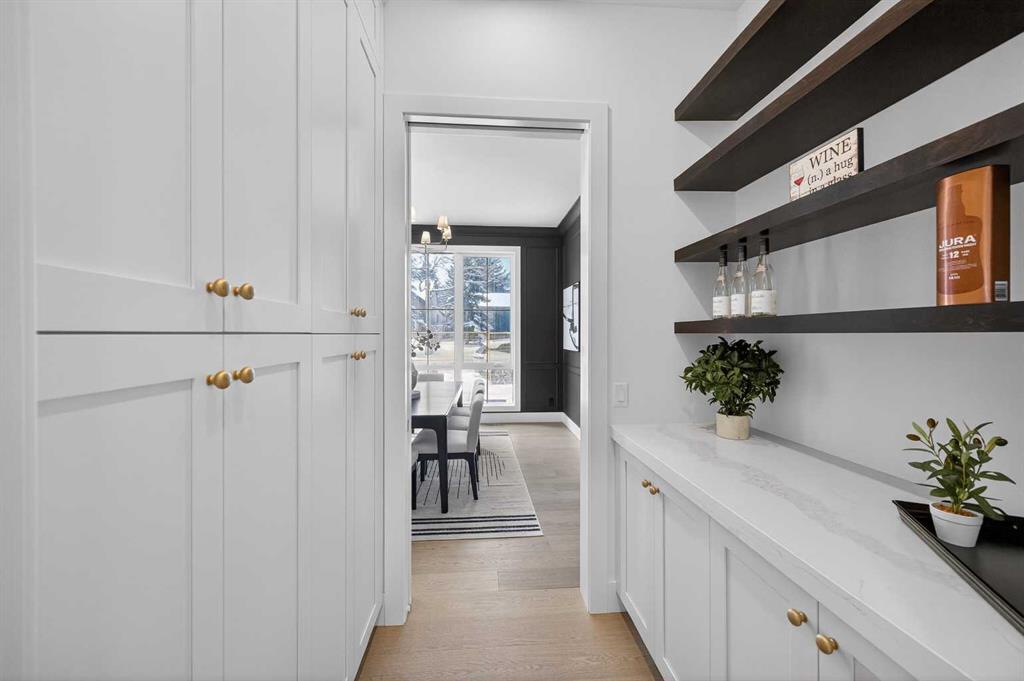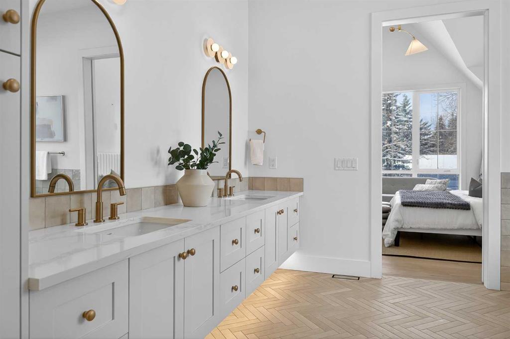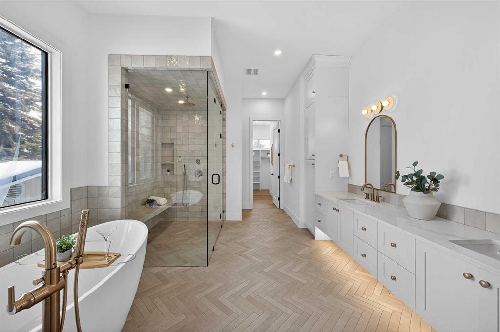The upstairs Primary Suite serves as a private sanctuary featuring a vaulted ceiling and a bespoke walk-in closet with a central island. The spa-like ensuite offers the ultimate in comfort with heated floors finished in a stunning herringbone pattern tile. For ultimate family convenience, every secondary bedroom on the second floor also includes its own private washroom and walk-in closet. The expansive lower level significantly extends the living space and features heated floors throughout for year-round comfort. This basement includes three additional spacious bedrooms, a luxurious 5-piece bathroom, and an incredible recreation area complete with a sprawling family room and a full bar, perfectly appointed for movie nights or hosting guests.