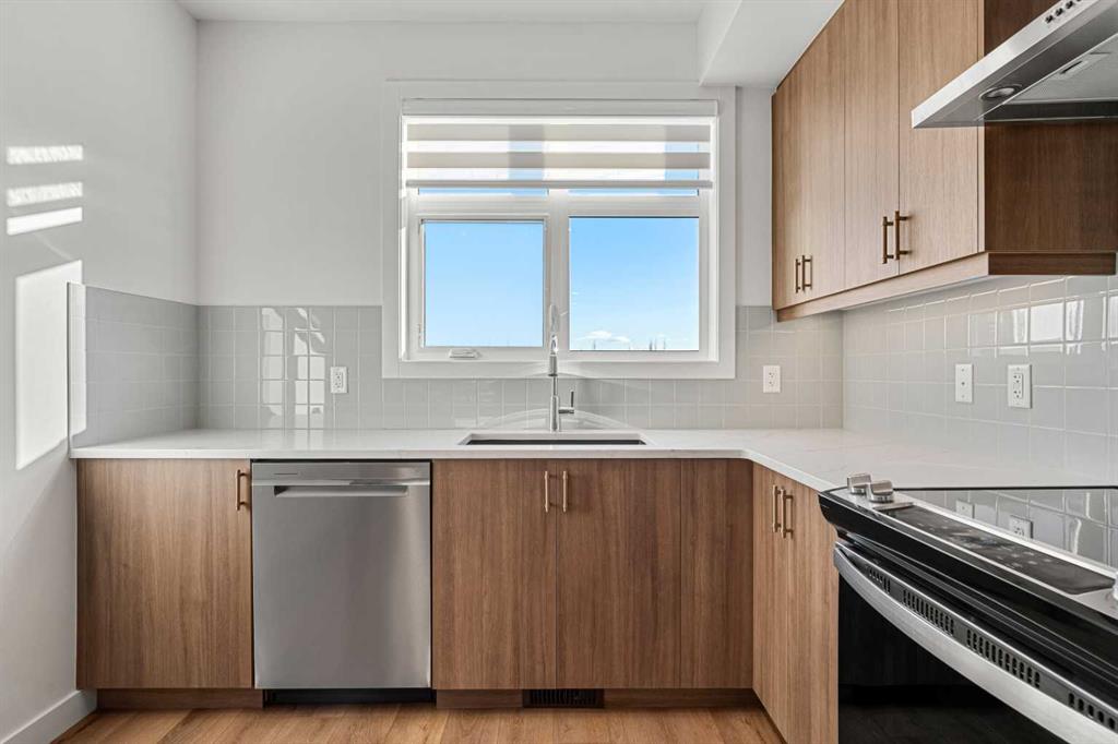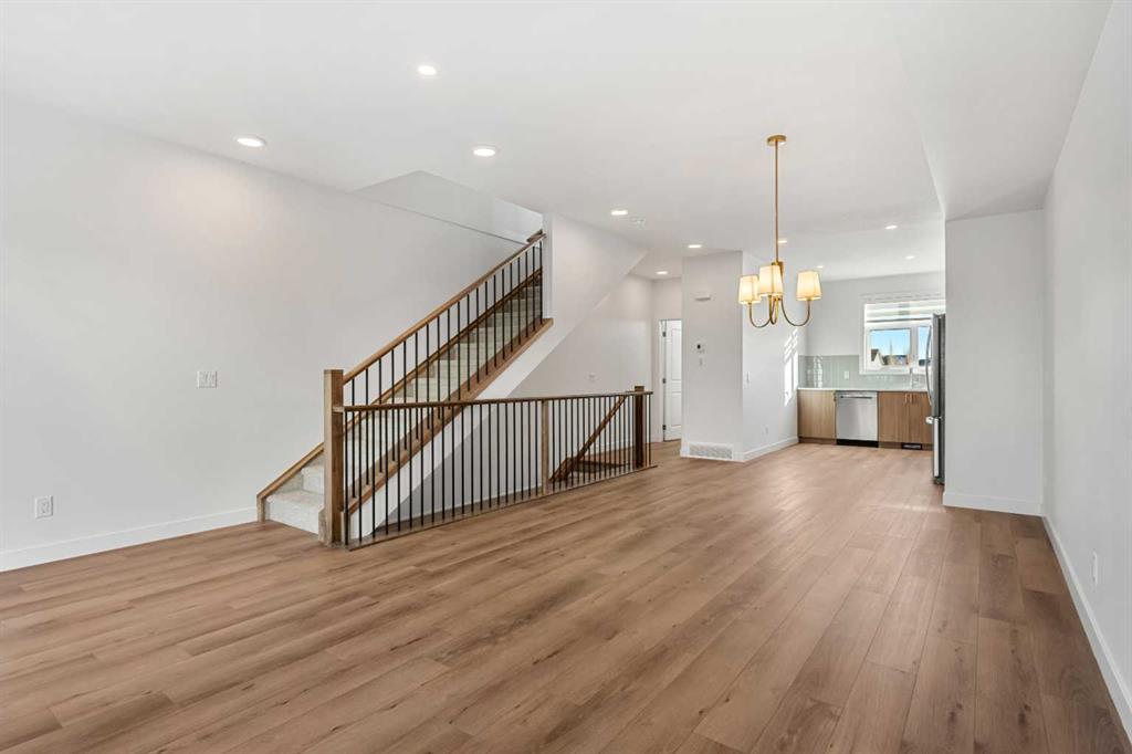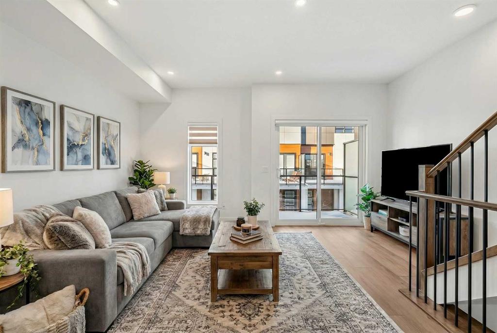 Welcome to this beautifully appointed townhome in the highly desirable West 83 community in West Springs. Offering over 1,300 square feet of thoughtfully designed living space, this modern residence blends contemporary style with everyday comfort. The bright and open main floor creates an inviting atmosphere, where the living room, dining area, and kitchen flow seamlessly together, providing an ideal setting for both relaxed daily living and elegant entertaining.
