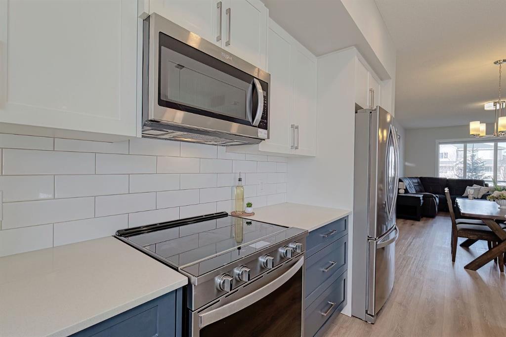 The main level showcases a beautifully appointed kitchen that will impress any home chef, complete with a large central island, quartz countertops, Whirlpool stainless steel appliances, and a French door refrigerator with an interior ice maker. The eye-catching two-tone cabinetry, upgraded drawer storage, and thoughtful design details elevate both style and functionality. The adjoining dining area and spacious living room create a seamless flow—perfect for entertaining or relaxing—with added lighting and window coverings enhancing the space.