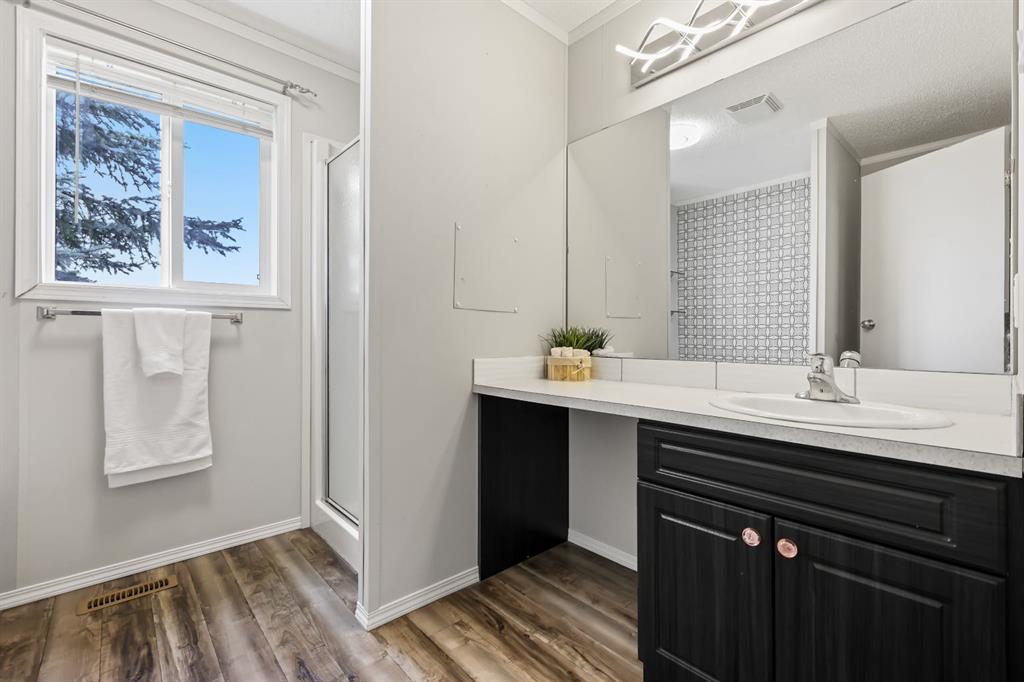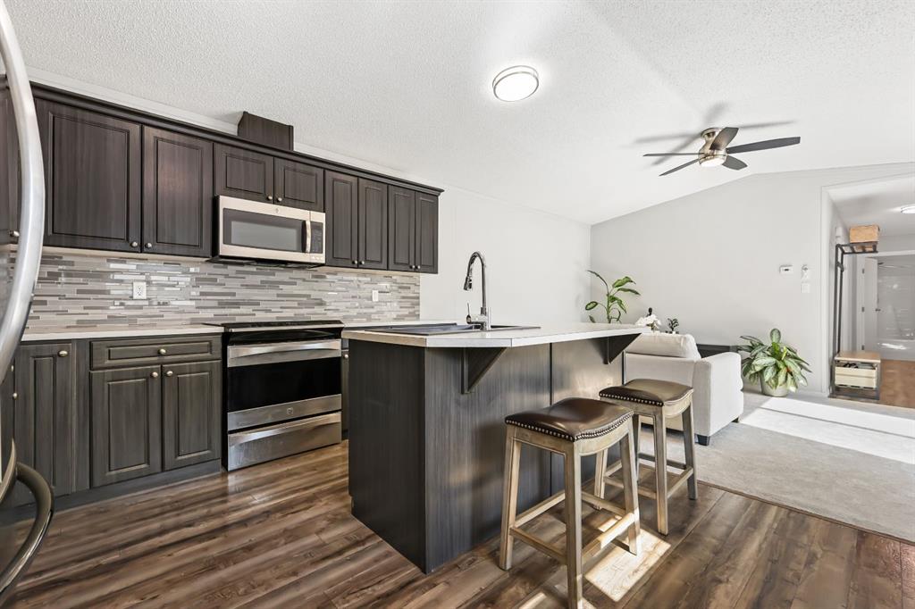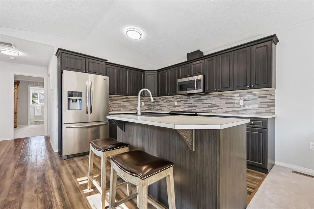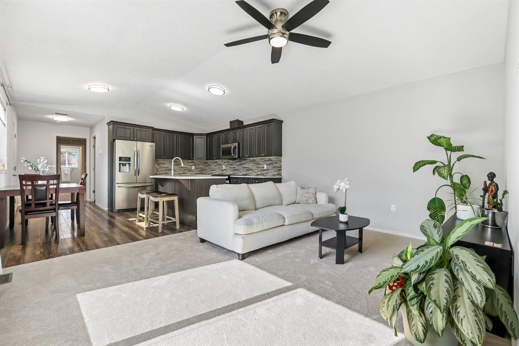 Welcome to this beautifully updated mobile home in the heart of Okotoks, offering modern finishes and a bright, inviting layout. The heart of the home is the huge kitchen featuring sleek stainless steel appliances, a kitchen island, and ample counter and cabinet space—perfect for cooking and entertaining. The spacious primary bedroom is a true retreat with a large walk-in closet and a spa-inspired 4-piece ensuite - with a soaker tub!. The two additional well-sized bedrooms and 4pc bathroom are on the opposite side of the home, providing lots of privacy. Enjoy the natural light pouring through large windows and relax in your south facing, private backyard. Step outside onto the impressive 40' x 11' deck, ideal for summer BBQs, and make use of the large shed for all your storage needs. Recent upgrades include new HWT (2024), fresh paint throughout the main living areas and brand new carpet in the living room and primary bedroom, making this home completely move-in ready. Some added bonuses to this home is the carport AND additional 2 parking spots, and backing onto green space! Walking distance to downtown Okotoks, close to many walking paths and parks. Don’t miss the opportunity to live in this welcoming community with all the charm Okotoks has to offer! This mobile home park is one of the best maintained parks in Alberta, and this home truly has it all - come see it today! Monthly lot fees are $1270 and include sewer, water, garbage and land tax (home tax is separate). Buyer Approval is required by Cove Communities.