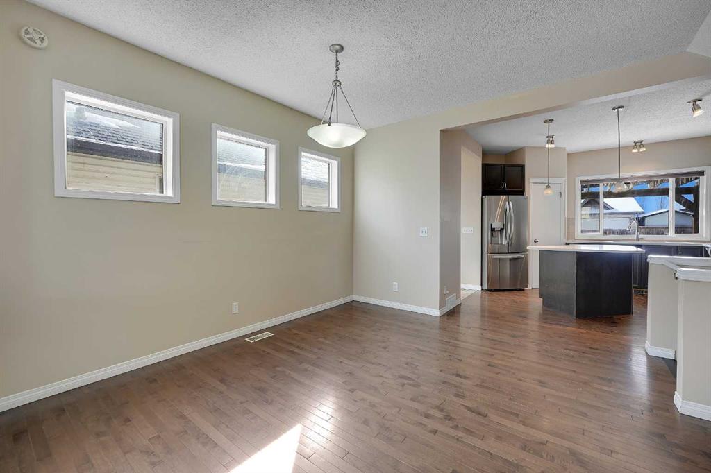 The main floor features an open-concept design with hardwood flooring and large windows that bring in plenty of natural light. The living room is centered around a stone-faced fireplace, creating a warm and inviting space. The adjoining dining area flows seamlessly into the kitchen, making it well-suited for both everyday living and entertaining.