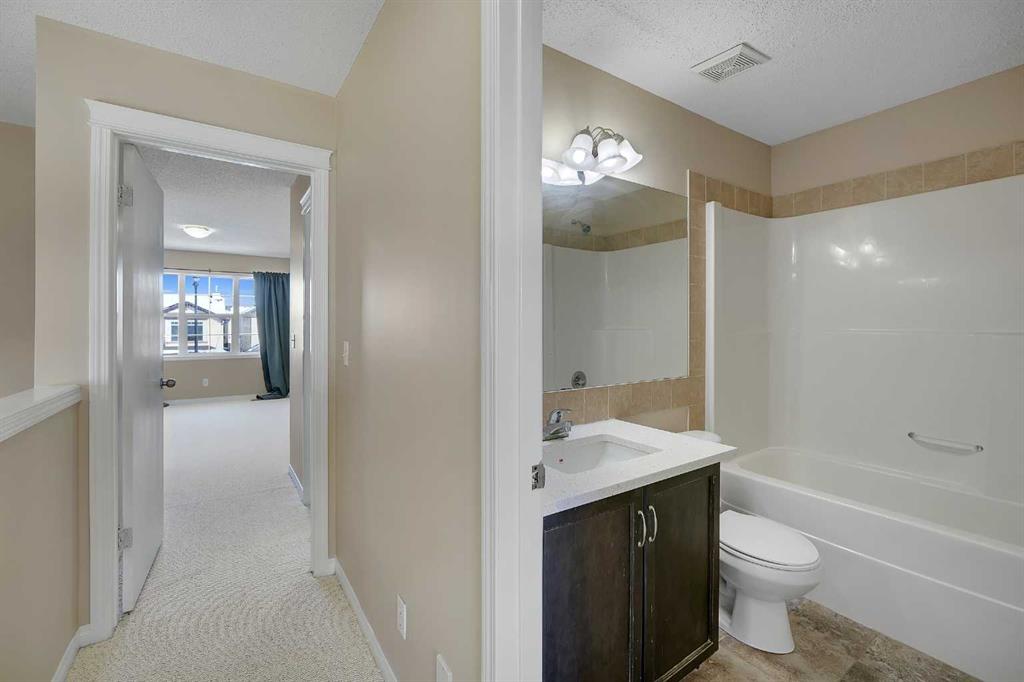 Upstairs, the primary bedroom offers a spacious retreat with a large window, an oversized walk-in closet, and a well-appointed ensuite complete with a soaker tub, separate glass shower, and generous counter space. Two additional bedrooms and a full bathroom complete the upper level.