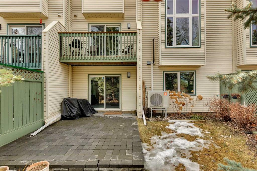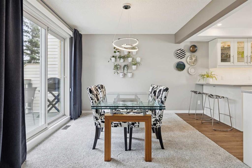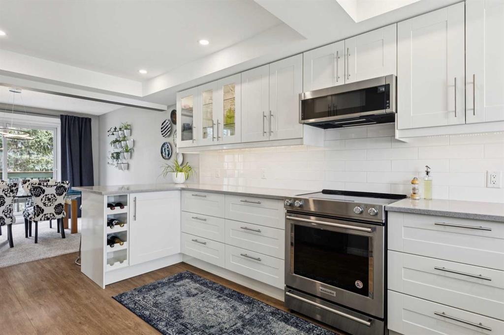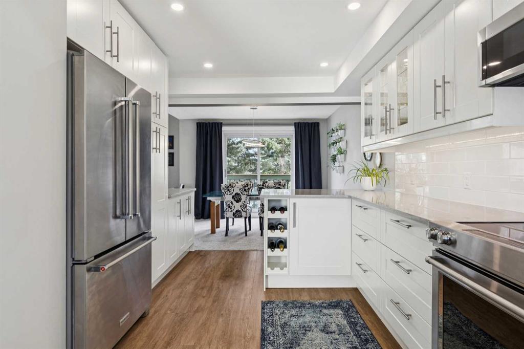 Move-in ready, and designed for both comfort and function, this fully updated townhome offers a rare combination of quality renovations, thoughtful layout, and an exceptional outdoor setting. The main floor has been completely elevated by a fully renovated half bathroom with high efficiency toilet, professionally renovated kitchen, featuring quartz countertops, soft-close cabinetry with a hidden interior drawer, drawer and under-cabinet lighting, and a window overlooking the front street that fills the space with natural light. The adjacent dining area opens directly onto the patio through sliding doors, creating a seamless indoor-outdoor flow. The living room is a standout, with soaring vaulted ceilings, expansive windows with a cozy built-in window seat adding both charm and functionality making this space feel open and inviting. Upstairs, the open-to-below design enhances the sense of space and light. Both bedrooms feature their own ensuite bathrooms, a rare and highly desirable layout. The secondary bedroom includes day & night honeycomb shades, a Murphy bed (optional inclusion), and a fully renovated ensuite complete with a soaker tub, high efficiency toilet, luxury vinyl plank flooring, and under-cabinet lighting.