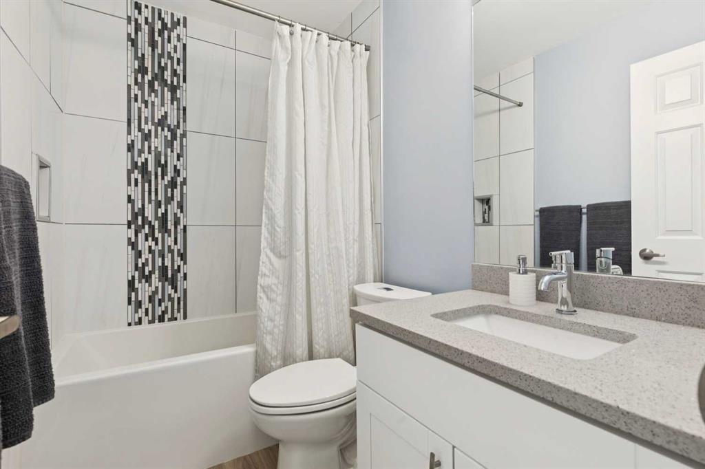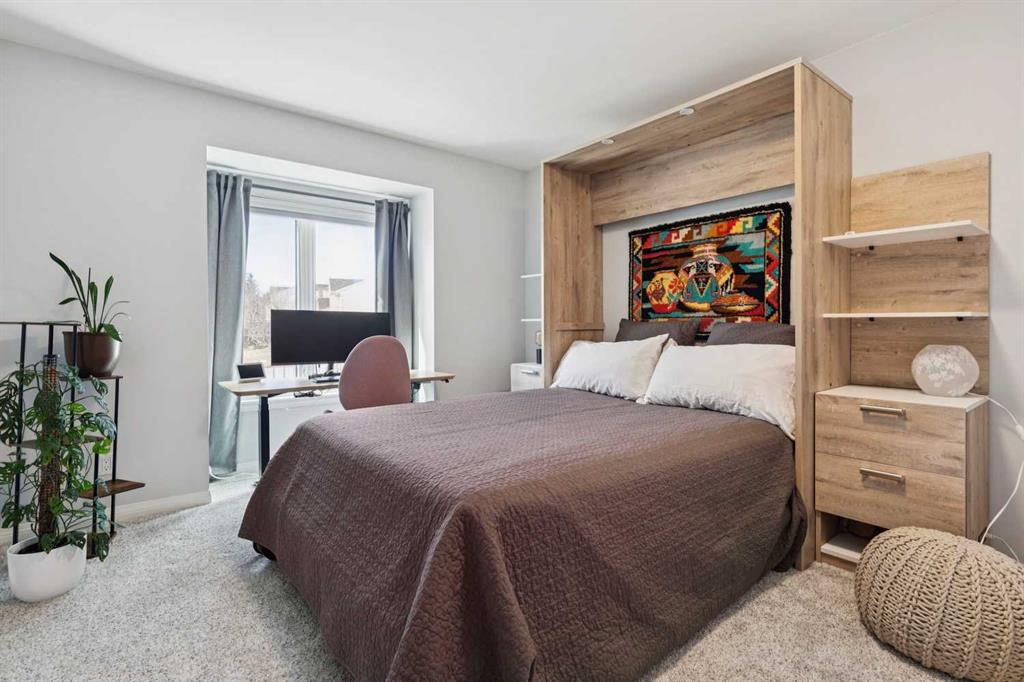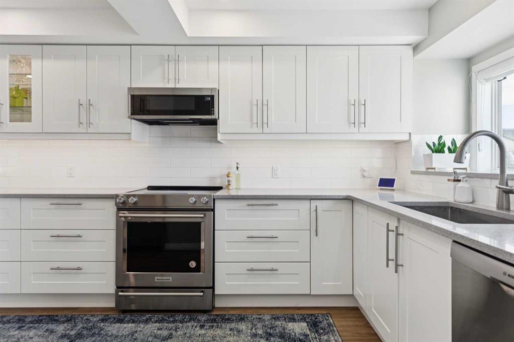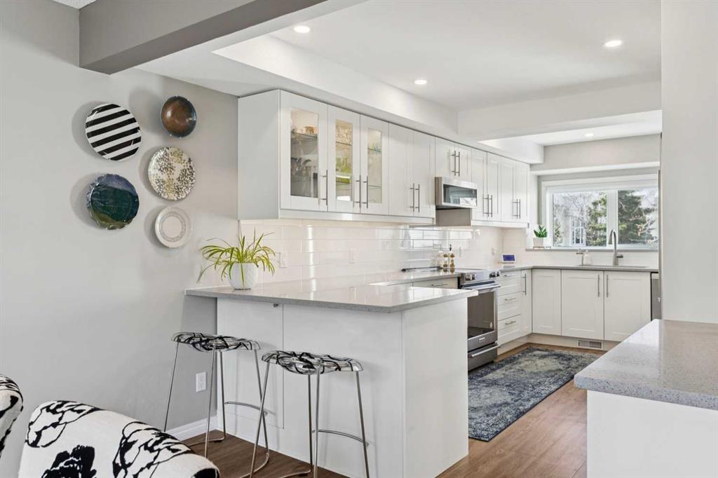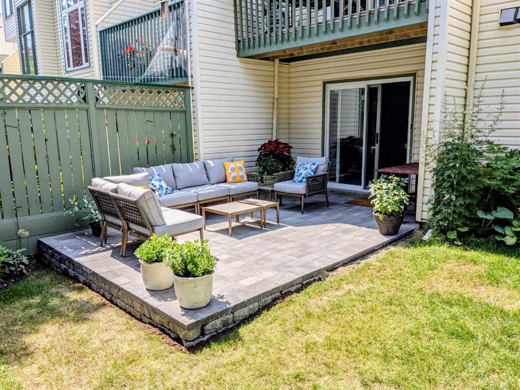 Move-in ready, and designed for both comfort and function, this fully updated townhome offers a rare combination of quality renovations, thoughtful layout, and an exceptional outdoor setting. The main floor has been completely elevated by a fully renovated half bathroom with high efficiency toilet, professionally renovated kitchen, featuring quartz countertops, soft-close cabinetry with a hidden interior drawer, drawer and under-cabinet lighting, and a window overlooking the front street that fills the space with natural light. The adjacent dining area opens directly onto the patio through sliding doors, creating a seamless indoor-outdoor flow. The living room is a standout, with soaring vaulted ceilings, expansive windows with a cozy built-in window seat adding both charm and functionality making this space feel open and inviting. Upstairs, the open-to-below design enhances the sense of space and light. Both bedrooms feature their own ensuite bathrooms, a rare and highly desirable layout. The secondary bedroom includes day & night honeycomb shades, a Murphy bed (optional inclusion), and a fully renovated ensuite complete with a soaker tub, high efficiency toilet, luxury vinyl plank flooring, and under-cabinet lighting.