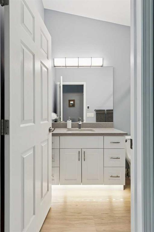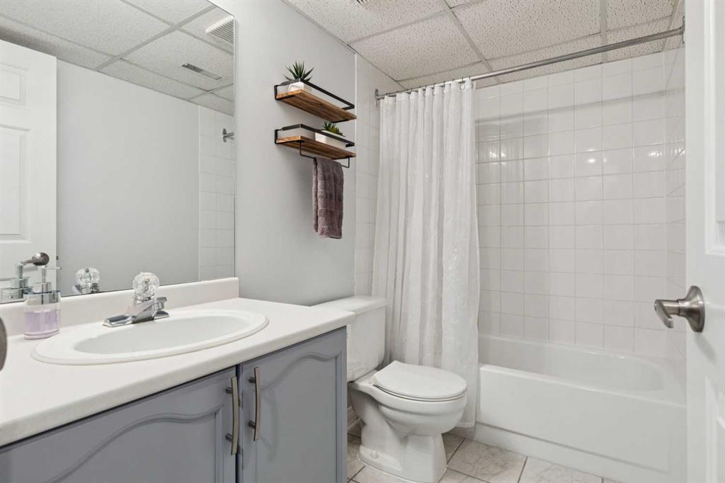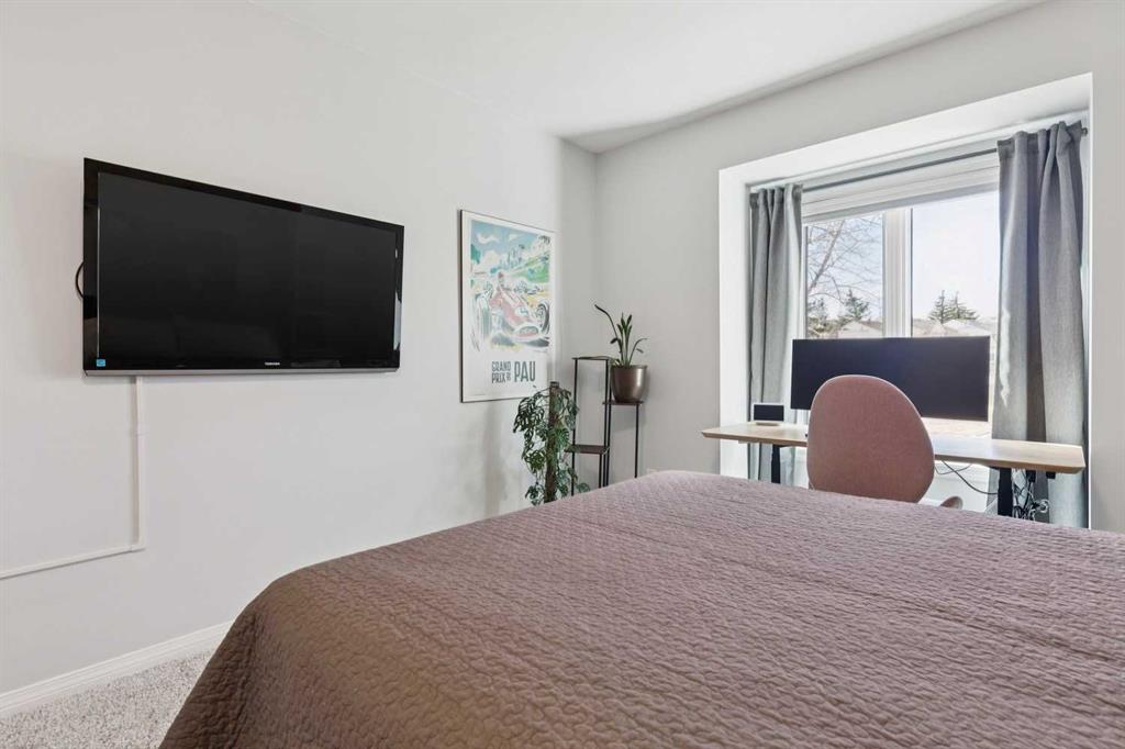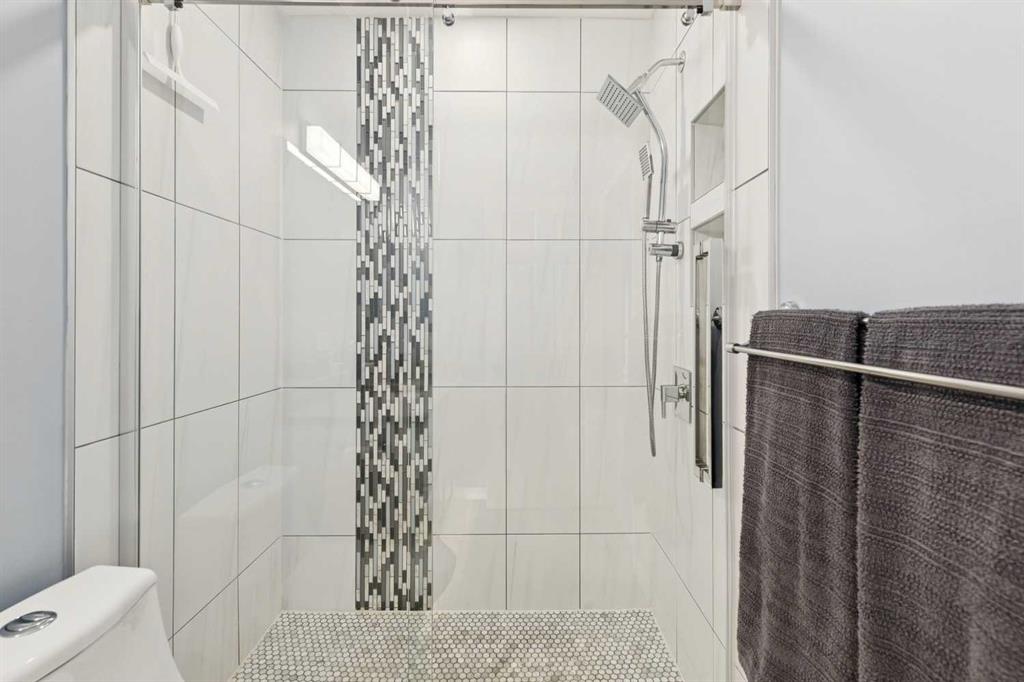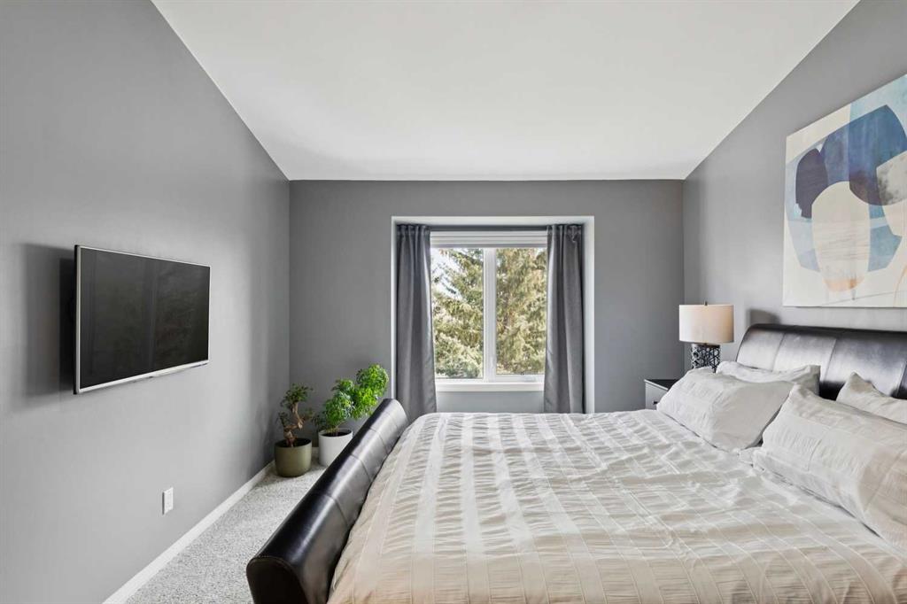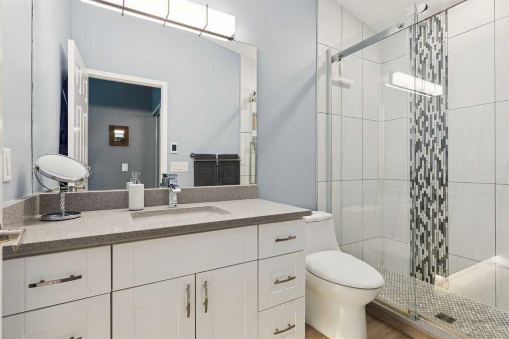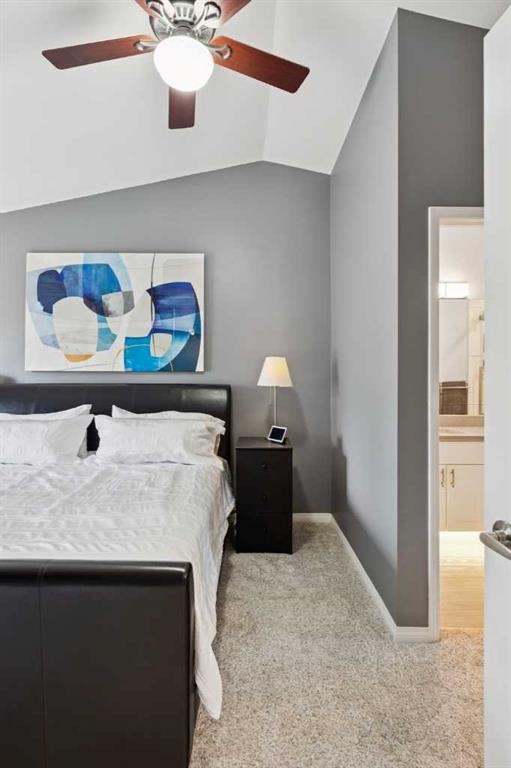 The primary bedroom offers vaulted ceilings, a ceiling fan, day & blackout night honeycomb blinds, and peaceful views of the backyard and pathway. The walk-in closet is fully customized with built-in cabinetry. The ensuite is finished with quartz countertops, under-cabinet lighting, in-floor heating, a high-efficiency toilet, and a walk-in shower with dual shower heads.
