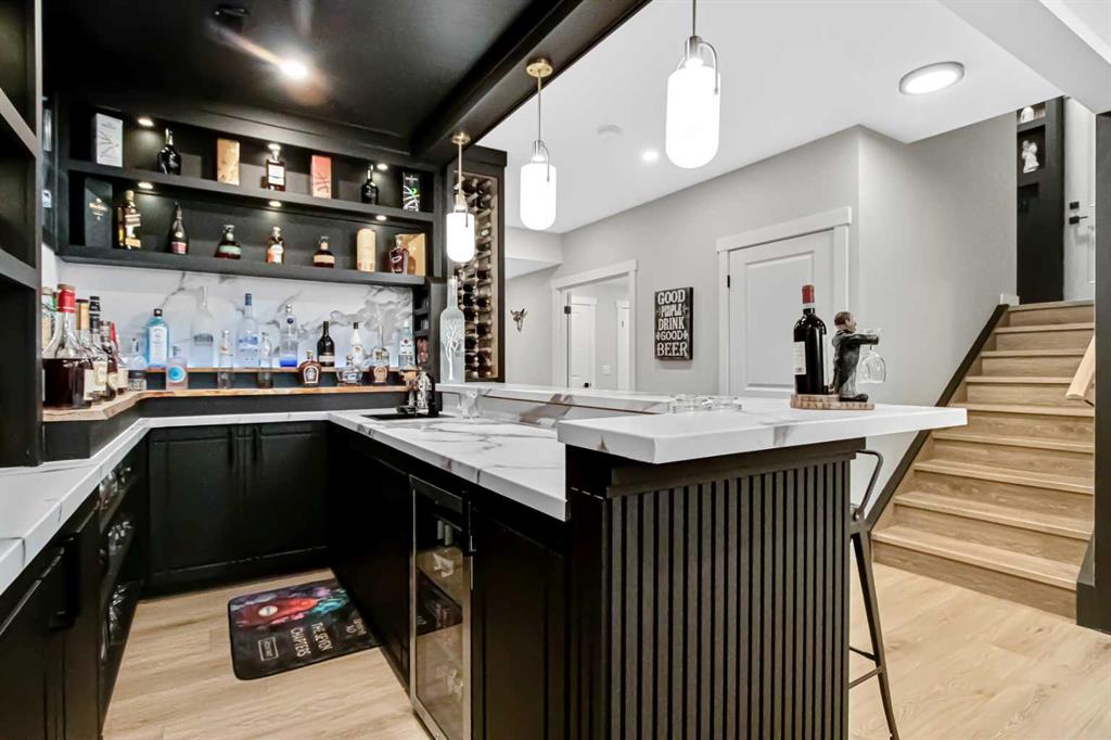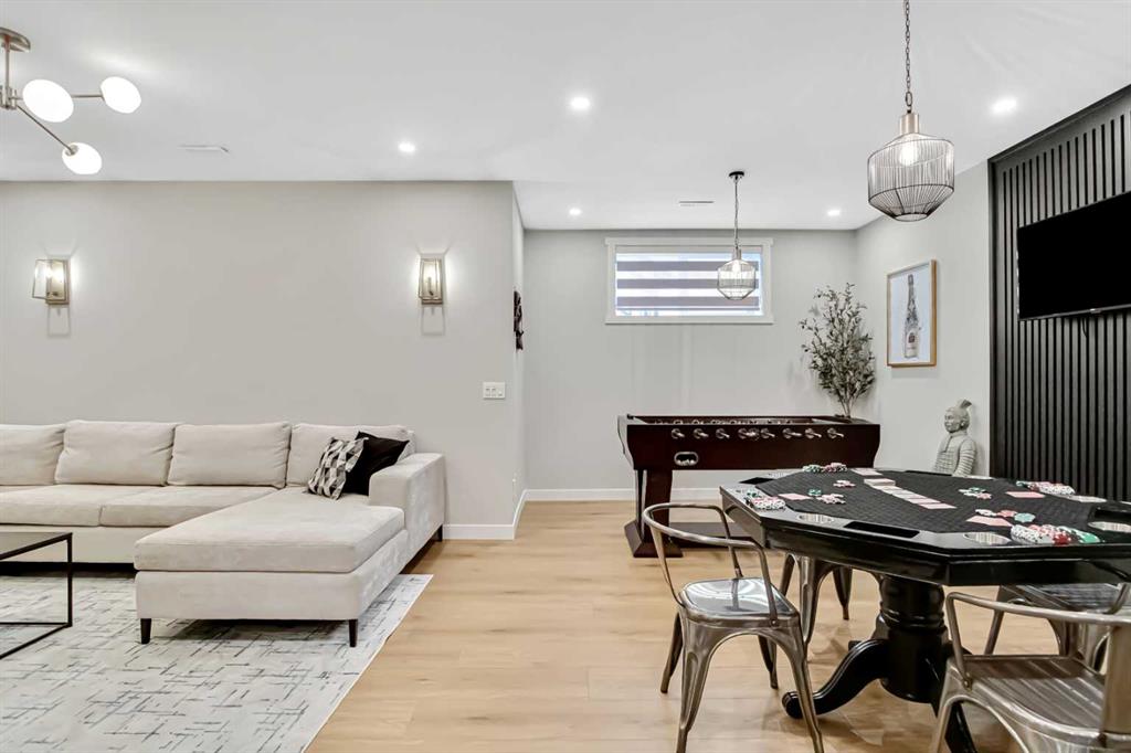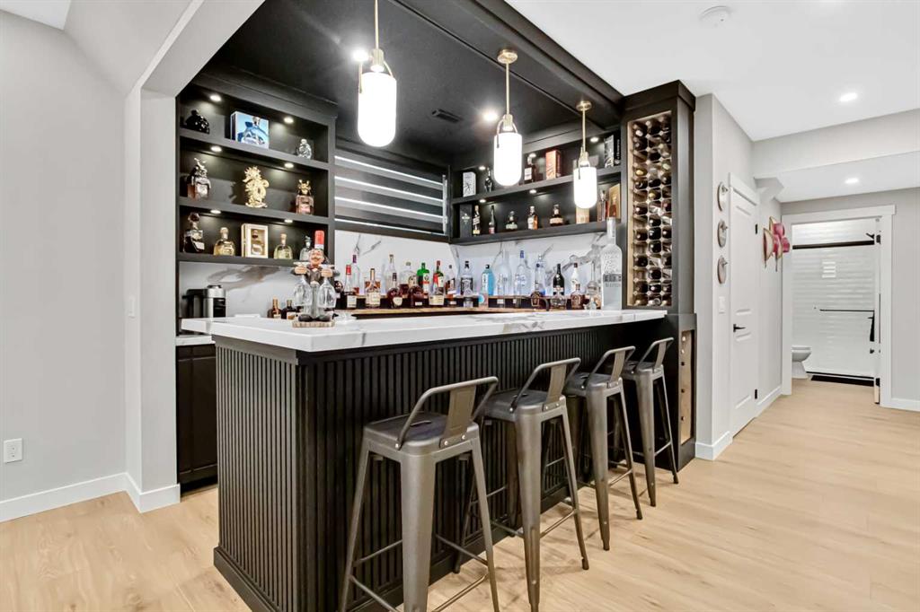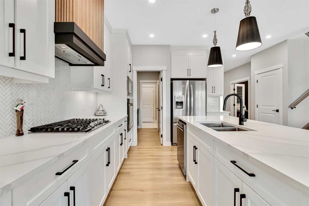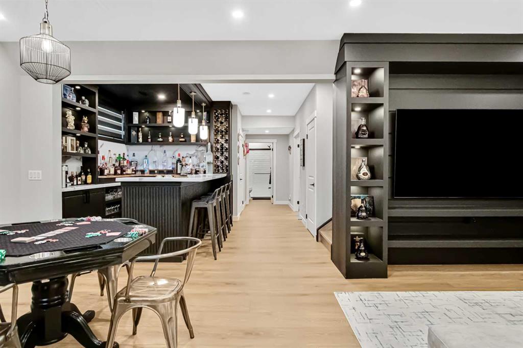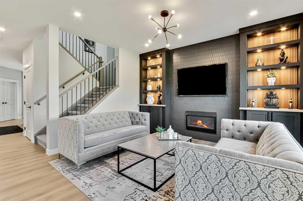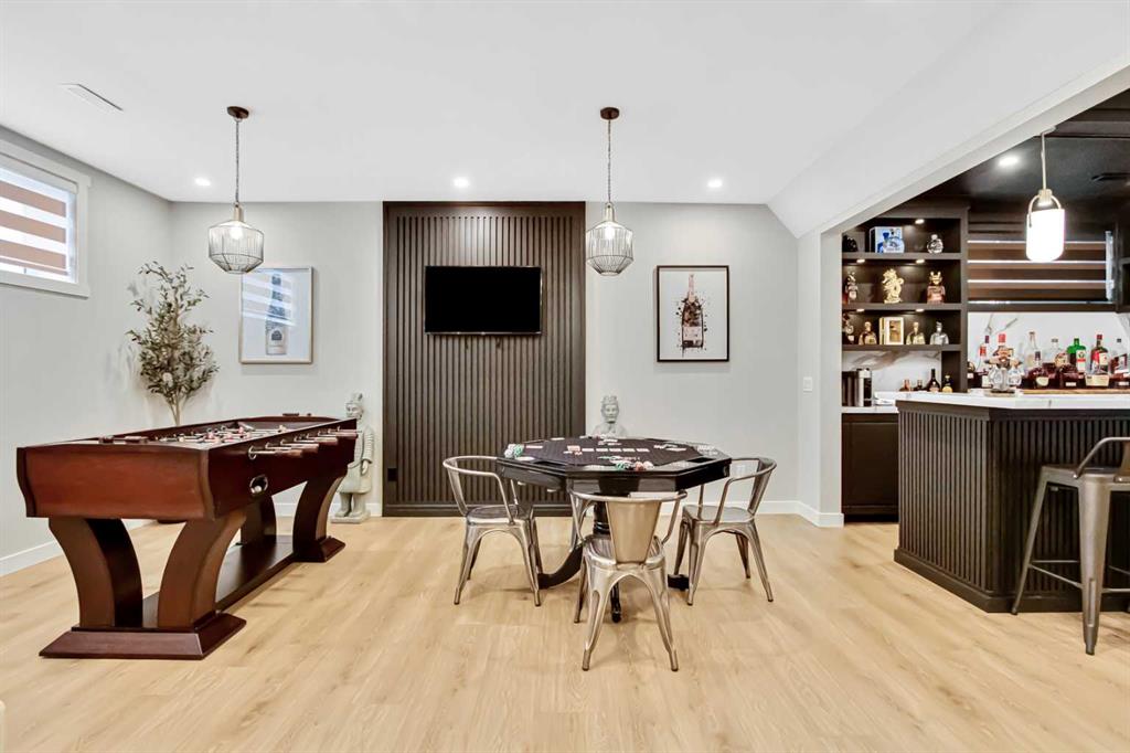 Inside, the main level offers beautifully defined yet connected living zones. A dedicated home office provides quiet focus, while the enclosed flex/media room with French doors is ideal for kids study, gaming, or additional lounge space. The inviting family room with modern fireplace flows seamlessly into the gourmet kitchen - complete with built in appliances, gas cooktop, quartz countertops and a walk through pantry - creating the perfect setting for both daily life and entertaining. Upstairs, the primary suite is a private retreat featuring a spa inspired ensuite with jetted tub, rain head shower and generous walk in closet. Three additional bedrooms provide flexibility for growing families - one with its own private ensuite, while the remaining two share a well appointed full bathroom. A bright bonus room overlooking the pond offers the perfect space for movie nights or relaxed family time, and the upper level laundry room adds everyday convenience. The fully finished basement is designed for entertaining, showcasing a large recreation area, custom wet bar, games space, fifth bedroom, full three piece bathroom and convenient side entrance access - offering versatility for guests or extended family. Additional highlights include custom mudroom built ins, heated garage with epoxy flooring, central air conditioning, water softener and elevated finishes throughout.