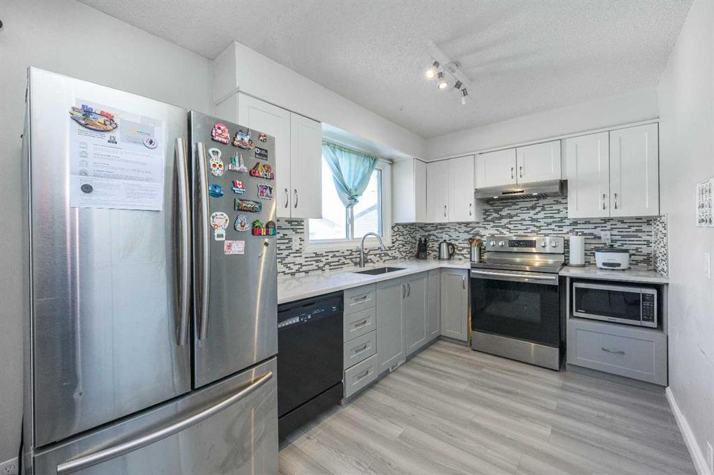 Welcome to this well-maintained 2-storey detached home in the heart of Rundle, perfectly located on a quiet street across from green space and a school. This property offers excellent value for families and investors alike, featuring a finished basement with an illegal suite and multiple recent upgrades. The main floor showcases an upgraded kitchen with quartz countertops and stainless steel appliances (fridge, hood fan, microwave), along with a functional layout, laminate flooring, a 2-piece bath, and access to a large deck with cover—ideal for outdoor enjoyment. The upper level features 3 spacious bedrooms, a 4-piece bathroom, and luxury vinyl flooring throughout. The fully developed basement includes a separate kitchen, 3-piece bathroom, and bright living space with large windows, making it ideal for extended family or rental potential. Additional highlights include shared washer & dryer, new furnace (2023), newer hot water tank, and partial roof replacement (2025). Outside, enjoy a single oversized detached garage, paved back alley access, and a private backyard setup. Conveniently located close to schools, parks, LRT, public transit, and shopping, this is a fantastic opportunity in a well-established NE Calgary community.